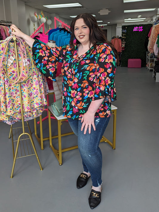 Bell Slv Top Black Floral (S-3X)