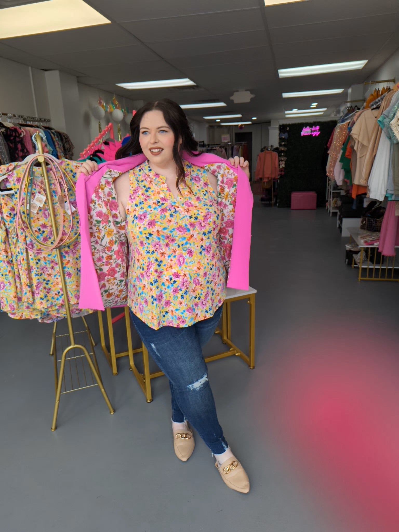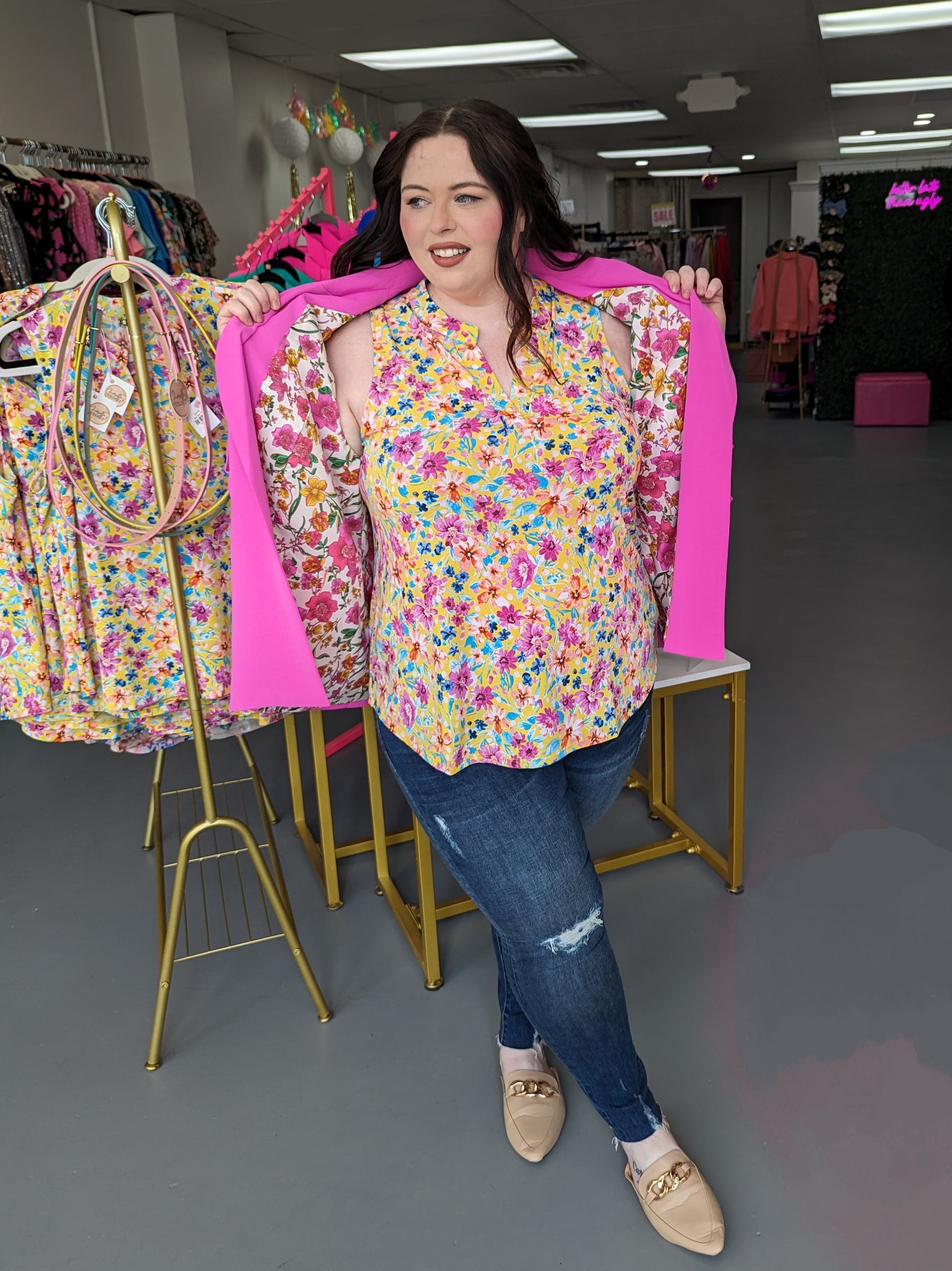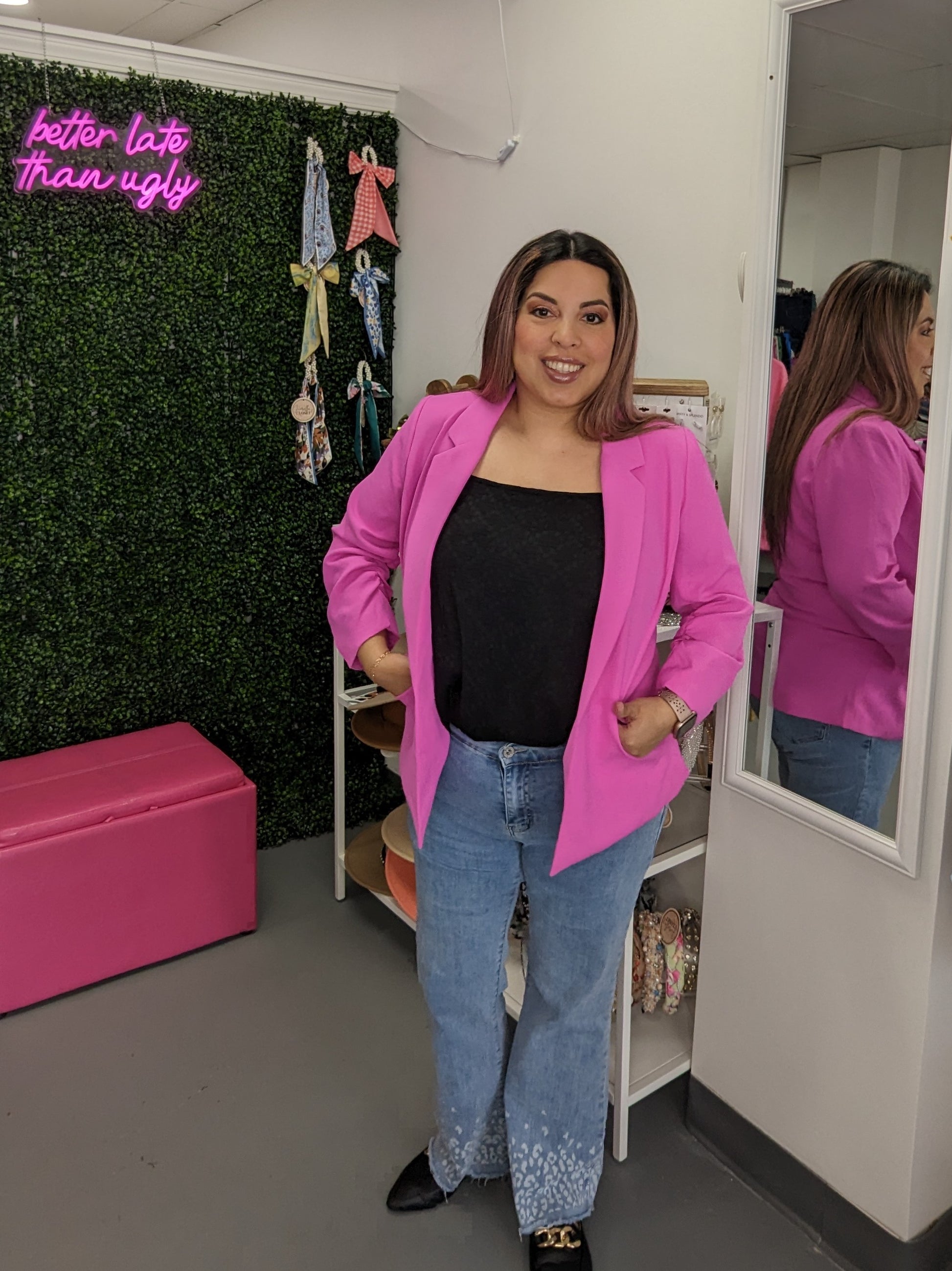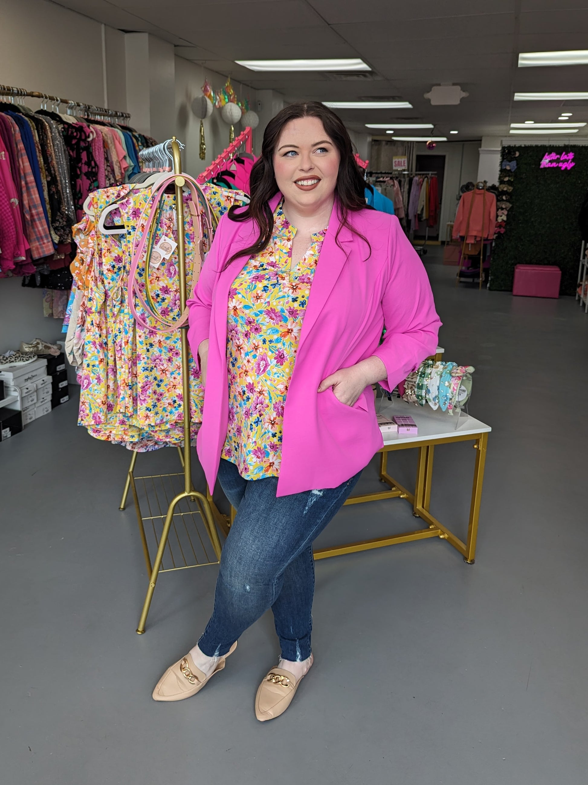 Empower your wardrobe with our Orchid 3/4 Sleeve Blazer! Lightweight and versatile, it features shirred sleeves, pockets, and a fun lining. Available in sizes XS to 3X, it effortlessly elevates your office, happy hour, and brunch looks!