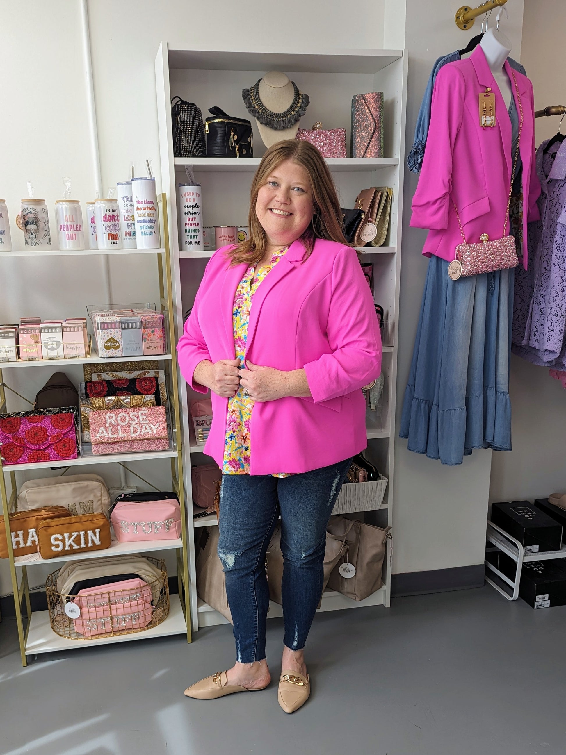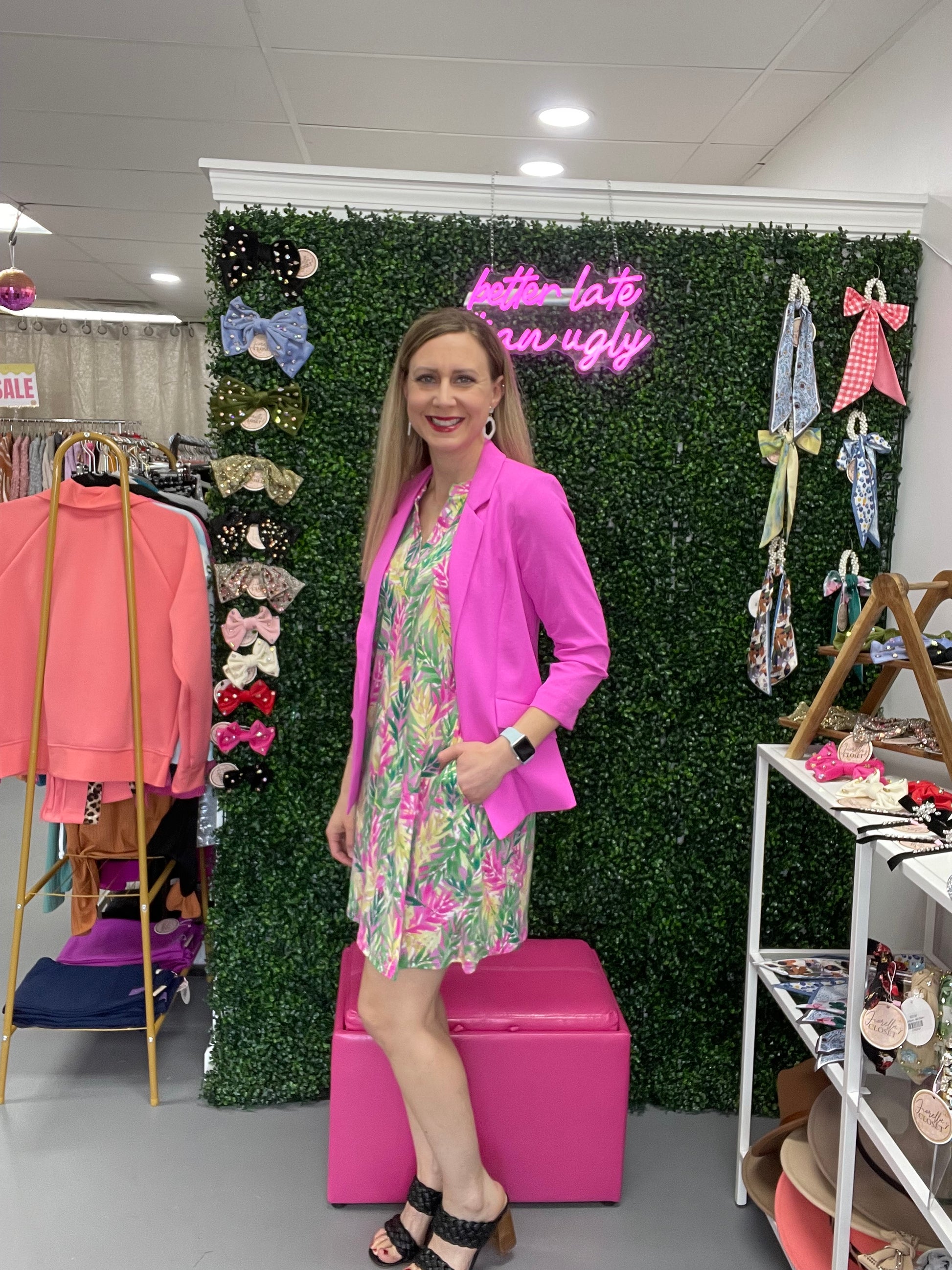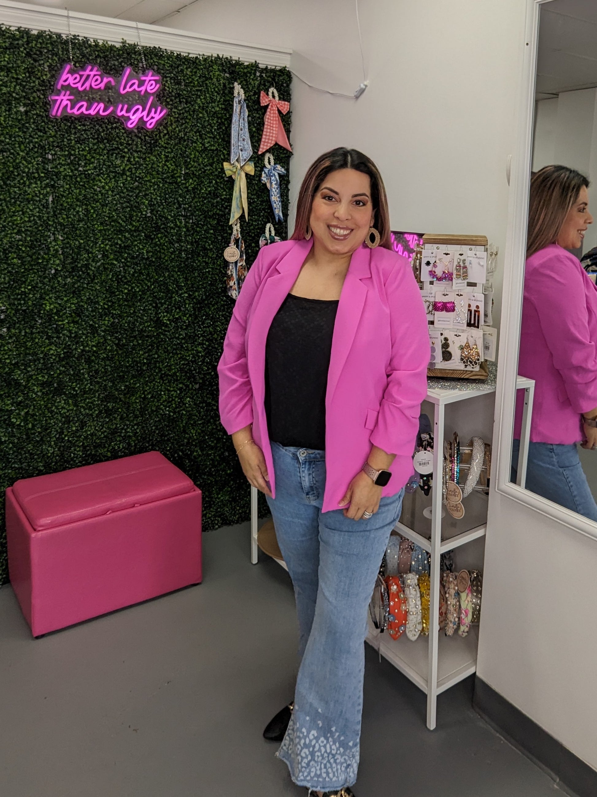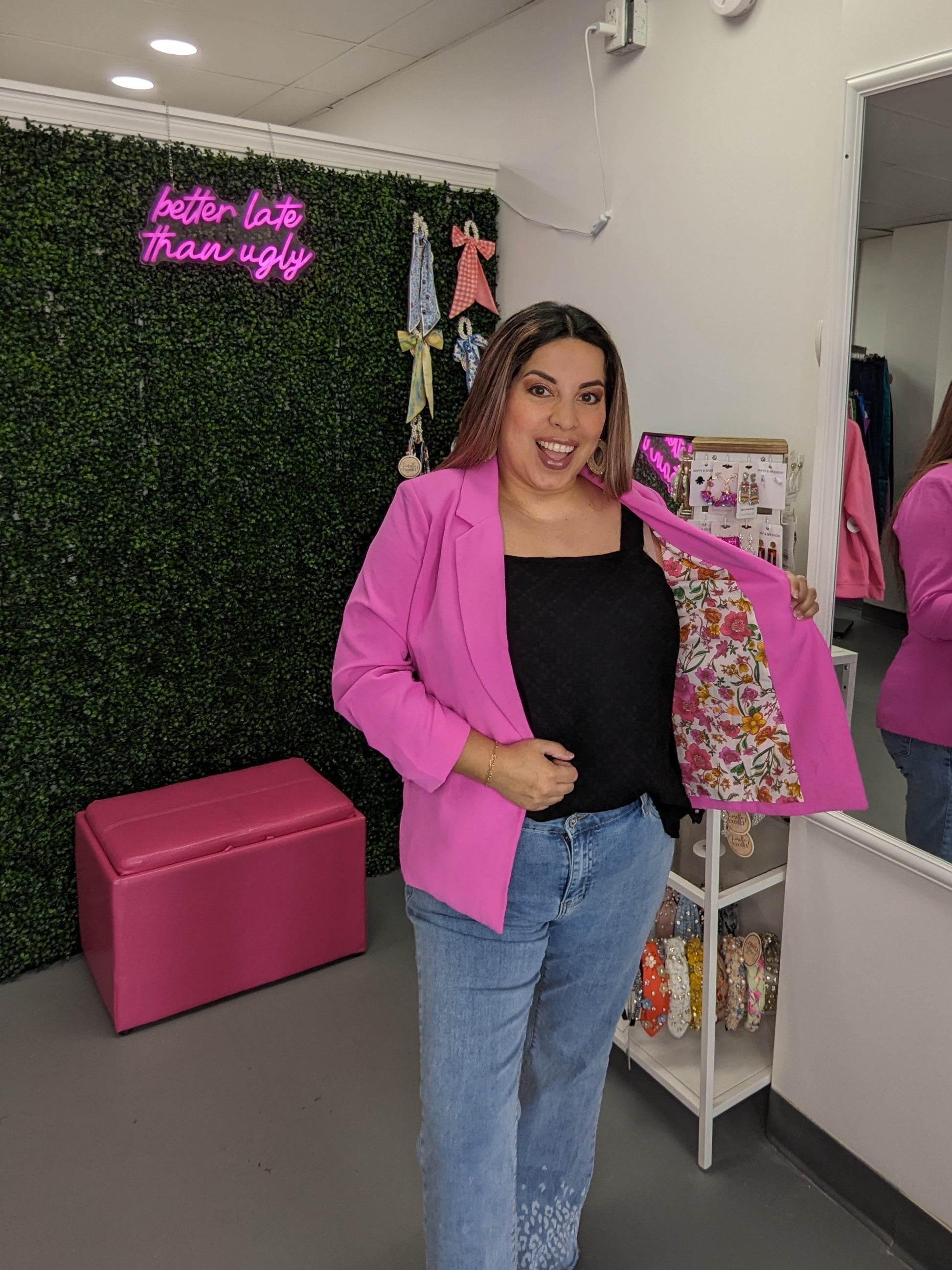 Empower your wardrobe with our Orchid 3/4 Sleeve Blazer! Lightweight and versatile, it features shirred sleeves, pockets, and a fun lining. Available in sizes XS to 3X, it effortlessly elevates your office, happy hour, and brunch looks!