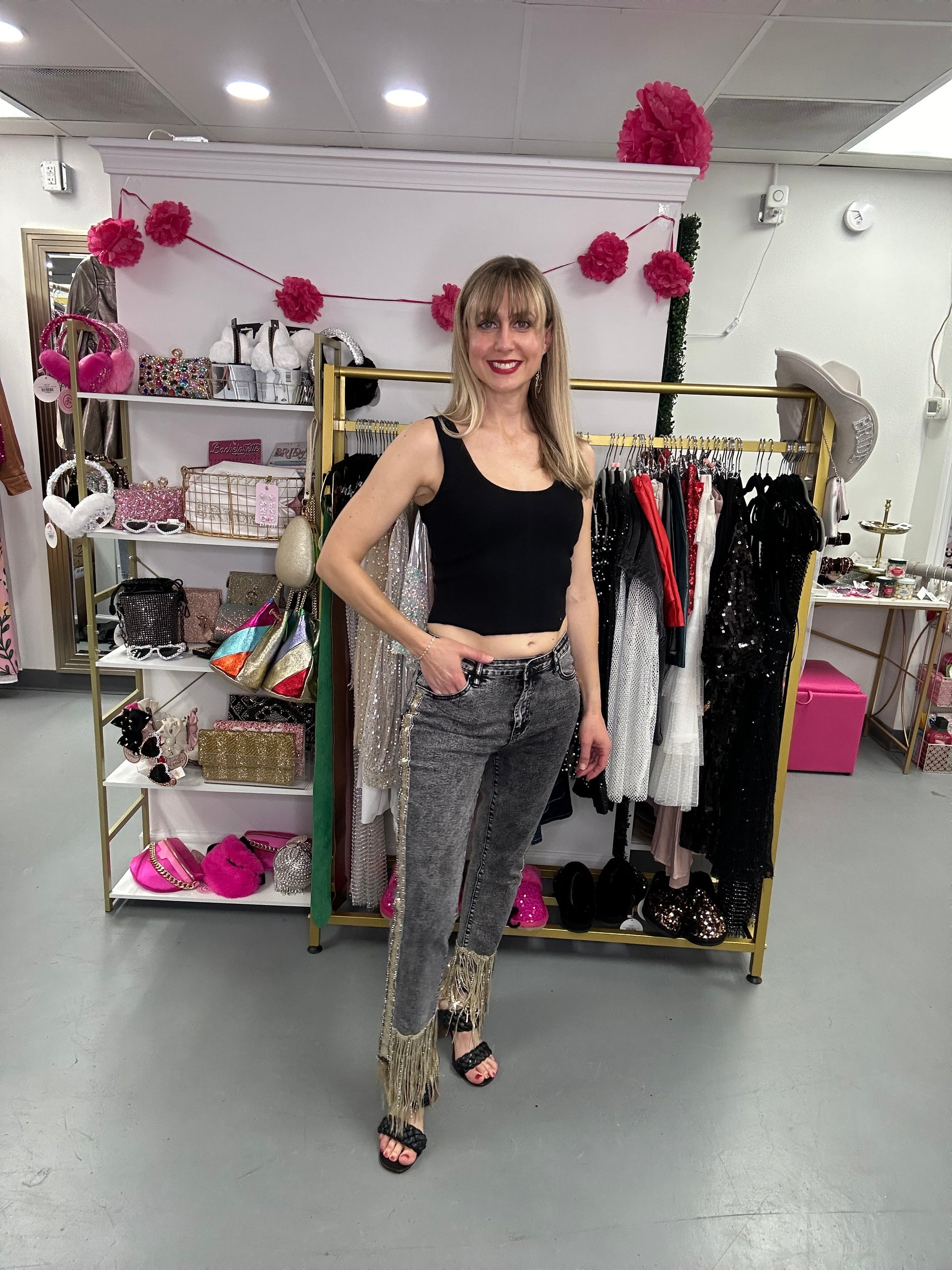Be bold and shimmer in these Side Sequin Fringe Jeans! The garment washed stretch denim provides a comfortable fit, while the tiered bottom with gold fringe adds a touch of glamour. Perfect for a night out, these ankle length jeans will make you stand out in any crowd.