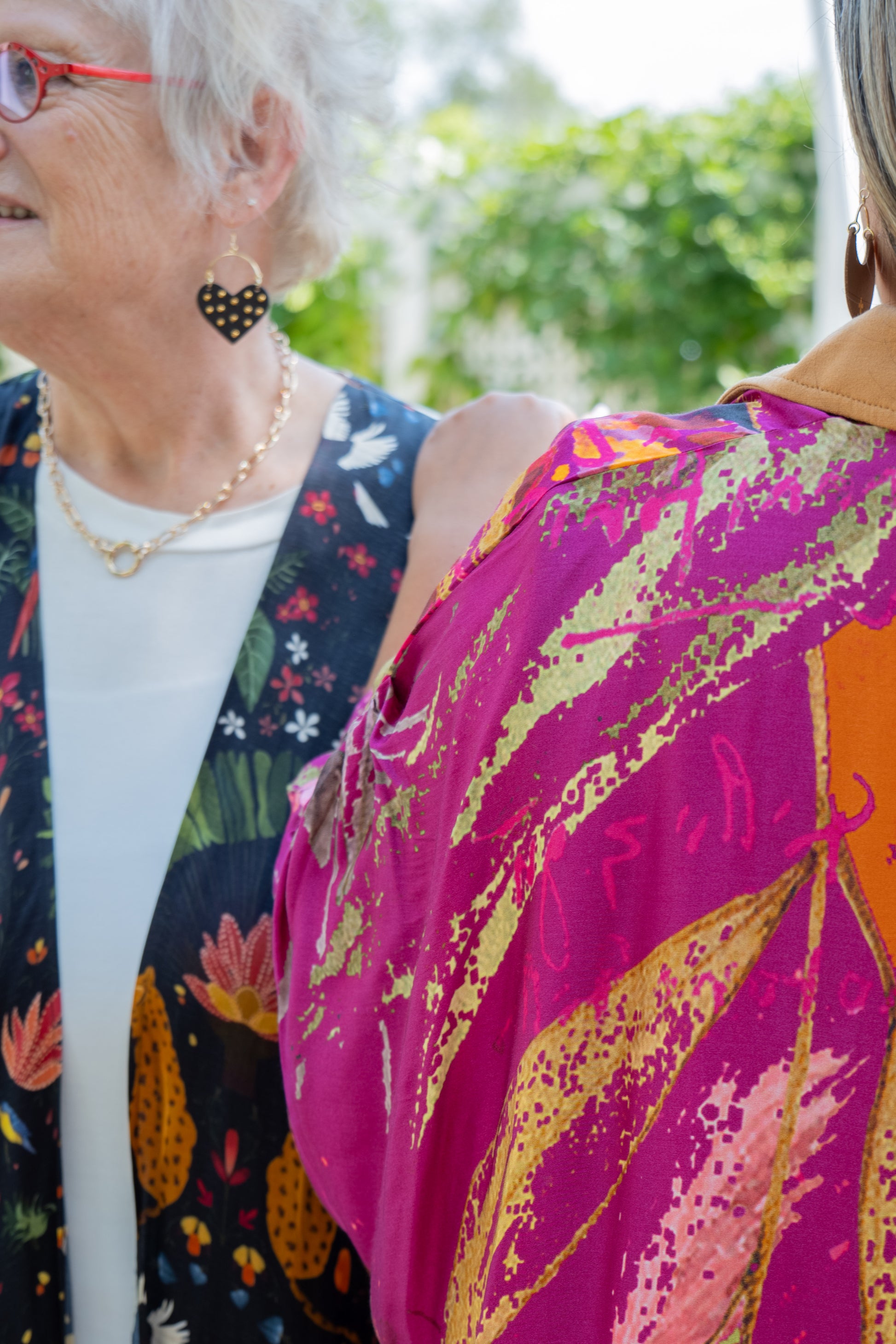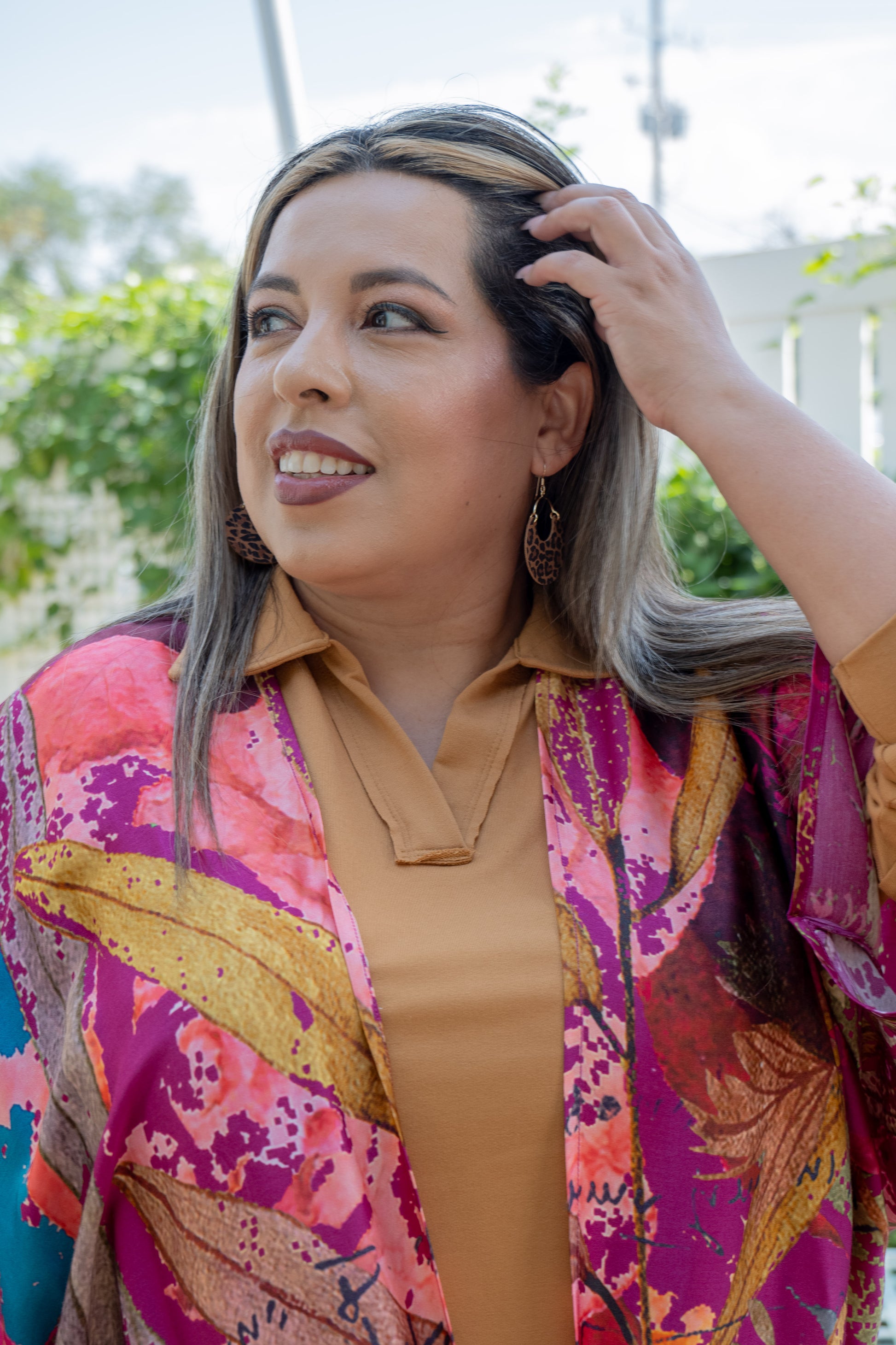 Add an unexpected pop of color to your fall wardrobe with this vibrant abstract-print kimono! The rich magenta base is splashed with earthy greens, orange, and gold tones—making it the ultimate statement layer for transitional weather.