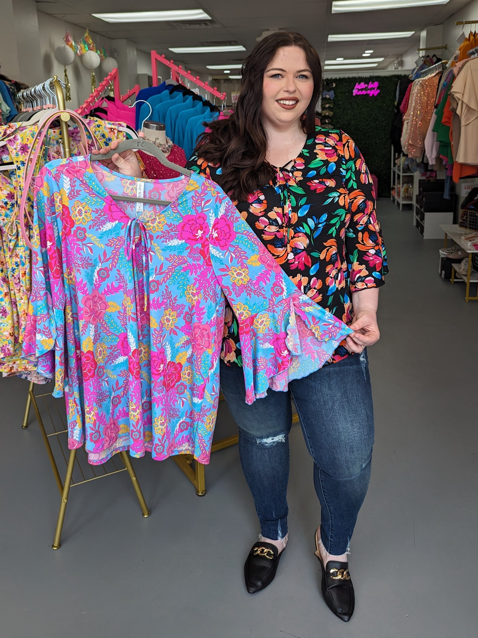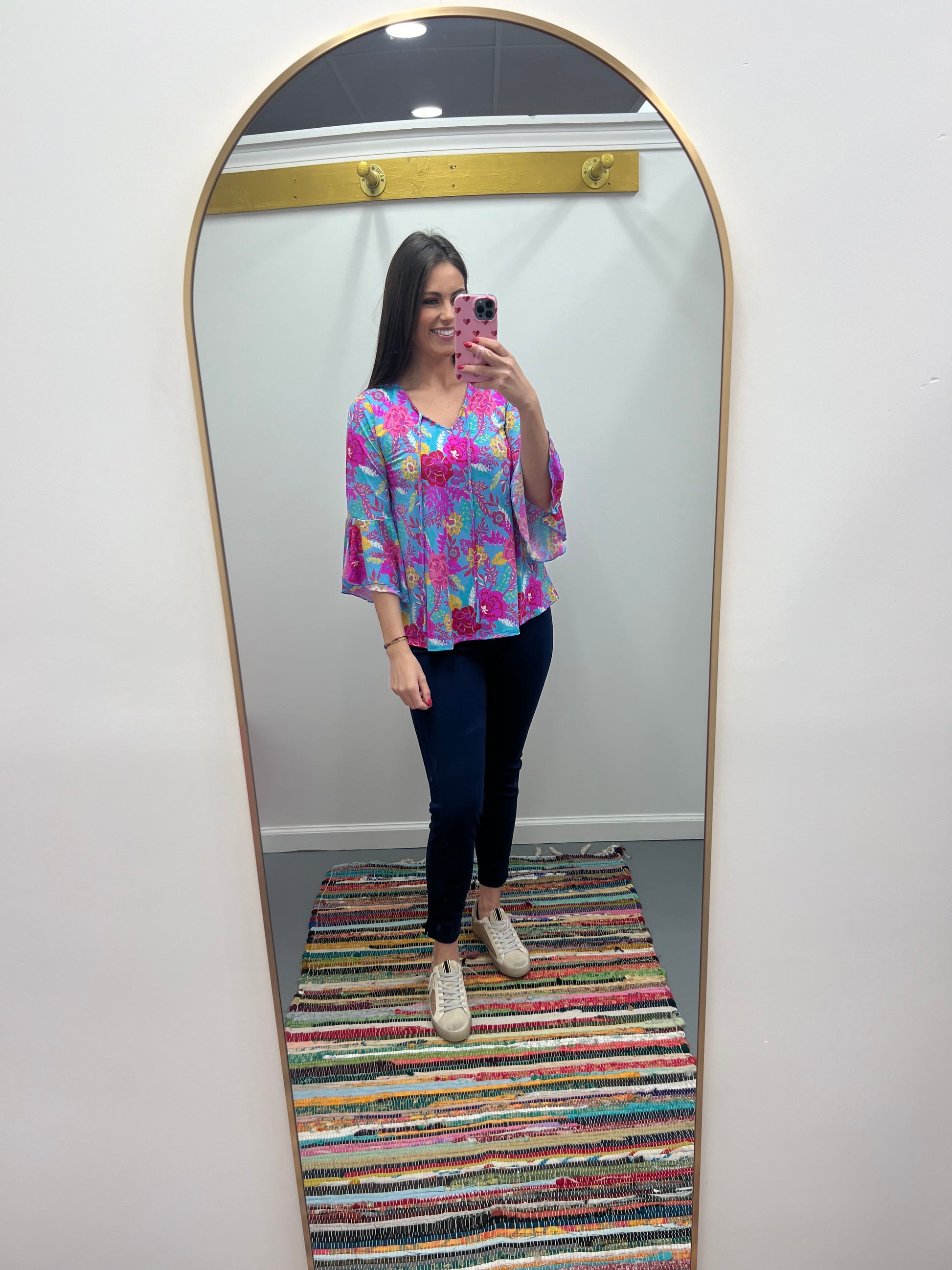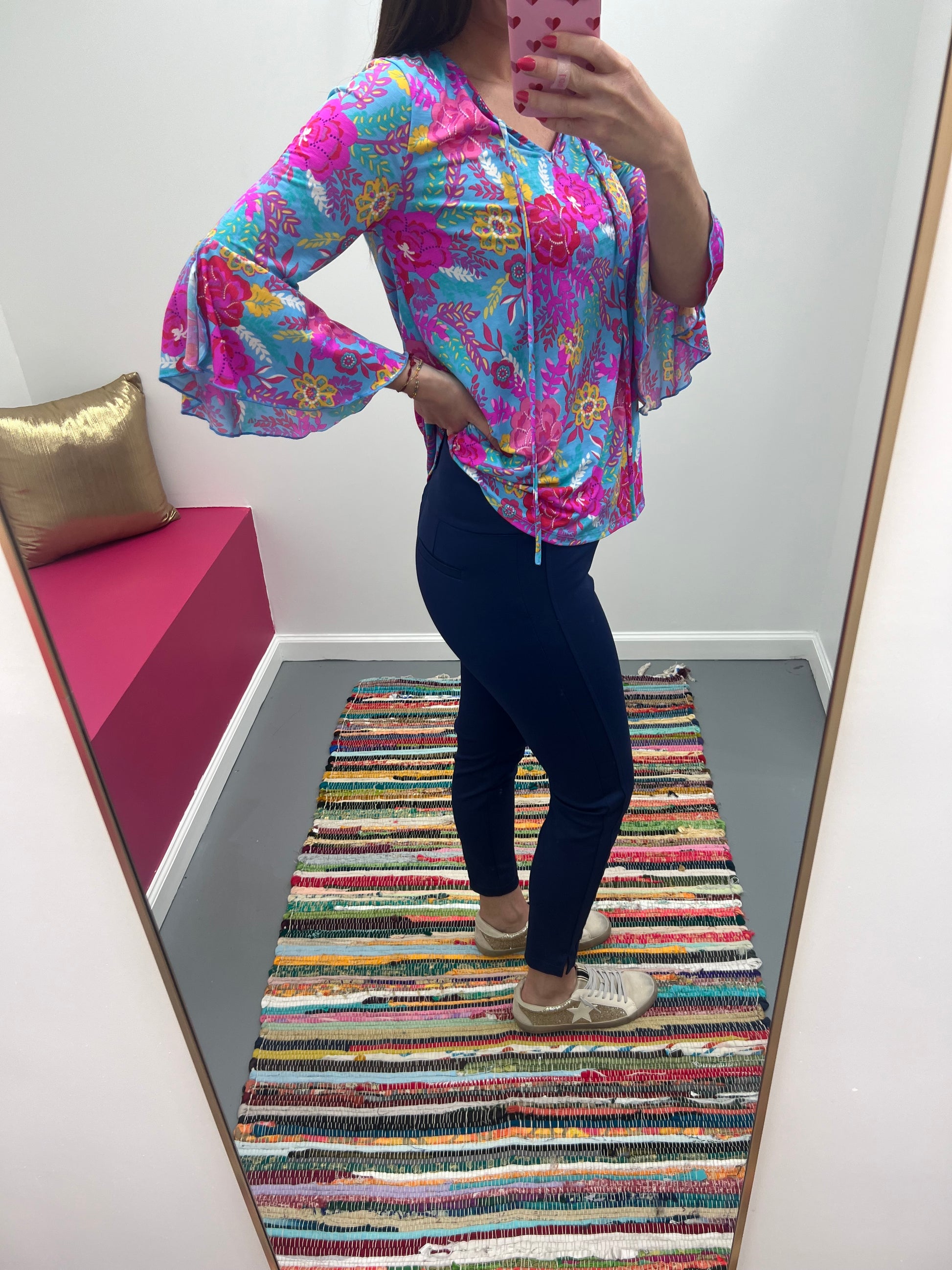 Experience effortless style and comfort with our Bell Slv Top Ocean Floral. The v neckline with tie and waterfall bell sleeves add a touch of elegance to this relaxed fit tunic. Perfect for travel, this top is made from a wrinkle-free stretchy knit material. Stay chic and comfortable on the go!