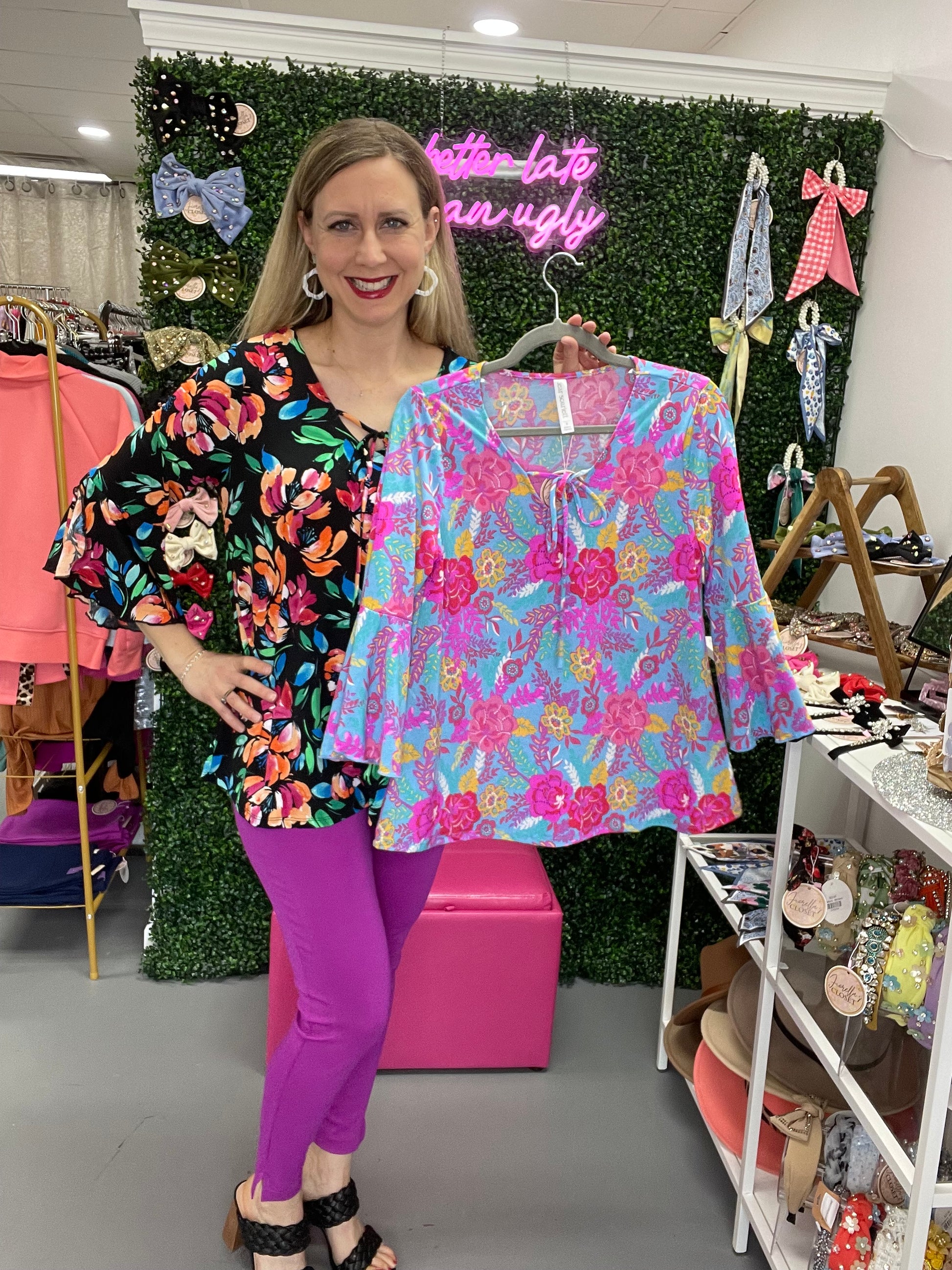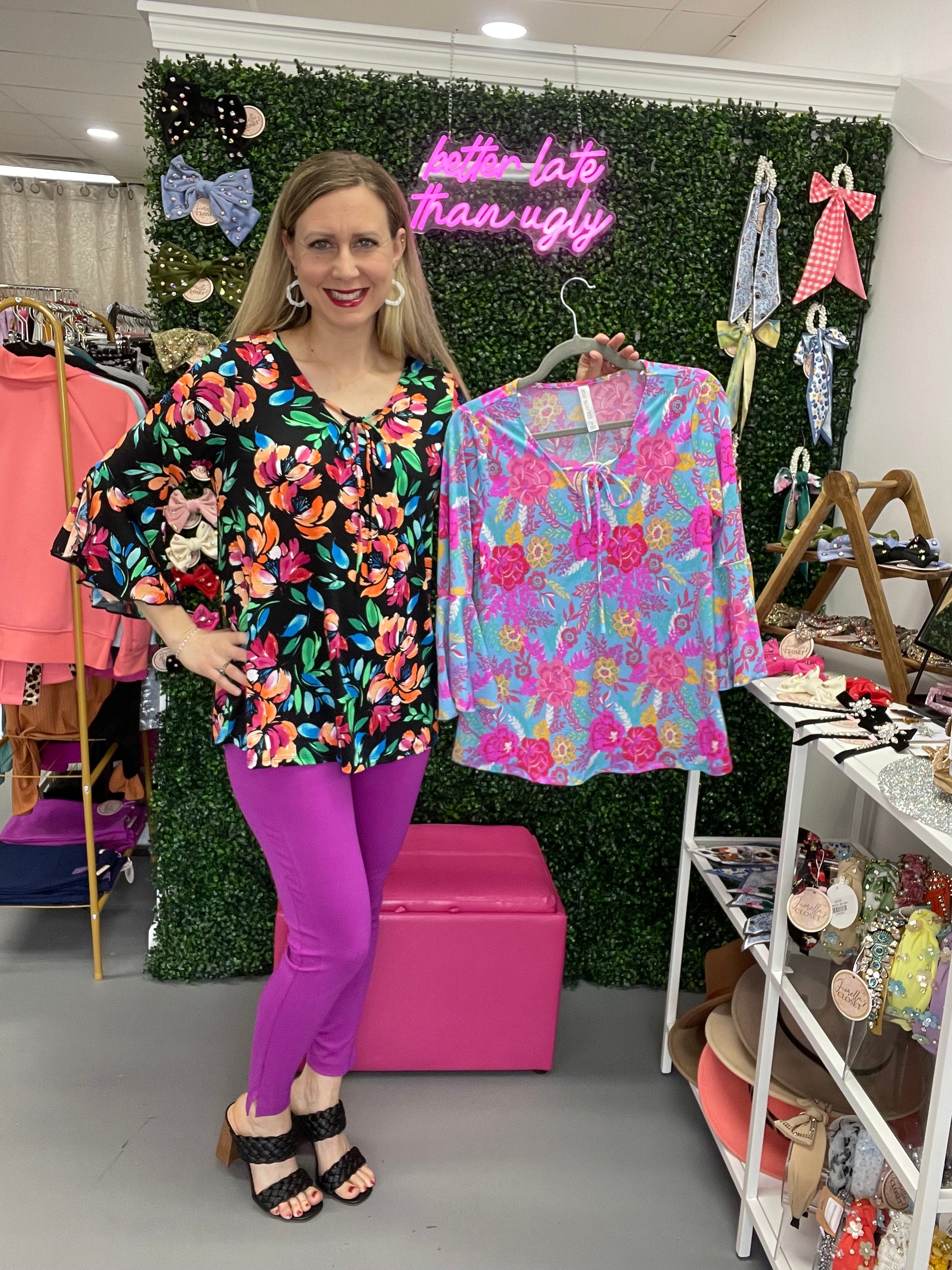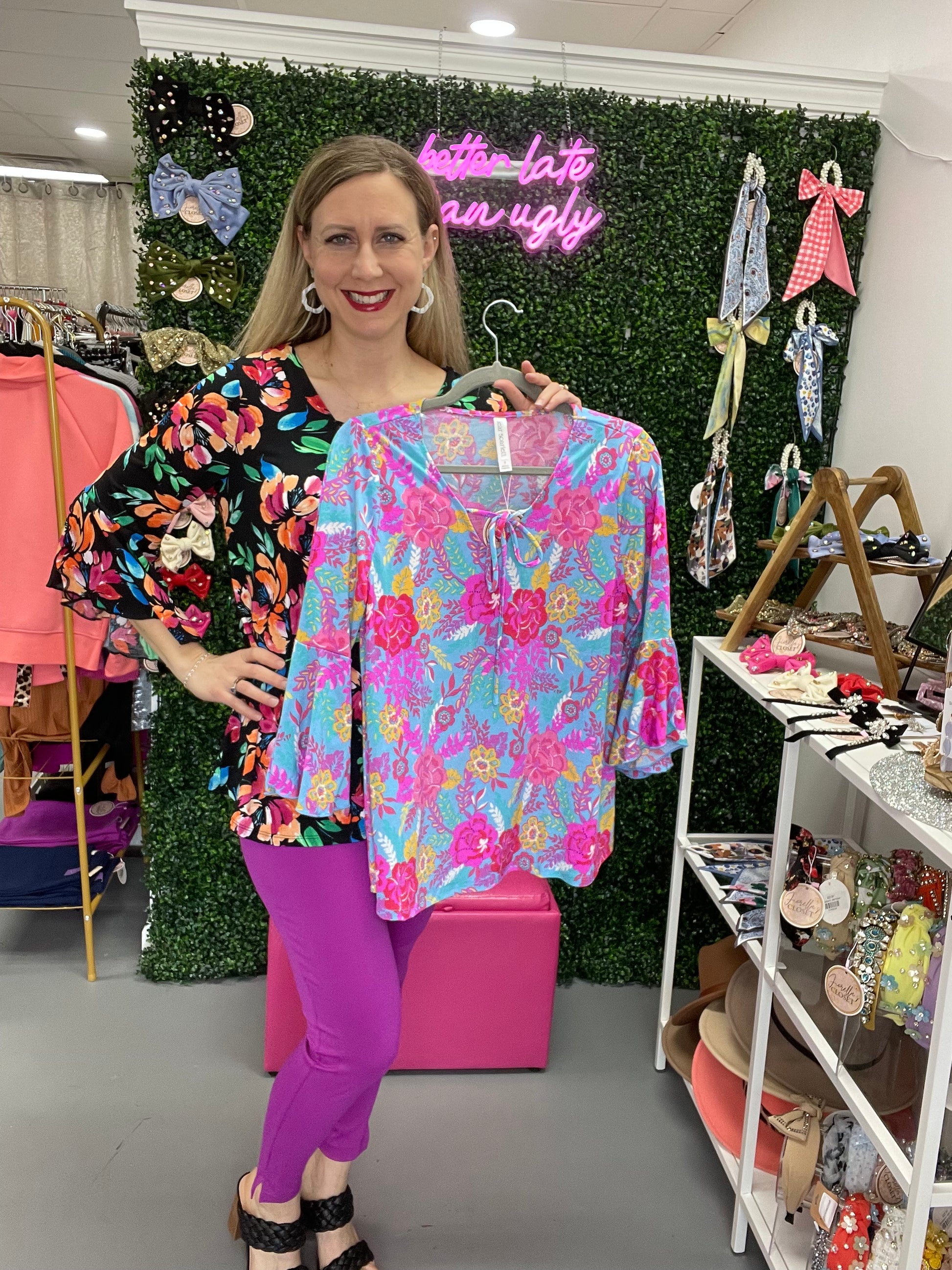 Experience effortless style and comfort with our Bell Slv Top Ocean Floral. The v neckline with tie and waterfall bell sleeves add a touch of elegance to this relaxed fit tunic. Perfect for travel, this top is made from a wrinkle-free stretchy knit material. Stay chic and comfortable on the go!