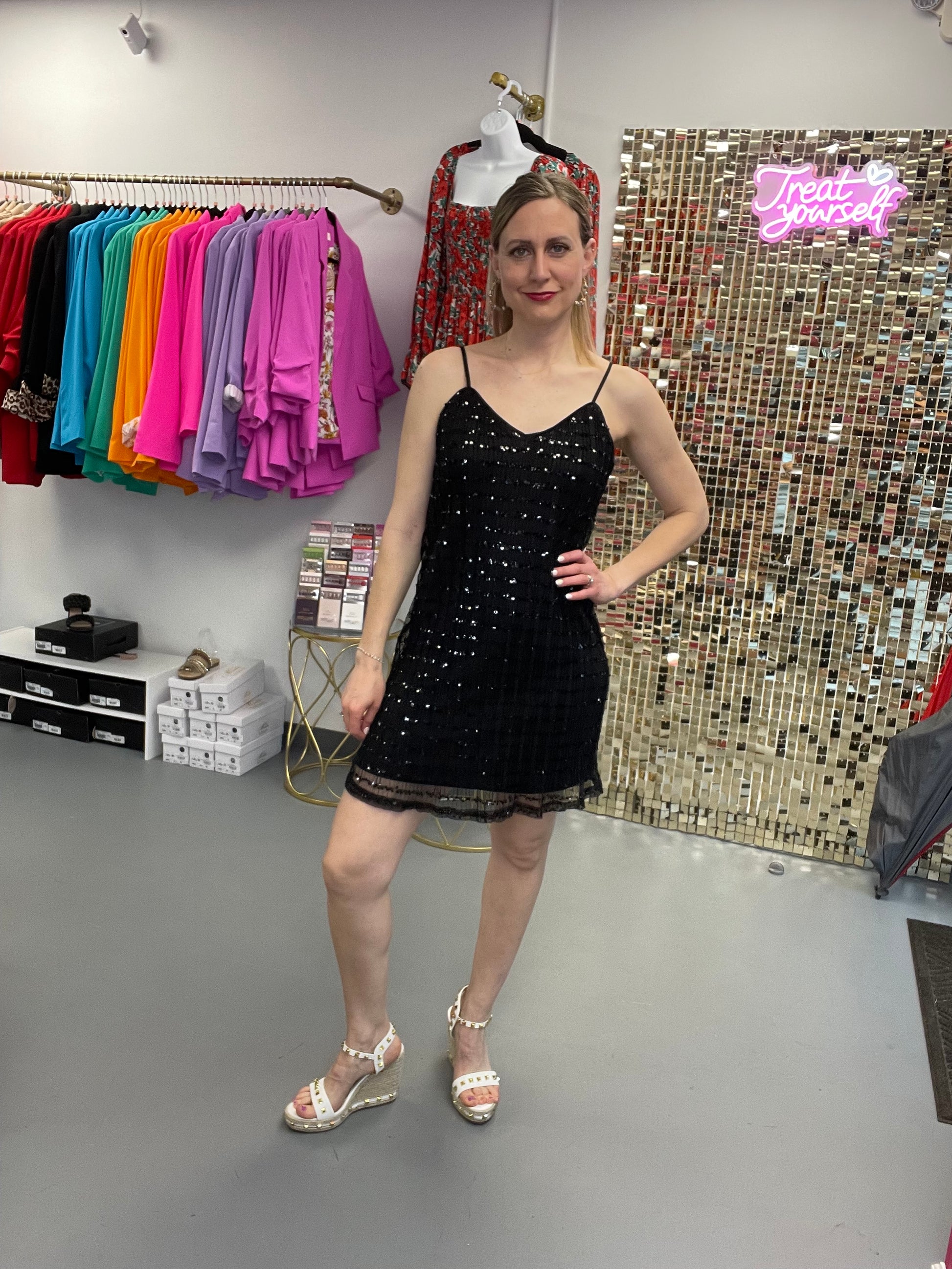 Shine your way into any event with this stunning Black Sequin Cami Dress. Fully lined for comfort and designed with a lightweight, flowy silhouette, this dress moves beautifully and feels just as good as it looks. The adjustable cami straps and relaxed fit make it an easy, breathable option for parties, date nights, or any moment that calls for a little sparkle.