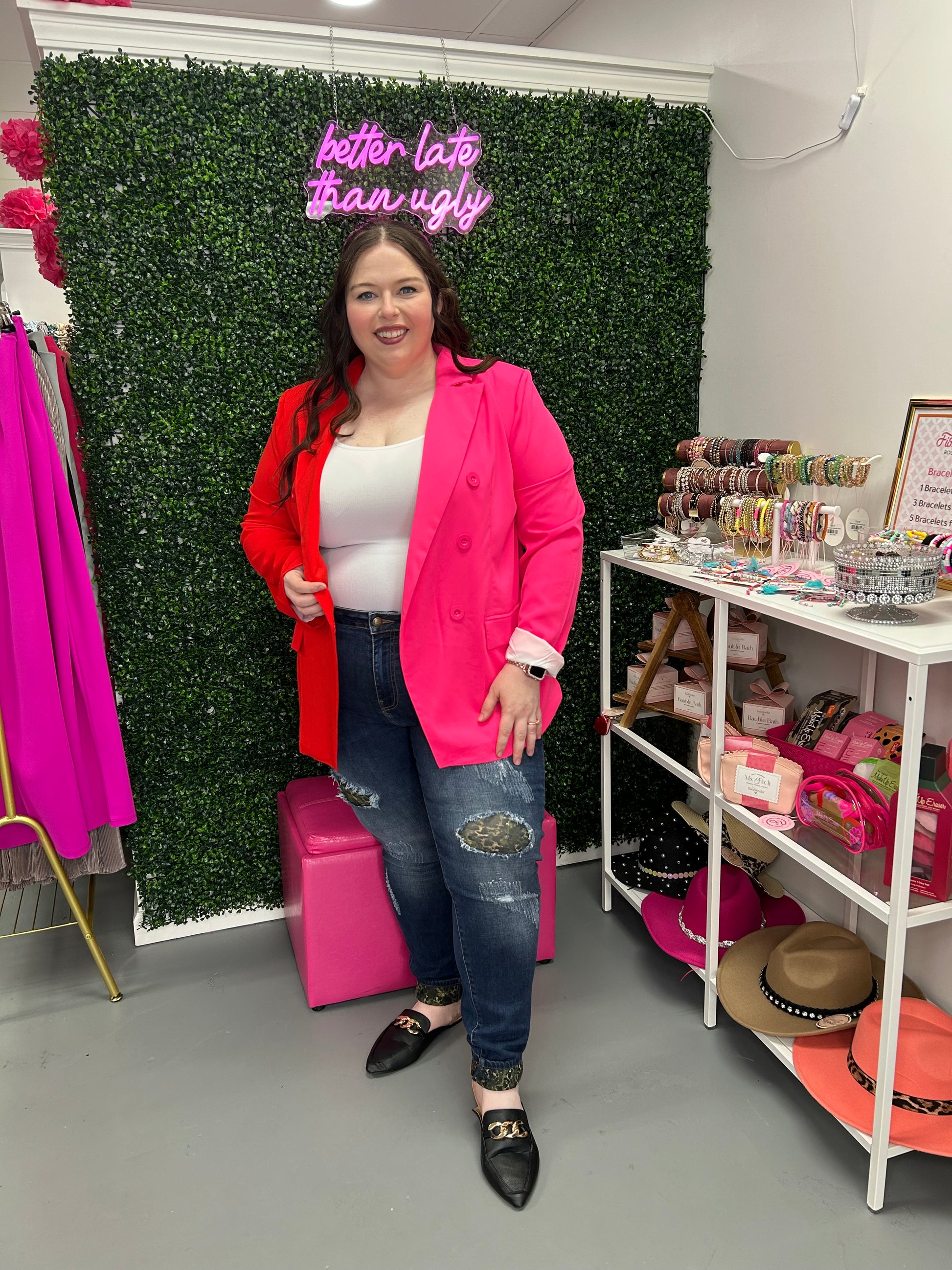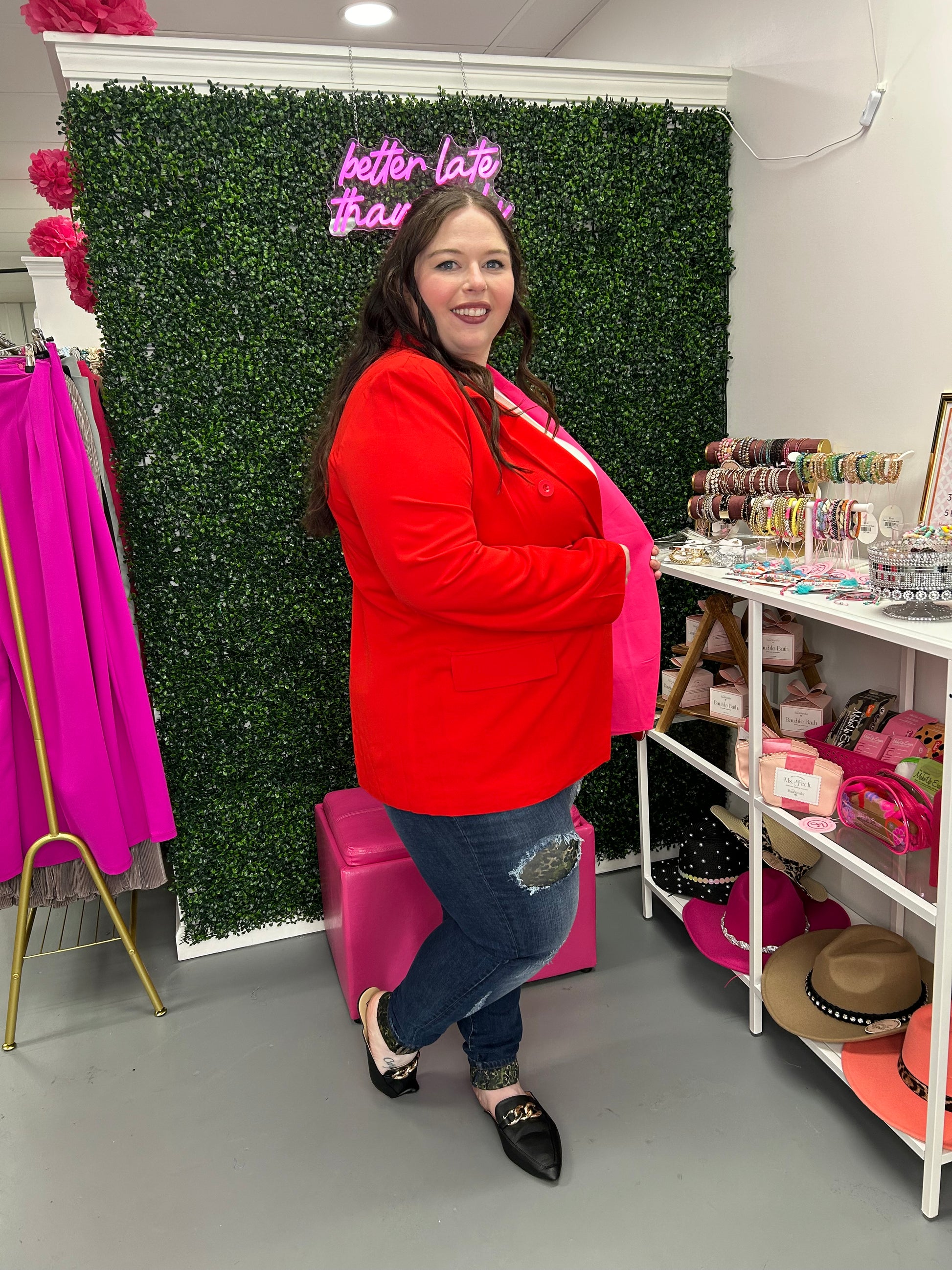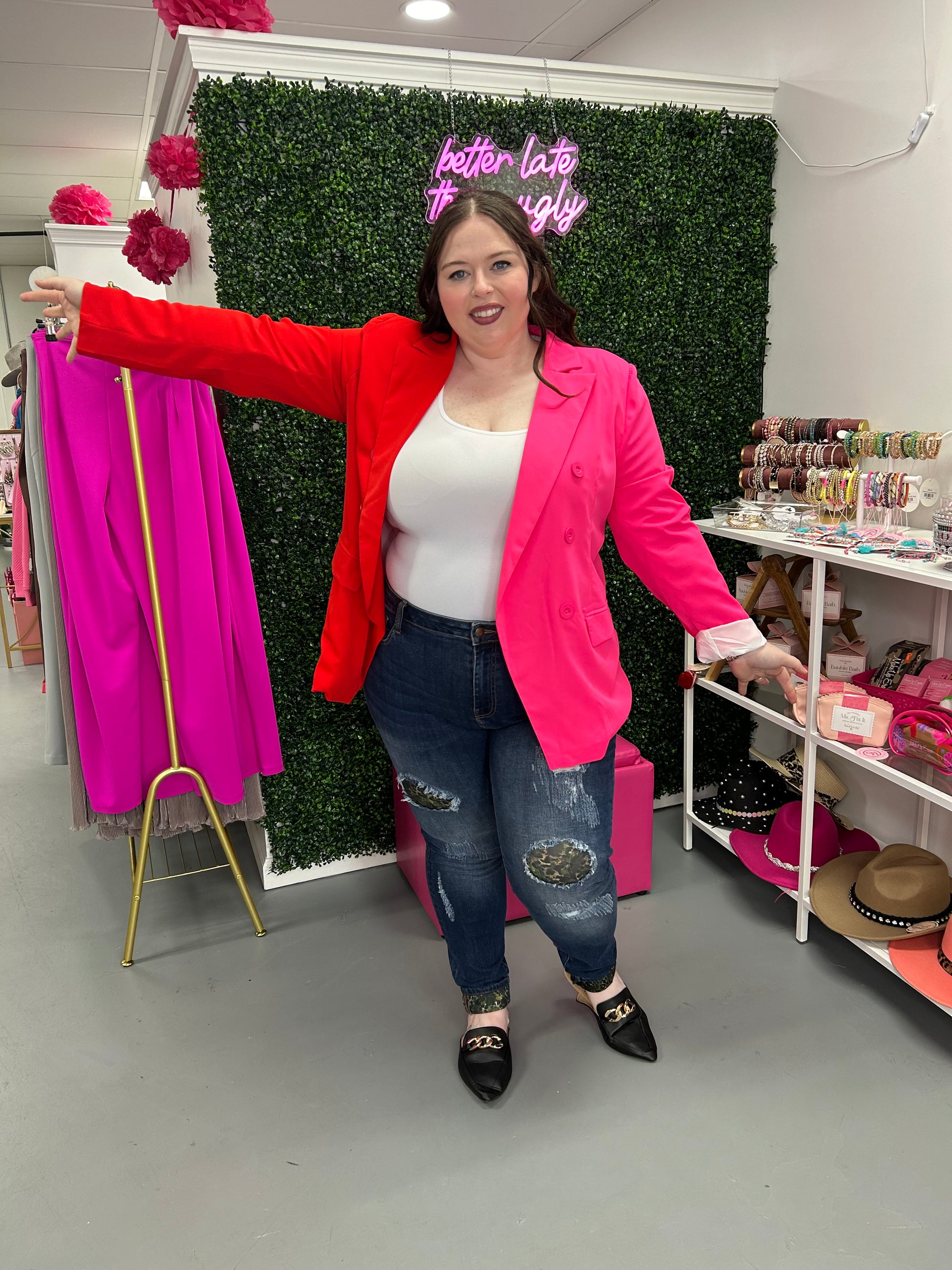 Be bold and make a statement with the Bold Moves Blazer! This unique garment boasts a vibrant two-tone design in pink and red, perfect for those who aren't afraid to stand out. With this blazer, you'll be setting your own style standards and showing off your confident, daring personality!