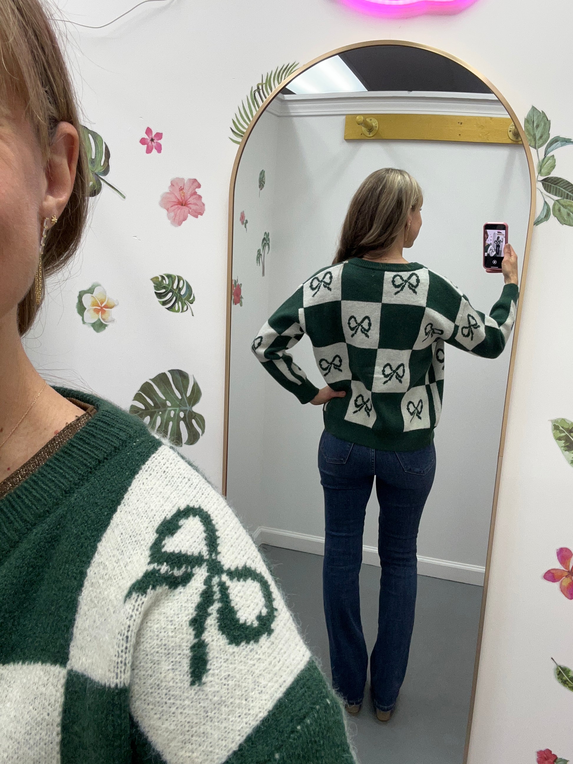 Bring a little charm and personality to your wardrobe with our Checkered Bow Cardigan. This cozy knit features an adorable bow-and-check pattern that blends playful style with everyday comfort. Soft, warm, and easy to layer, it’s the perfect statement cardigan for jeans, leggings, or over your favorite basics.