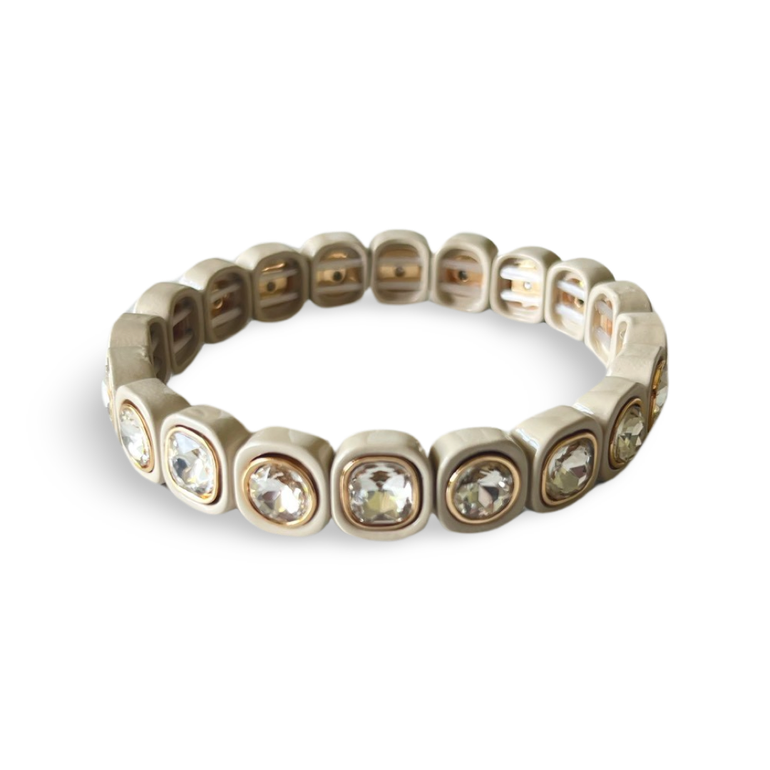 Petite, alternating acrylic jewel stretch bracelet. Adjusts to fit wrist with elastic band. Gold detail finish.