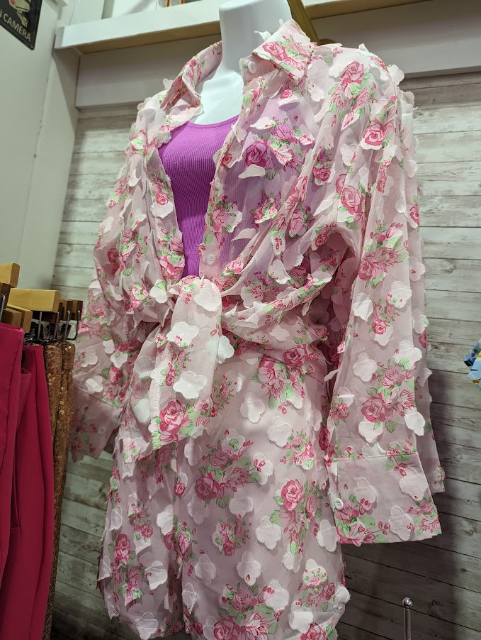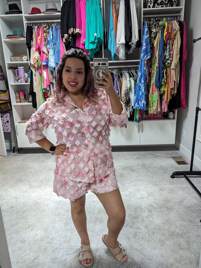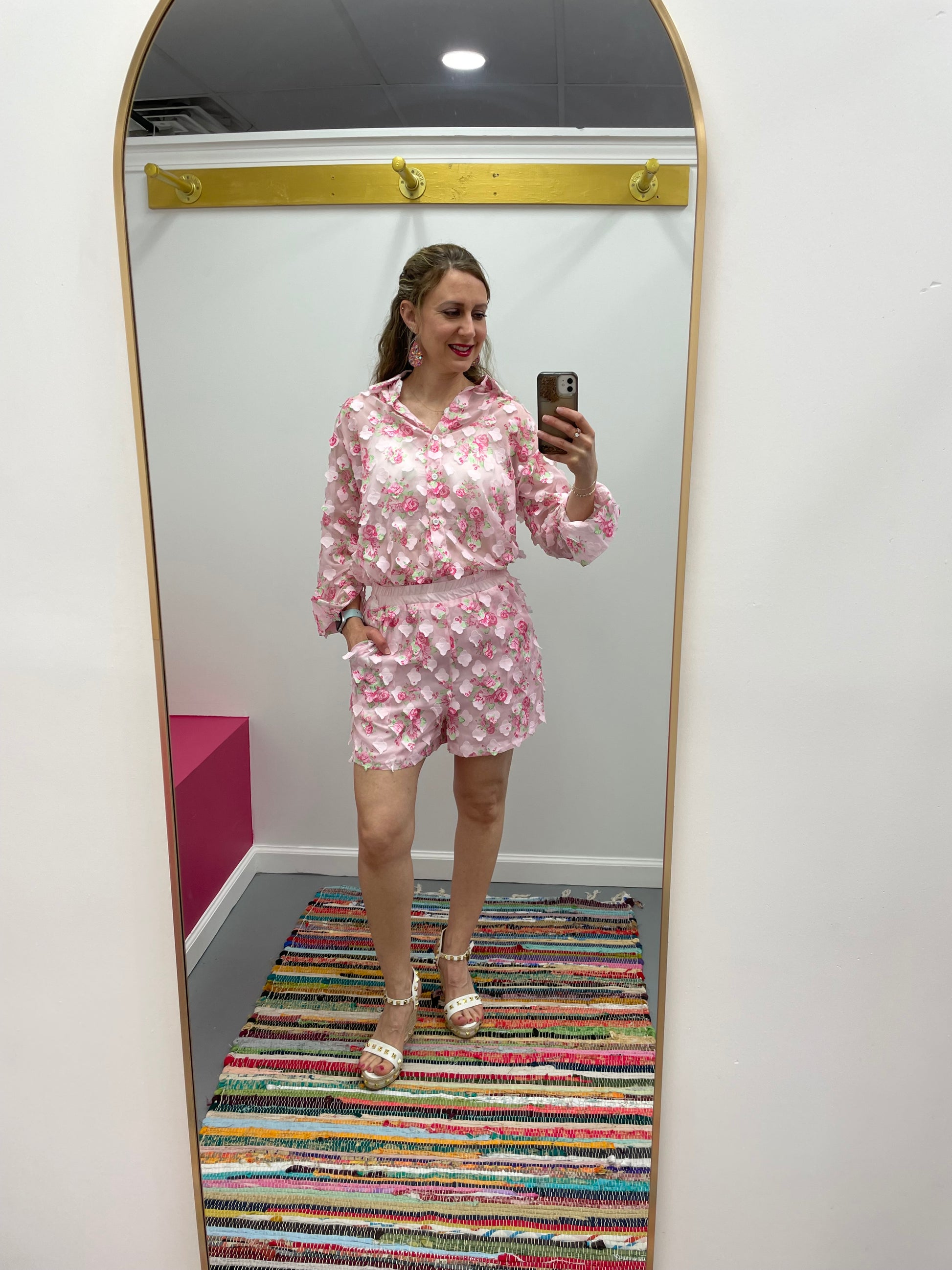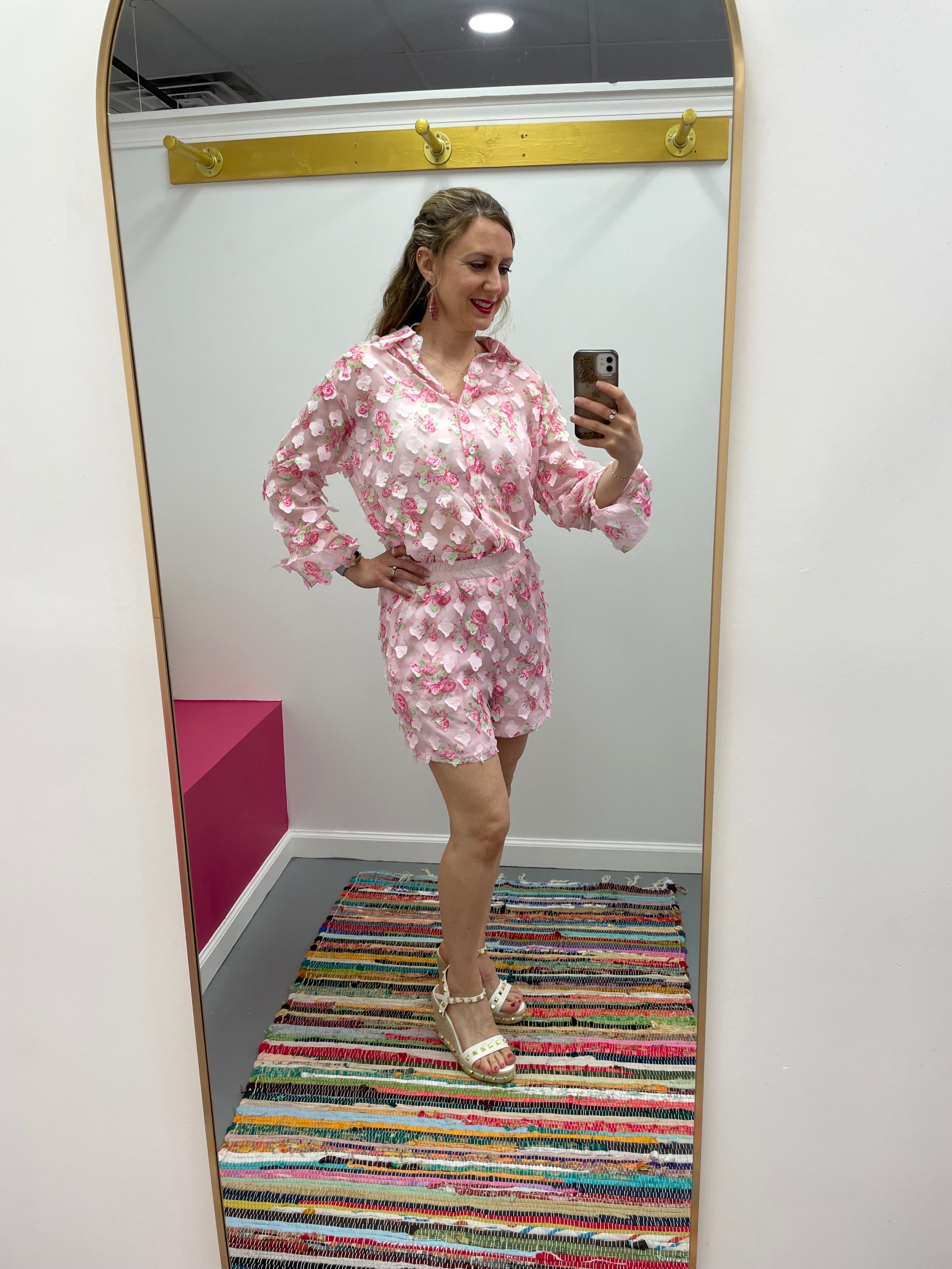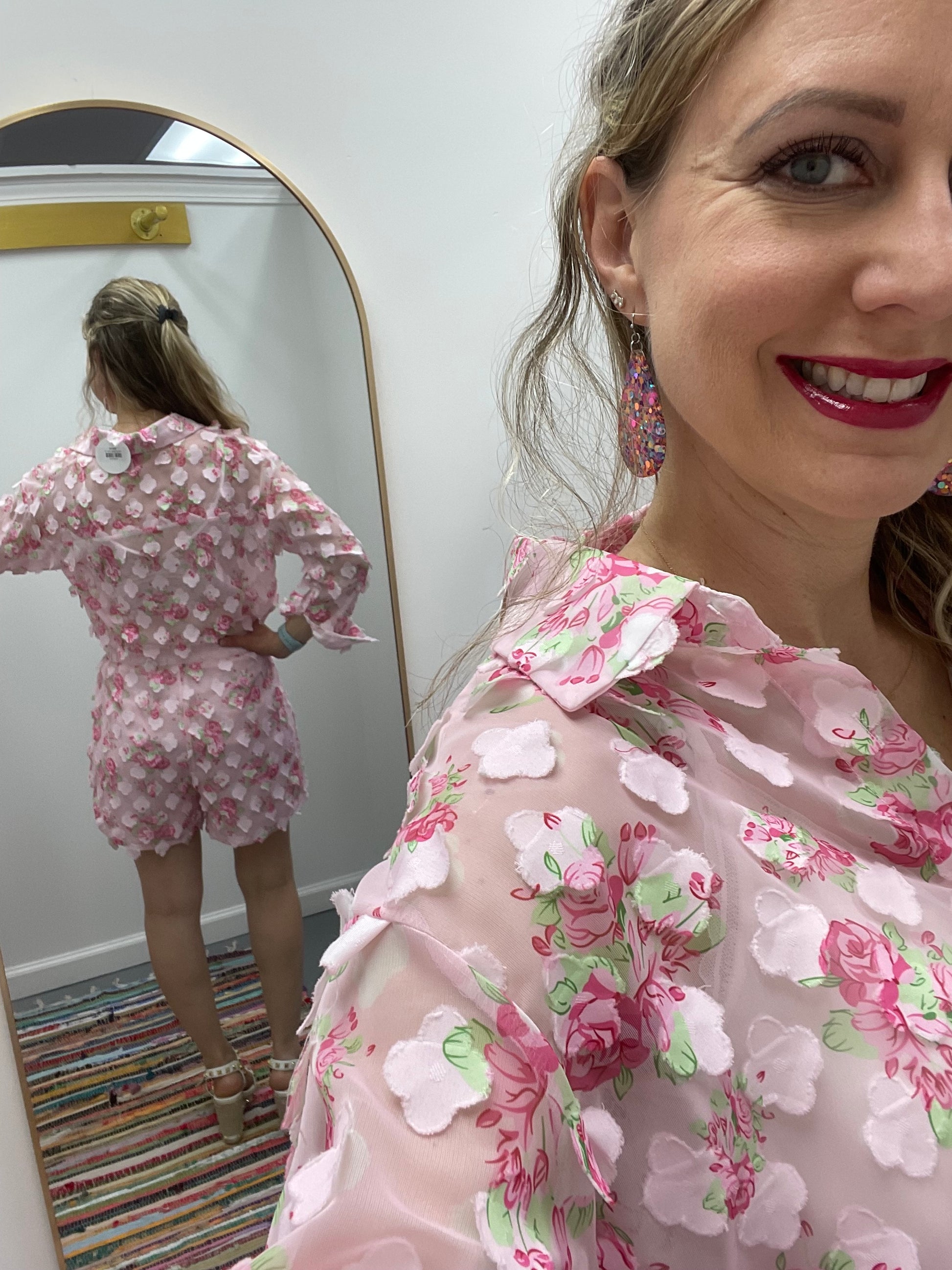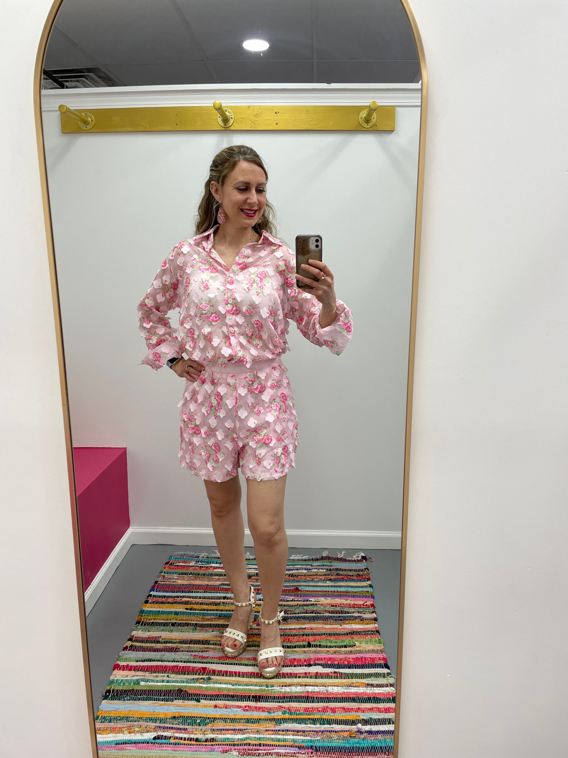 Look as glam as a bouquet in the Floral Glam Set! Perfect for brunch with the girls, this fab set features a sheer blouse with decorative, functional buttons, and fully-lined shorts with elastic waist AND pockets!!! Add a floral-filled pop to your look while keeping it versatile - pair the top with denim later in the year for a whole new look! Uh, yes please!