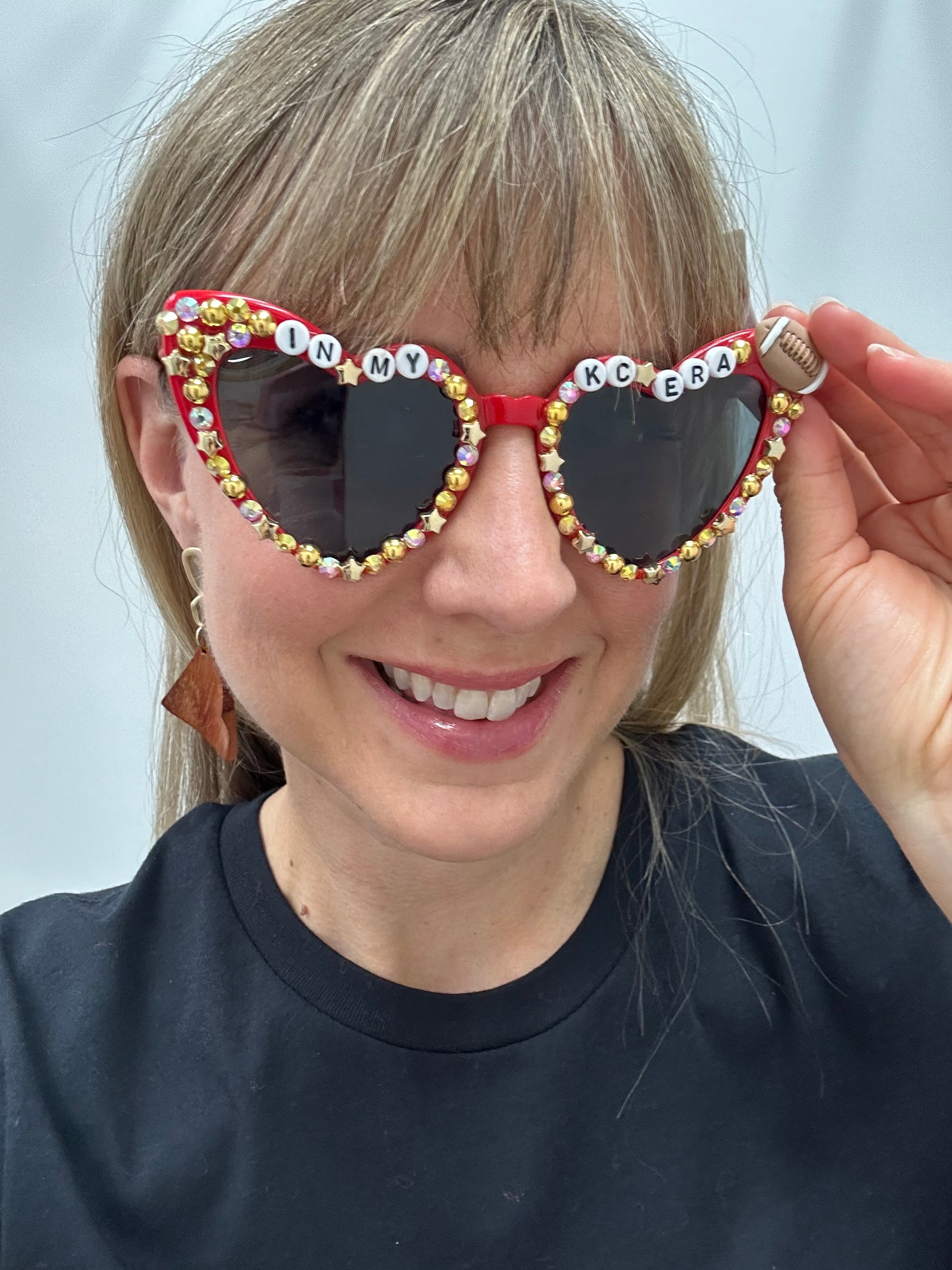 Score a touchdown with our Glam Glasses KC Football! These red glasses are adorned with hand embellished gold details and a football charm, perfect for cheering on your favorite team in style. Game day just got a whole lot more glamorous!