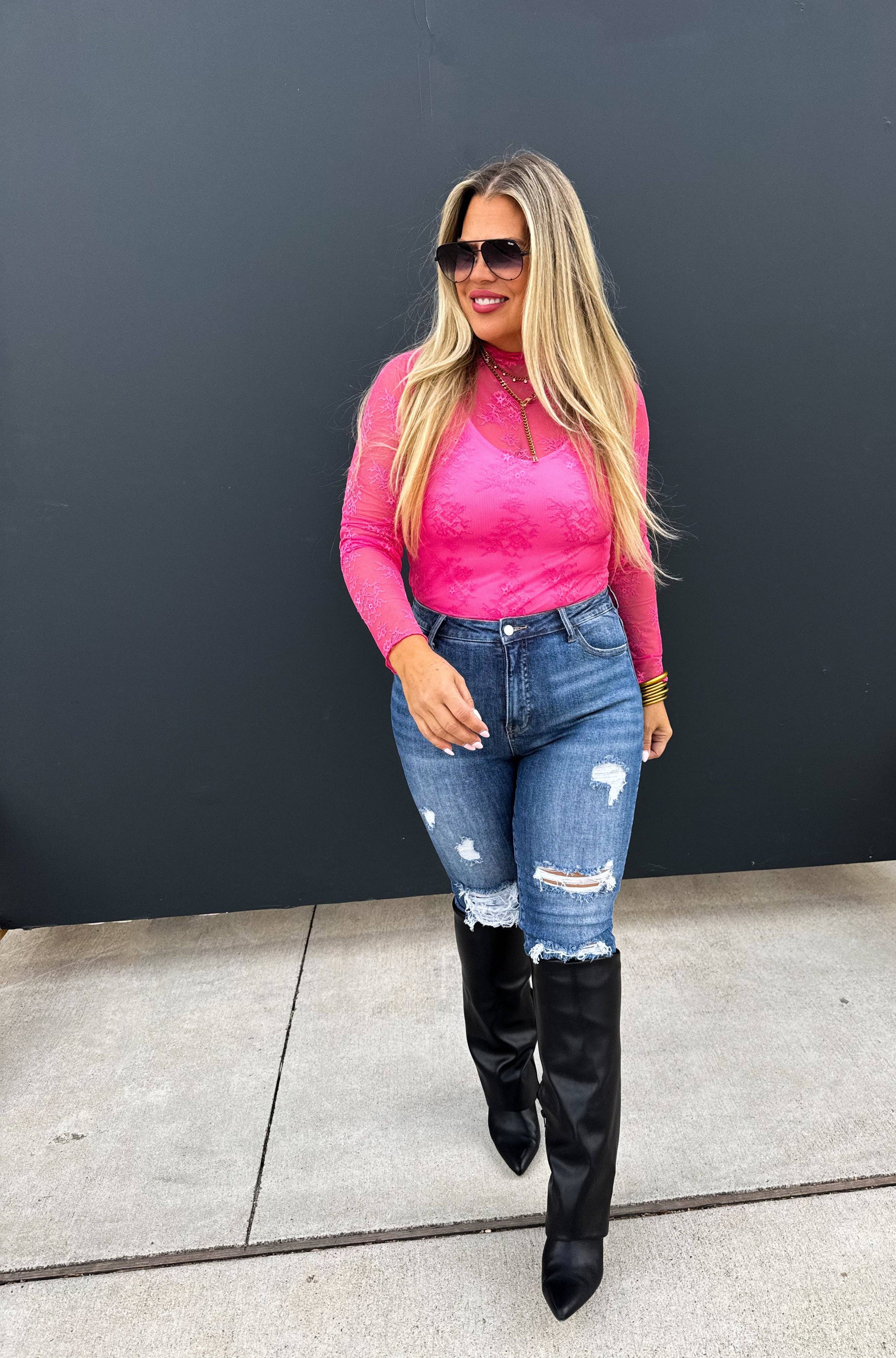Get ready to be the center of attention with this lacey mesh top! Perfect for layering, this long-sleeve top has a floral embroidered sheer design that will have all eyes on you. The delicate mock neck and thumbhole details add a touch of sophistication, while the relaxed fit and fluttery hemline give it a playful and flirty feel. Has thumbholes.