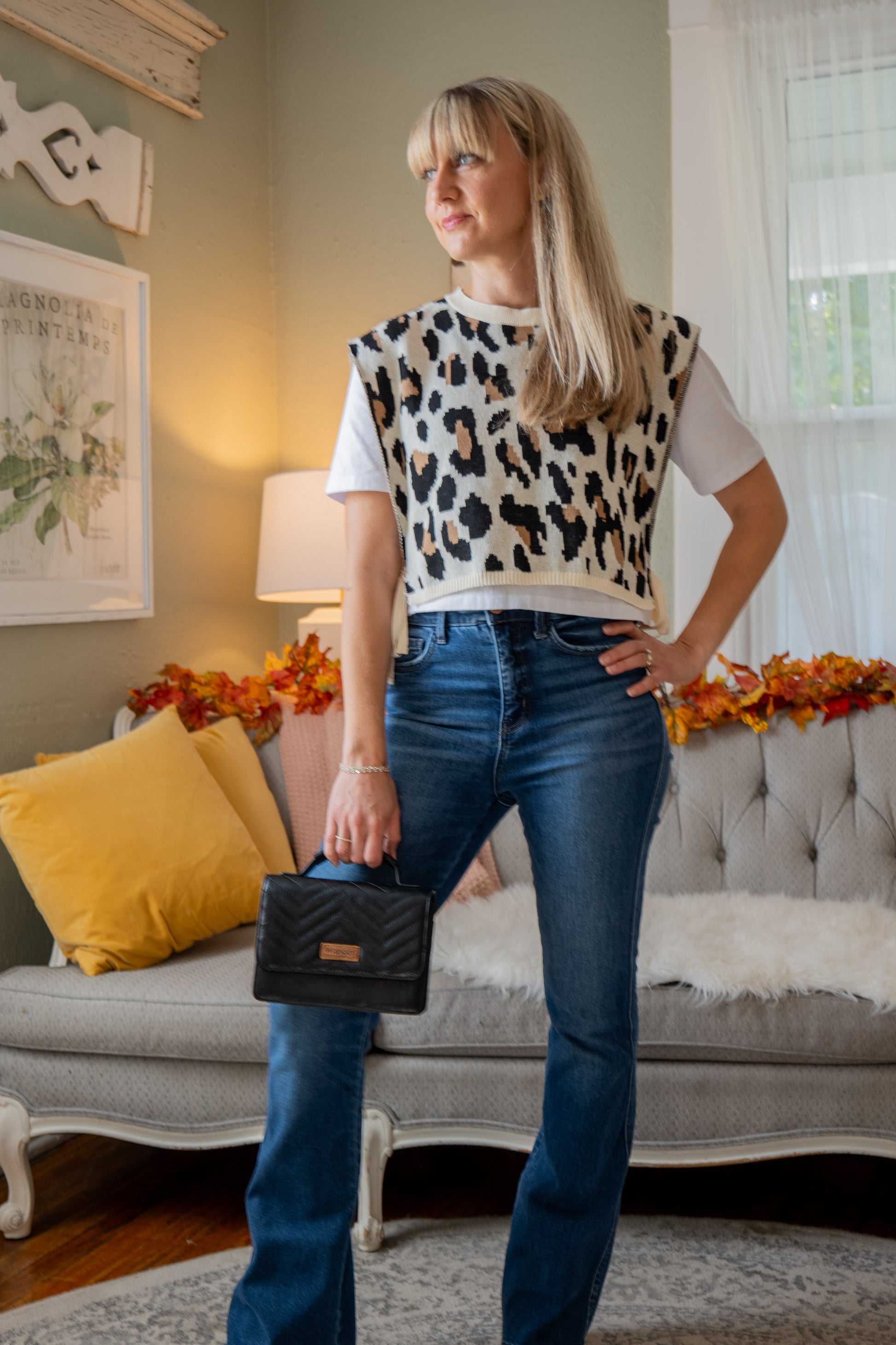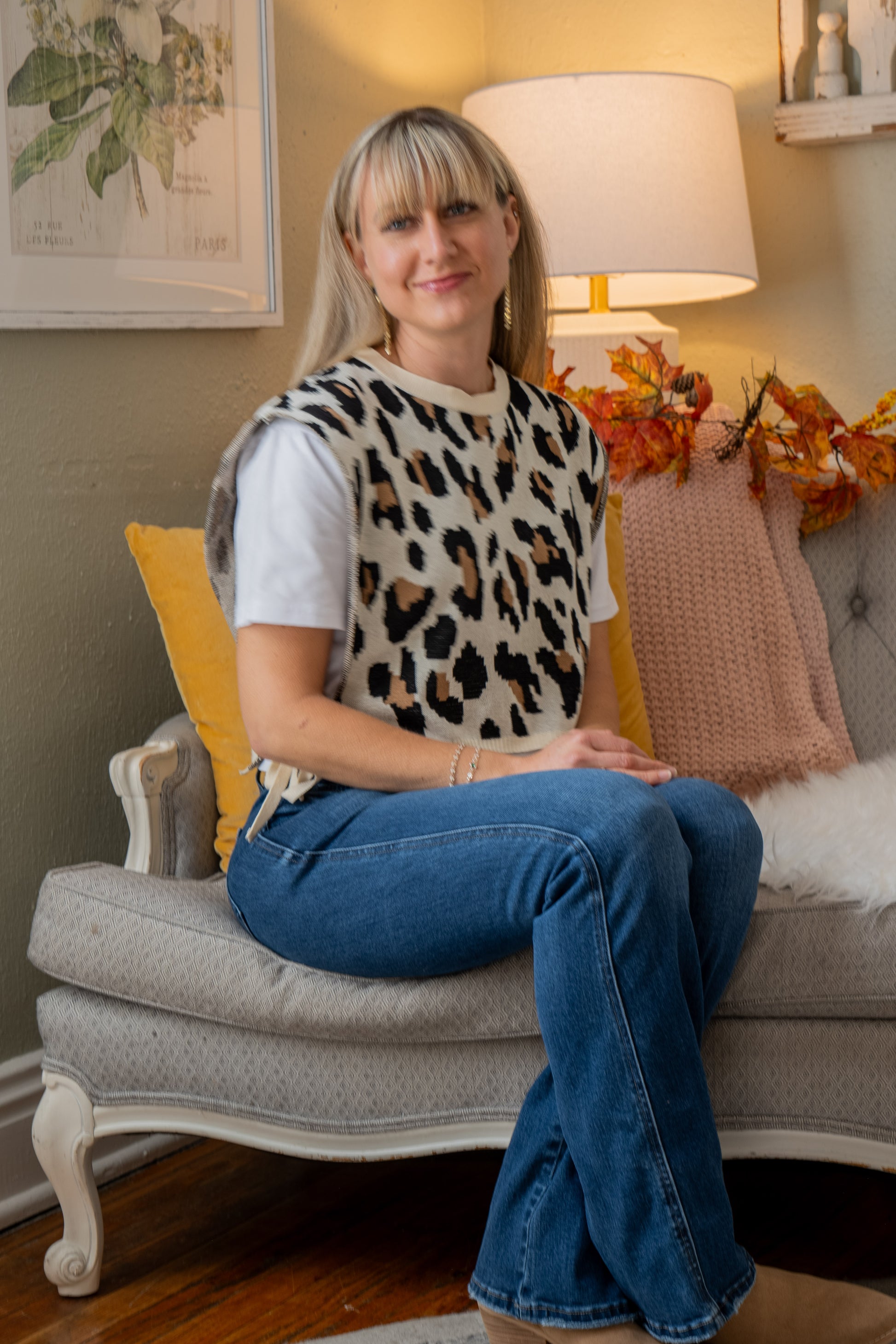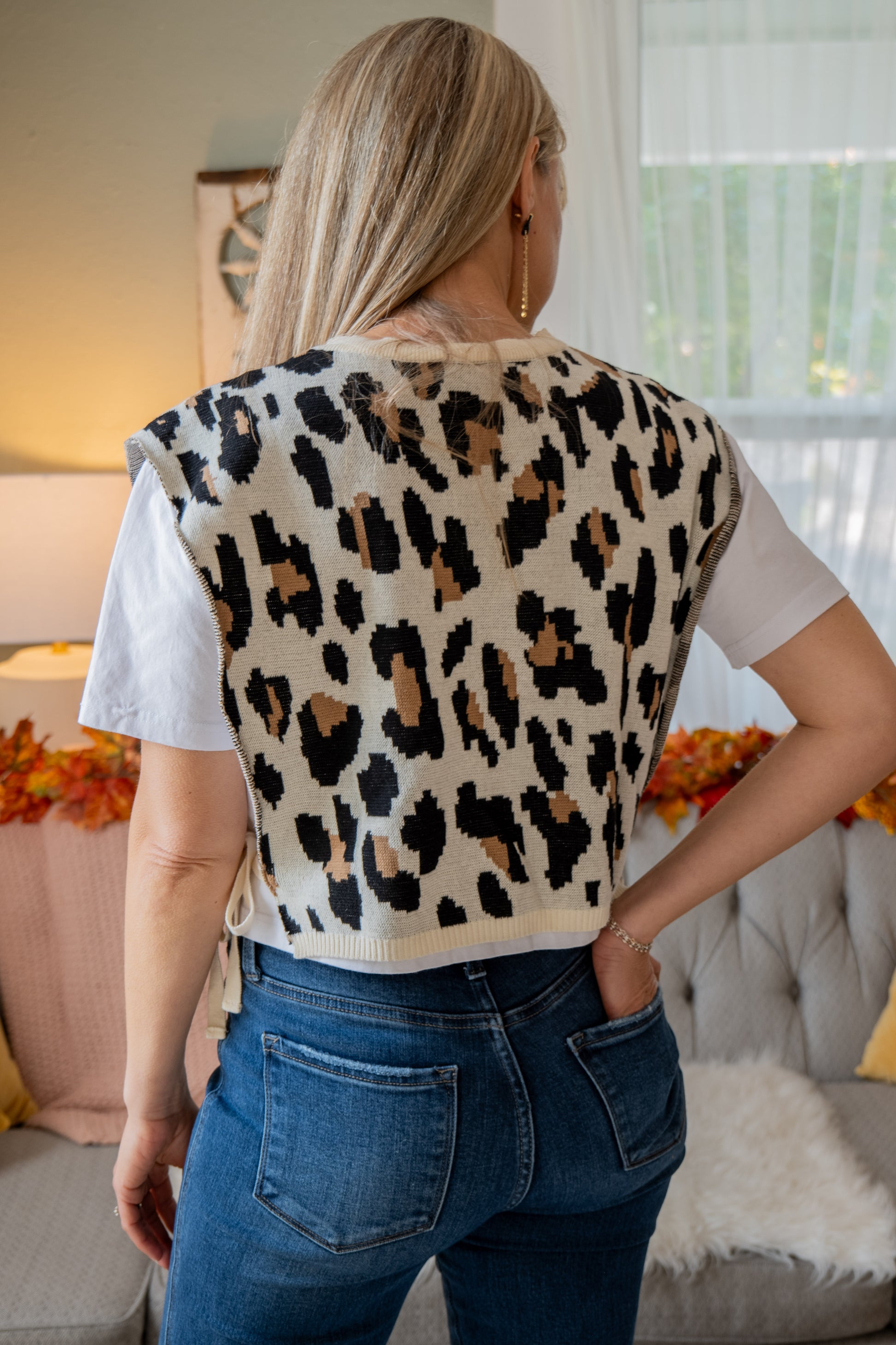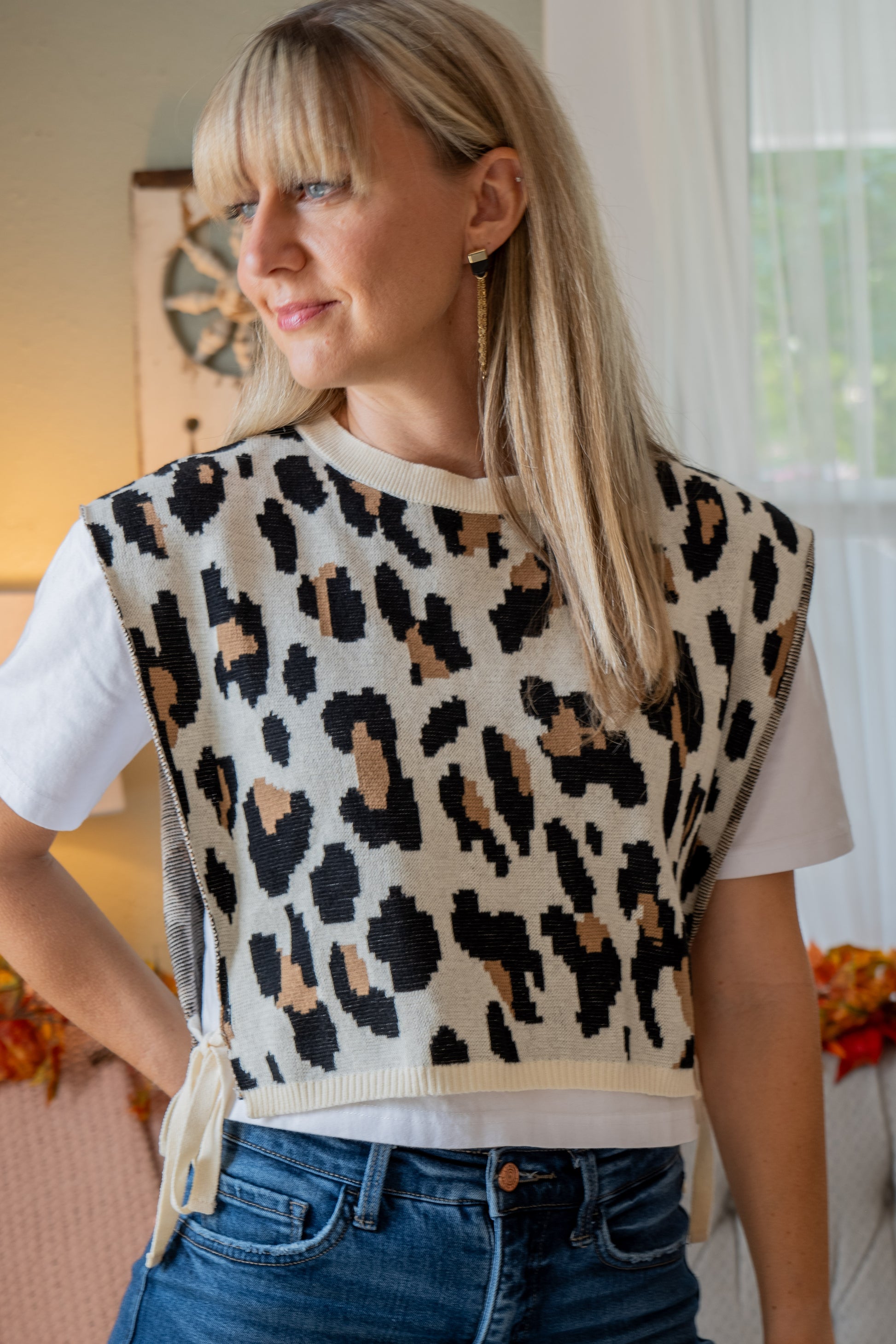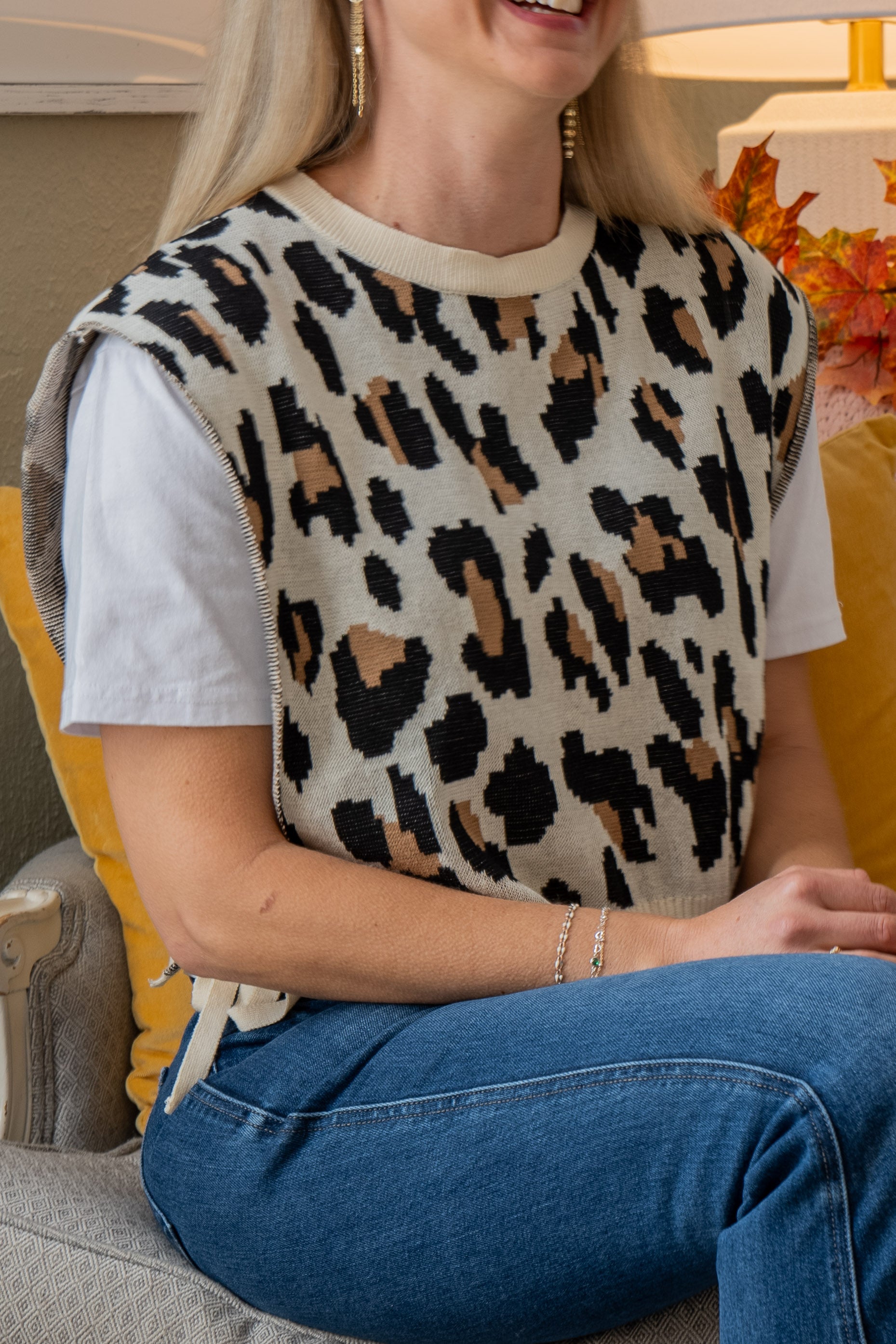 Add some fierce fall flair to your wardrobe with this ultra-versatile leopard vest combo. Featuring a creamy leopard knit vest attached to a classic white tee, this piece takes the guesswork out of layering—just throw on and go! The neutral tones pair perfectly with denim, trousers, or faux leather.