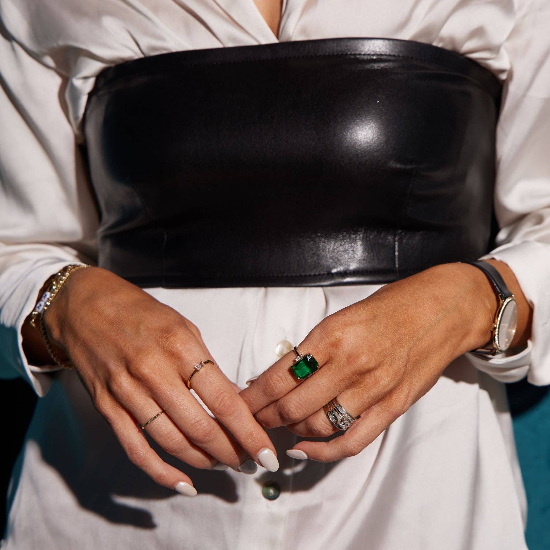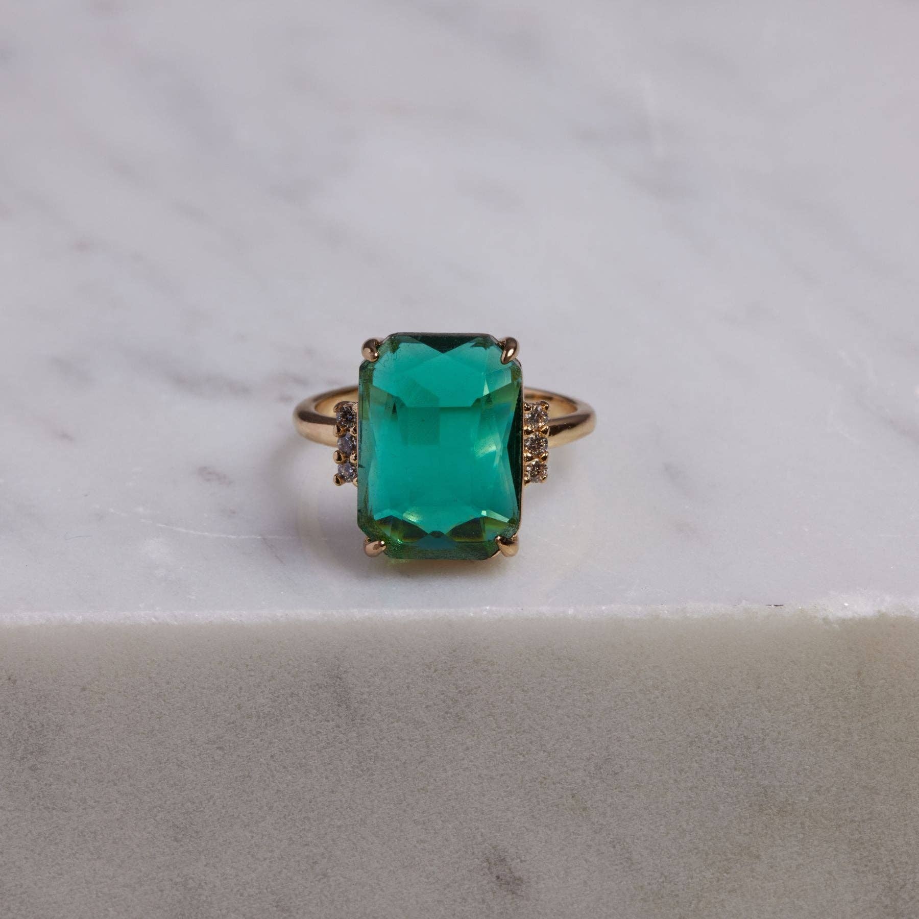 This stunning gold ring features an emerald cut genuine glass stone at its center. This luxe holiday design is elegantly crafted from 14k gold plating over plated brass.