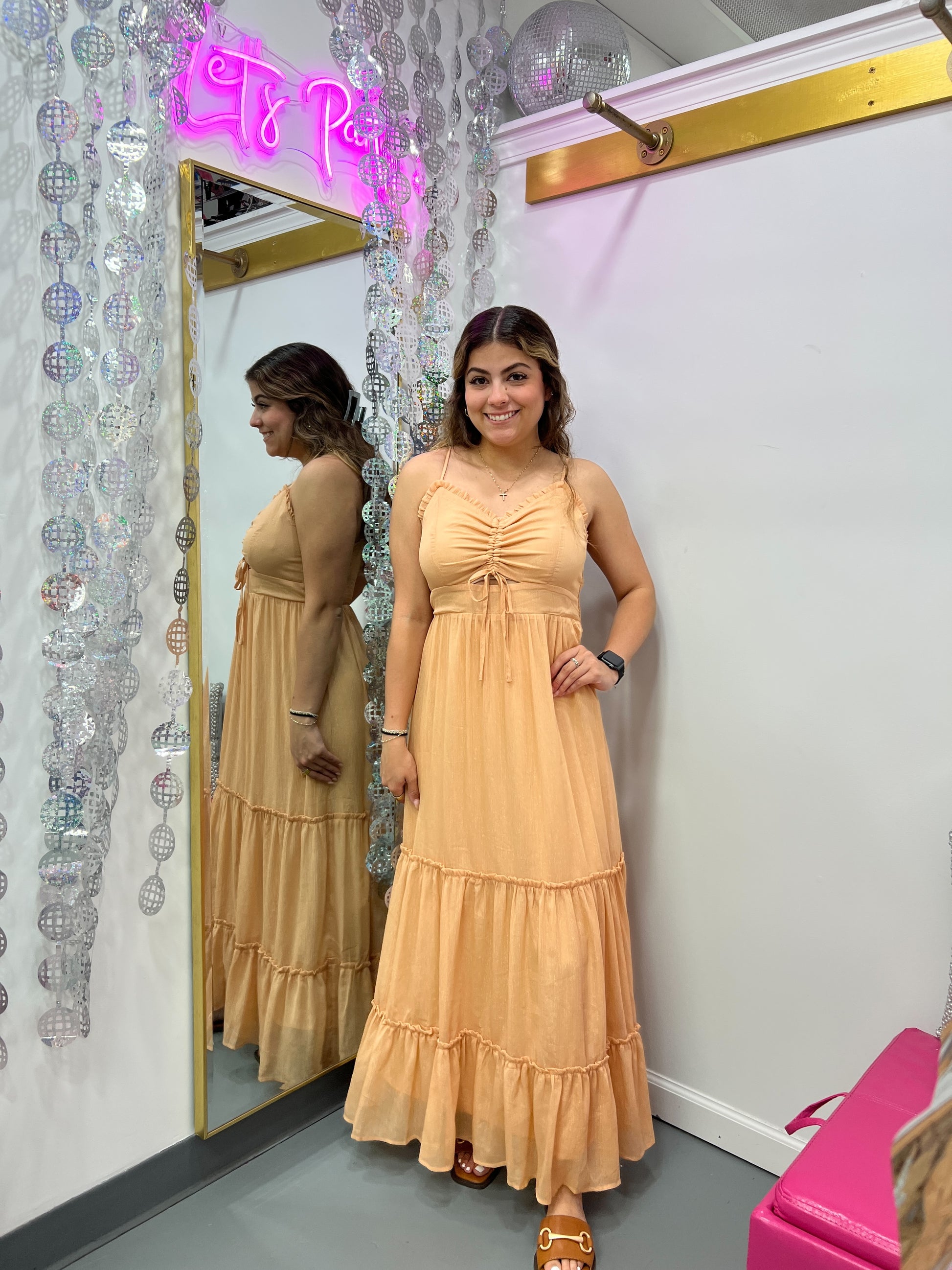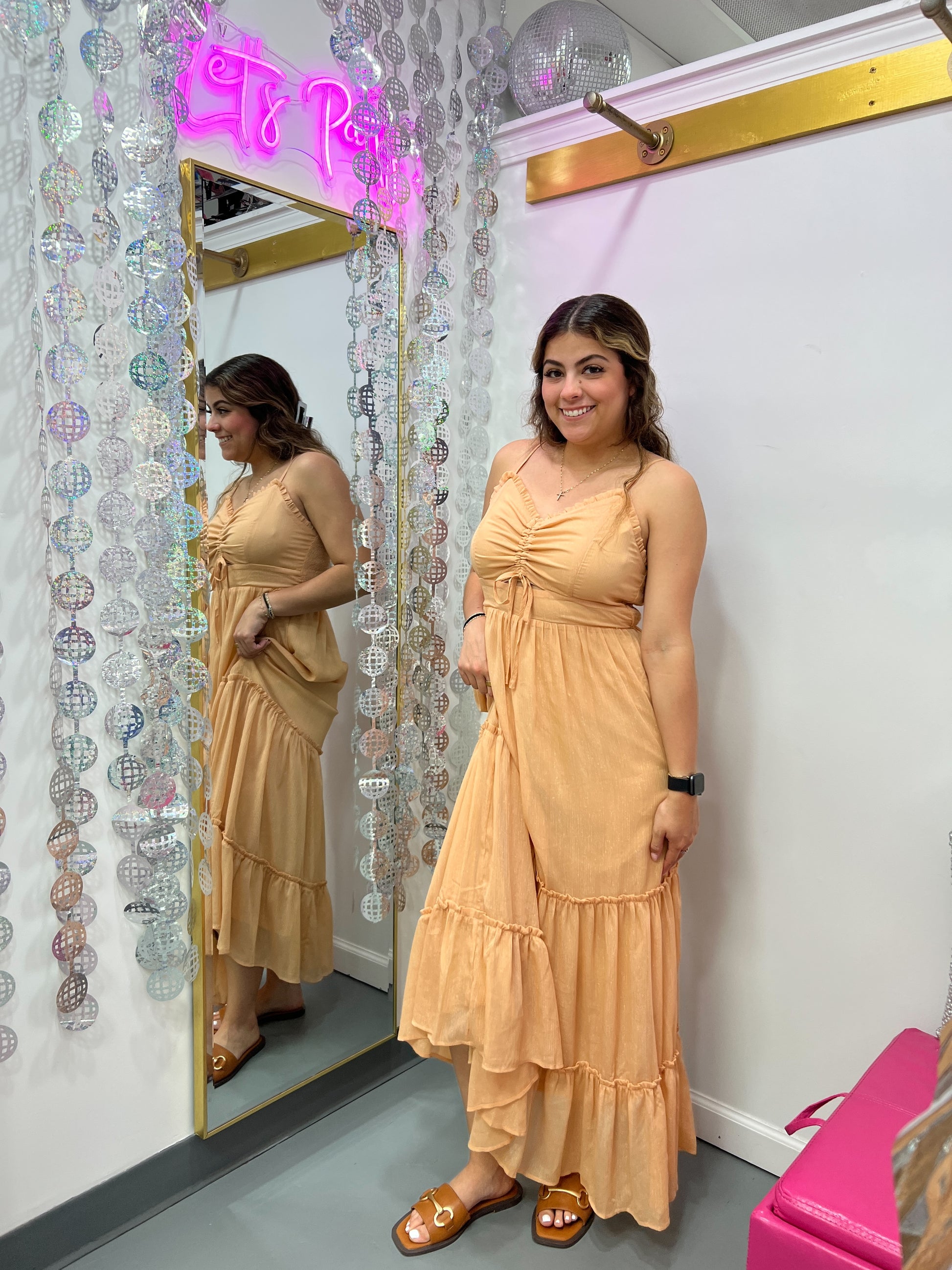 Dress up your wardrobe with our Maxi Dress Metallic Apricot! This stunning dress boasts a playful metallic sheen that's sure to turn heads. Stay stylish and comfortable all day long with this quirky and fun addition to your collection. (Believe us, you'll want to twirl in it!)