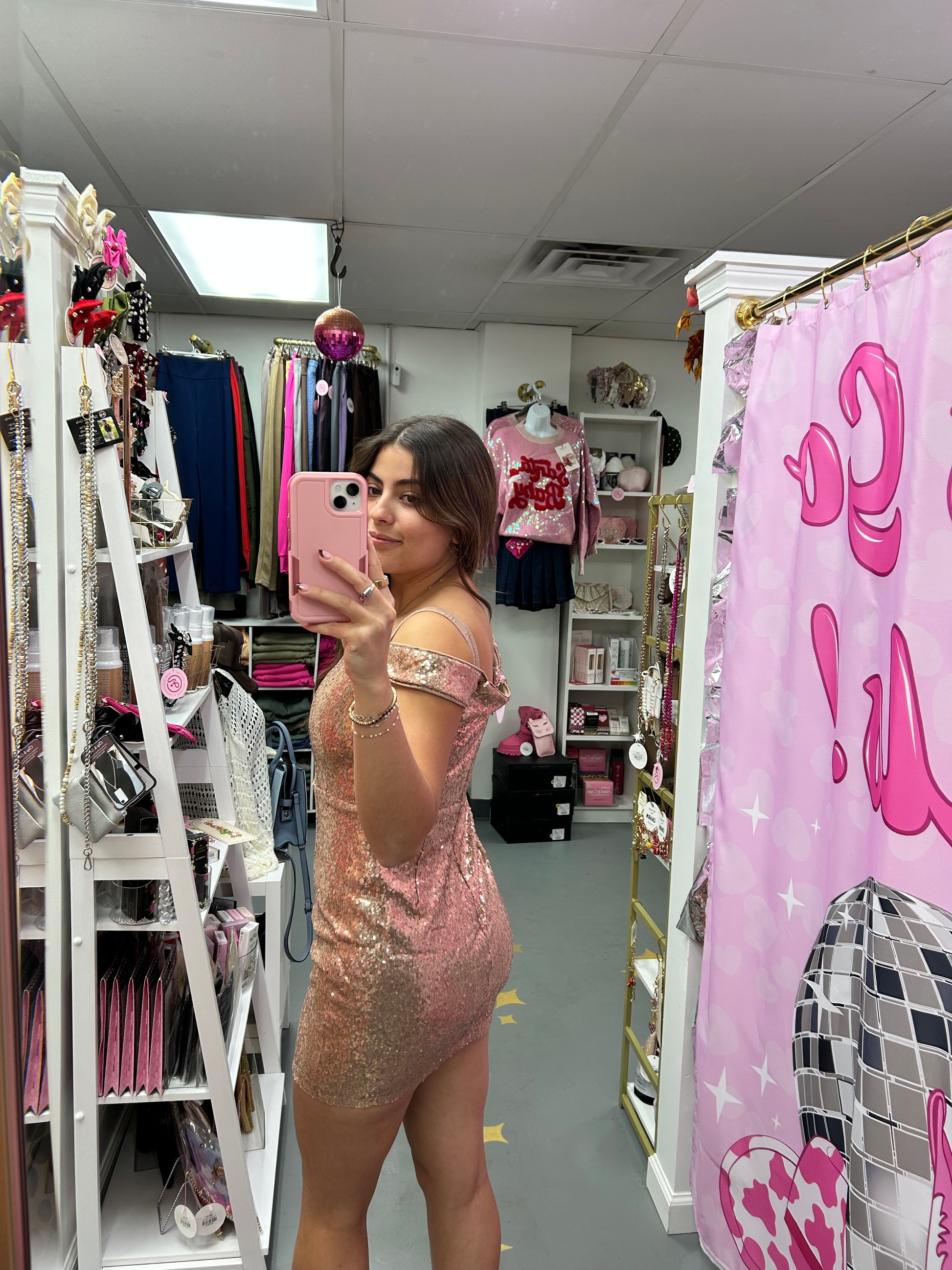 Shine bright all night in our Off Shoulder Sequin Mini Dress ✨. This glam little number was made for the spotlight, featuring shimmering gold sequins that catch the light from every angle. The flattering off-shoulder neckline and body-hugging silhouette create a stunning, confident look perfect for parties, celebrations, or a night out on the town.