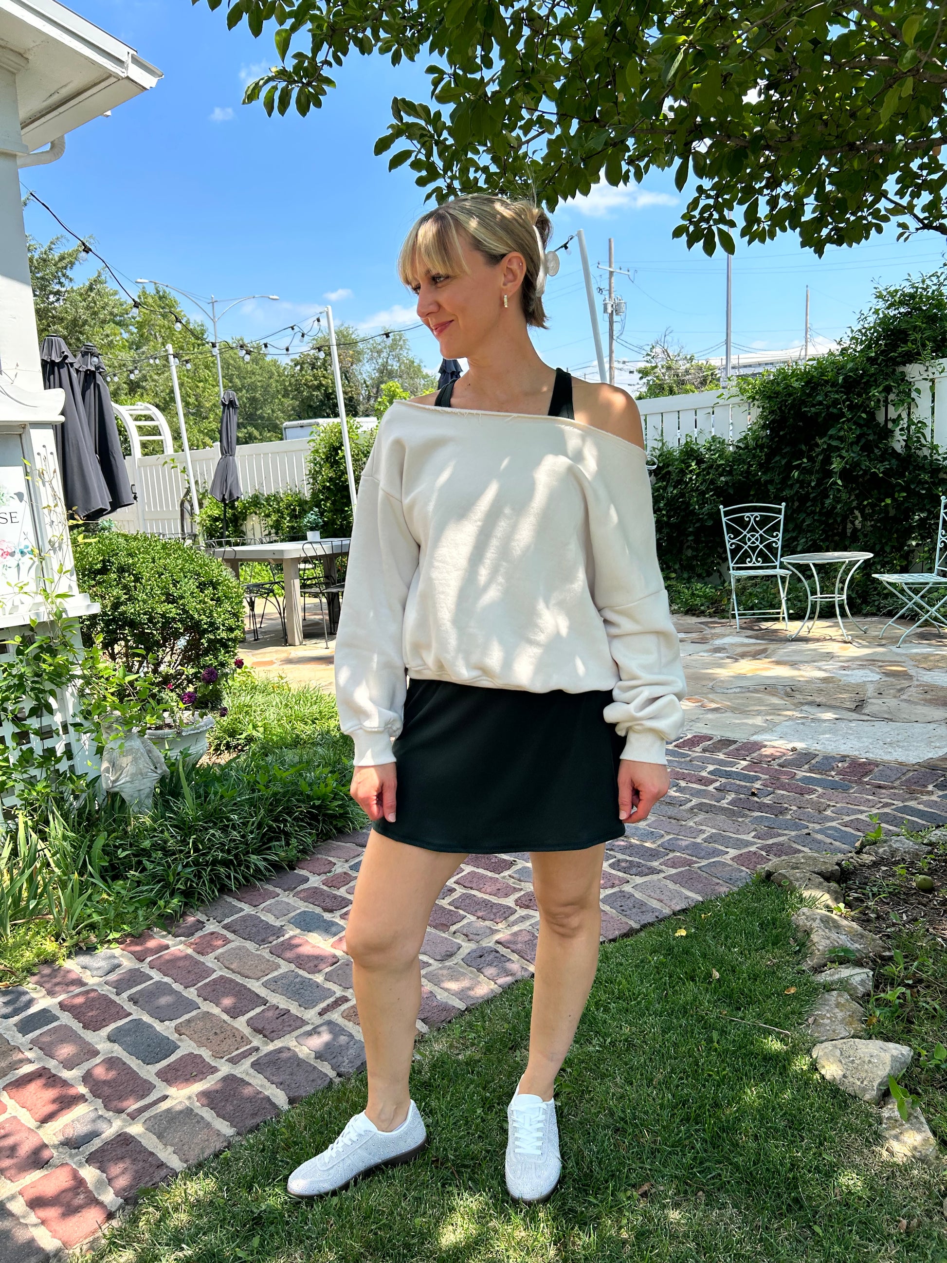 The relaxed fit gives you that easy, lived-in feel, while the wide neckline and ribbed trim keep it looking intentional and stylish. Pair it with denim, joggers, or even a satin skirt for an unexpected mix of textures.