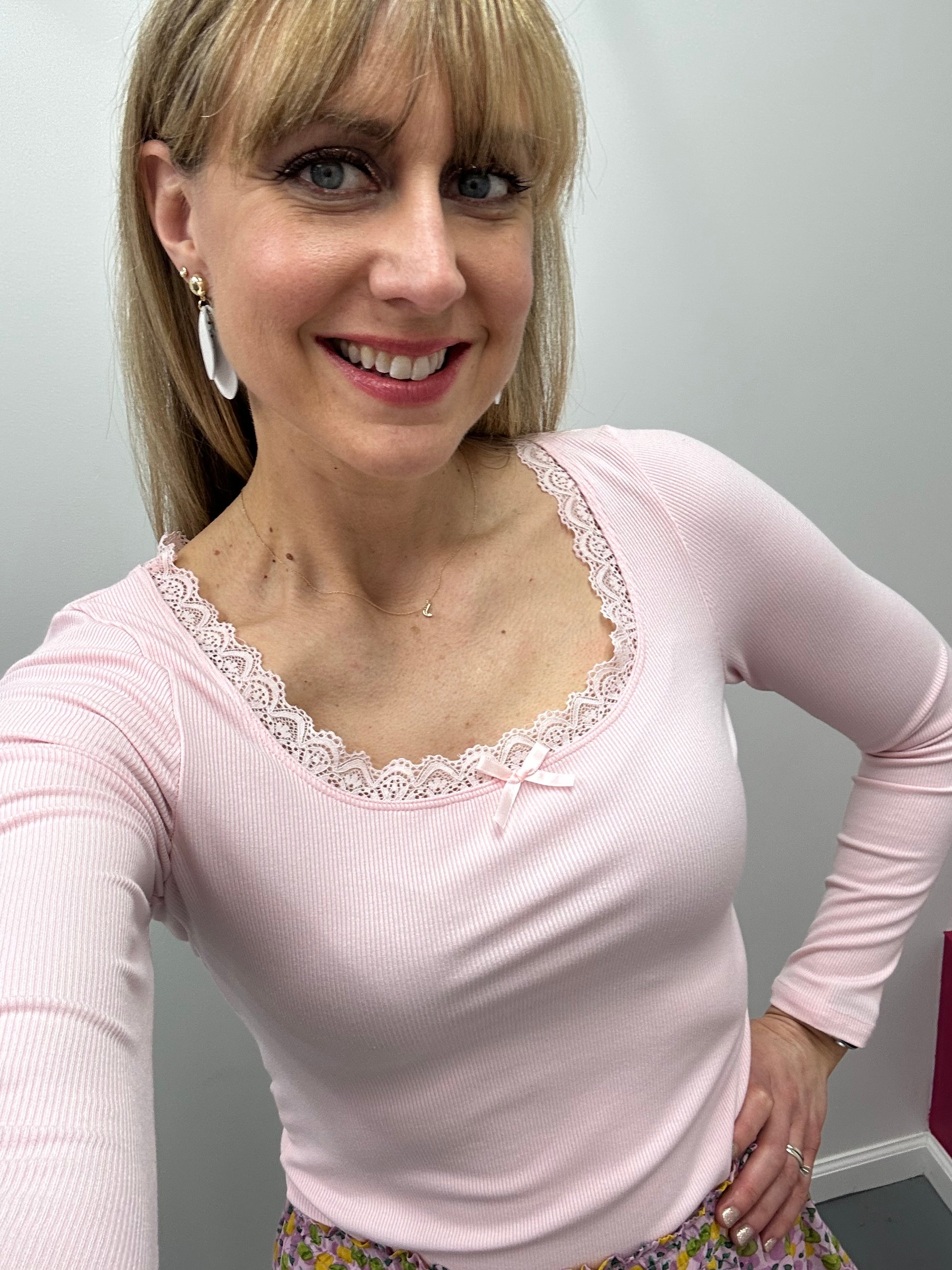 Lace Trim Ribbed Tee LS Lt Pink