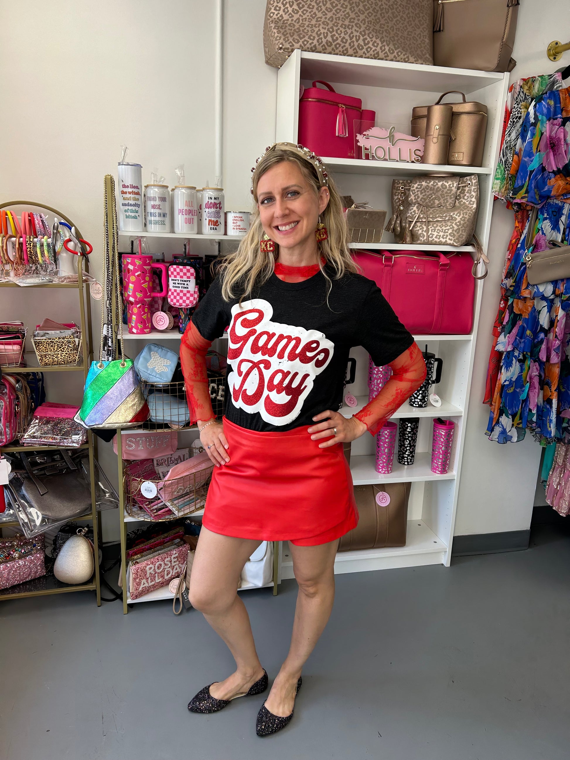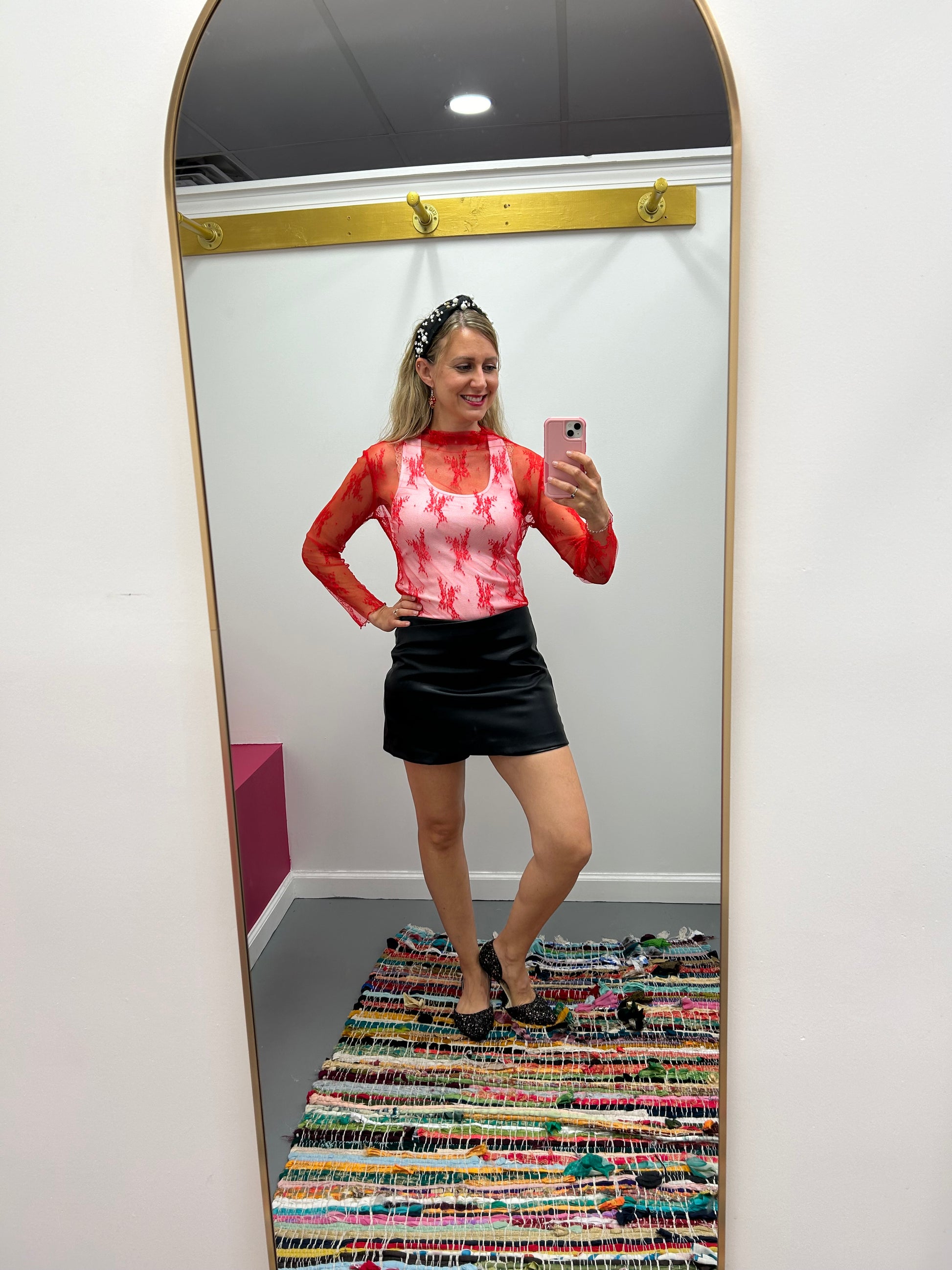 Add a pop of color to your wardrobe with this red floral mesh top. The stretchy material makes it comfortable to wear while the round neckline adds a touch of elegance. Layer it under a tank or cami for a versatile look or get creative and layer your favorite graphic tee over it.