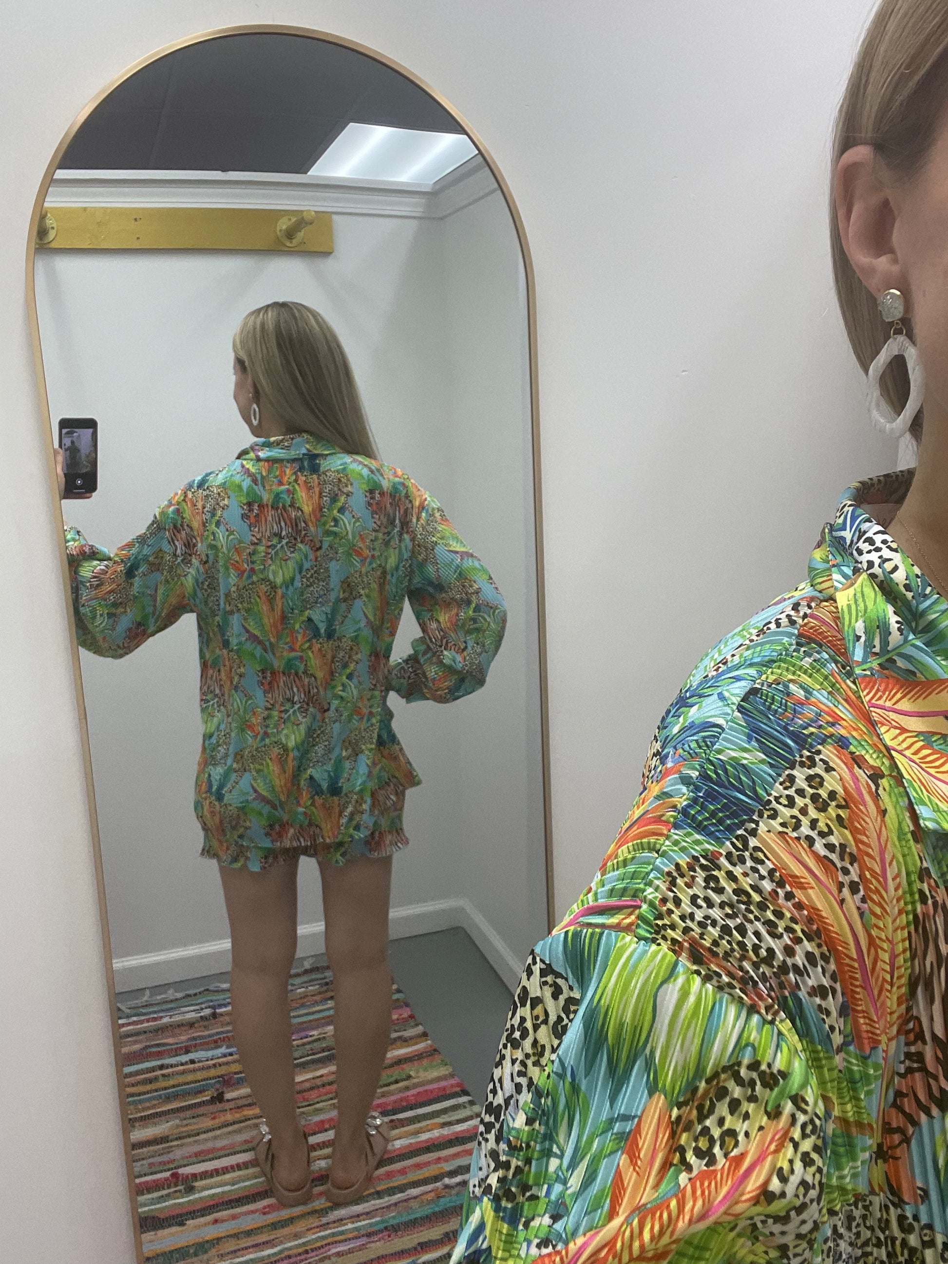 Take a walk on the wild side with our Safari Chic Pleated Set! Featuring a printed button-up top with a collar and comfortable shorts with pockets, drawstring, and a cute lettuce hem, this set is perfect for any adventure. Stay stylish and comfortable on your next safari journey. Order now!