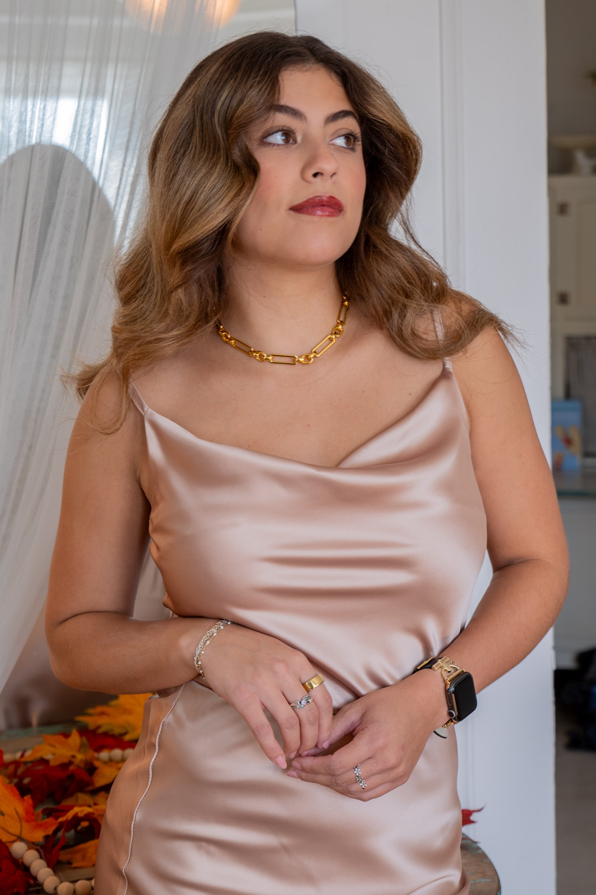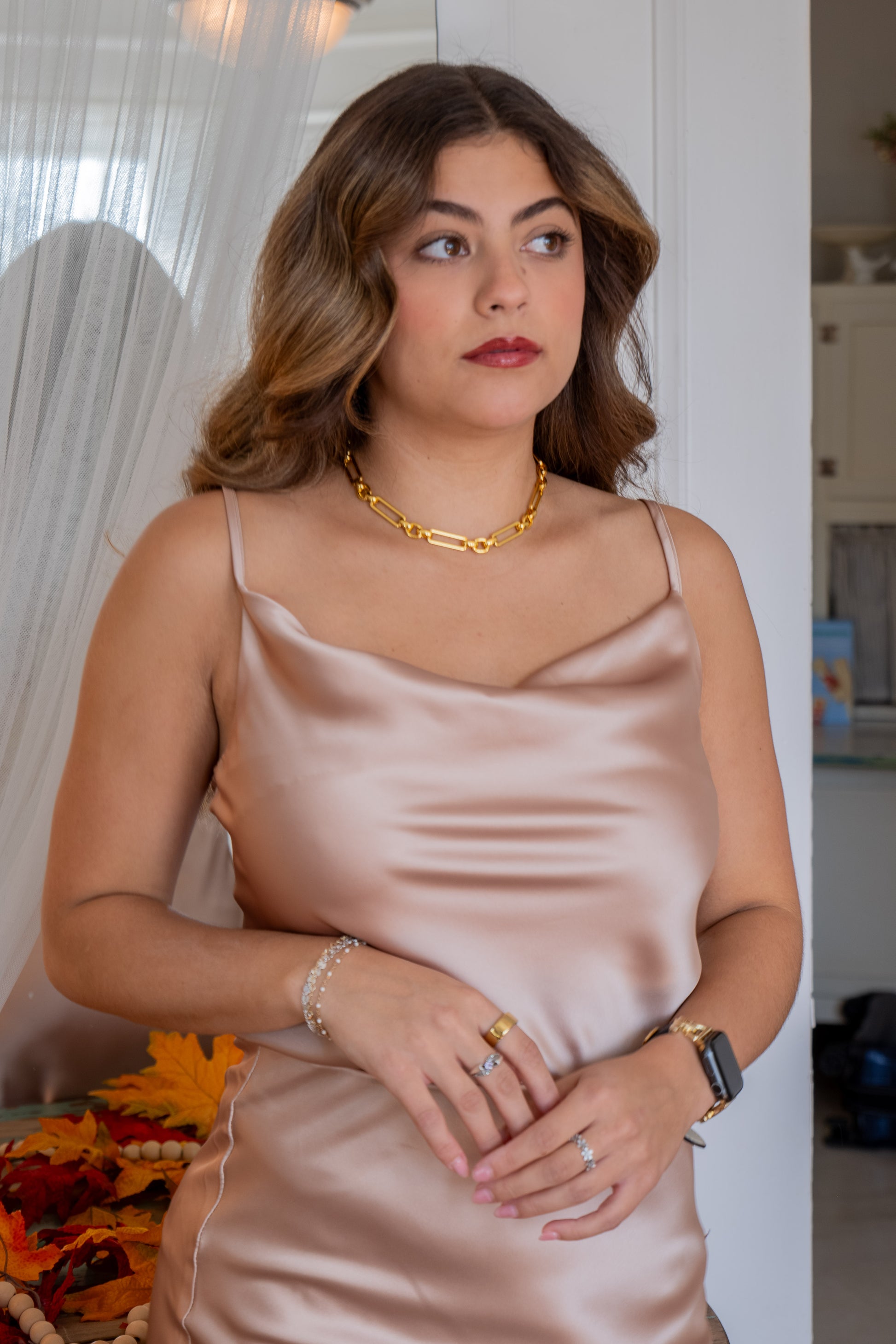 Meet your glow-up tank. The Satin Champagne Cowl Tank features a soft, draped neckline and a luminous satin finish for effortless elegance. Style it solo or pair with the matching midi skirt for an event-ready look.