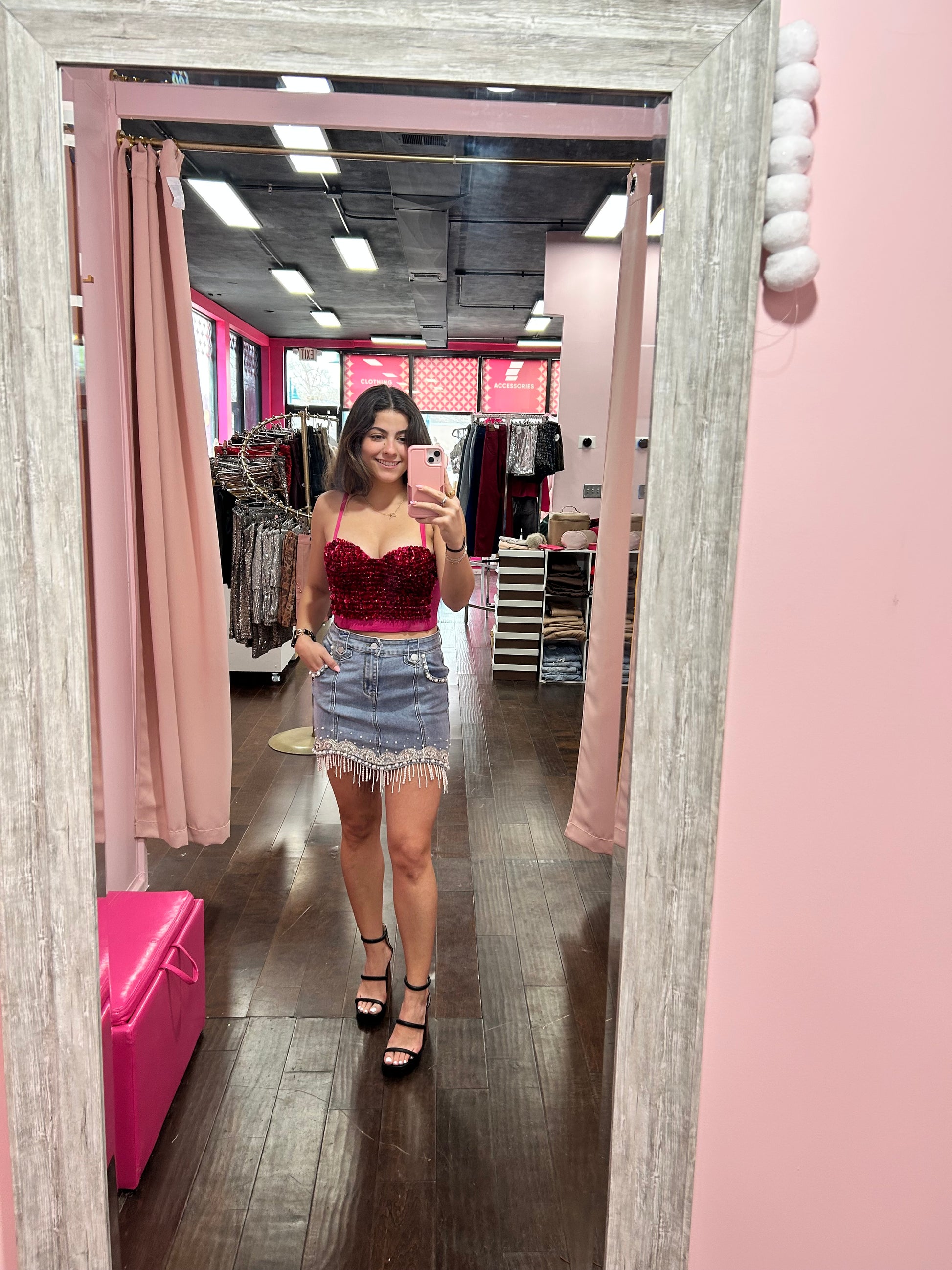 This bustier features a textured, bulky sequin design that gives it dimension and drama without feeling stiff or costume-y. The cropped silhouette highlights your waist beautifully, while the corset-inspired structure creates a flattering, secure fit that feels supportive and intentional. It’s glamorous, playful, and powerful all at once — the perfect balance of edgy and feminine. Whether you’re dancing, posing for pictures, or owning the night, this top was made to shine with you.