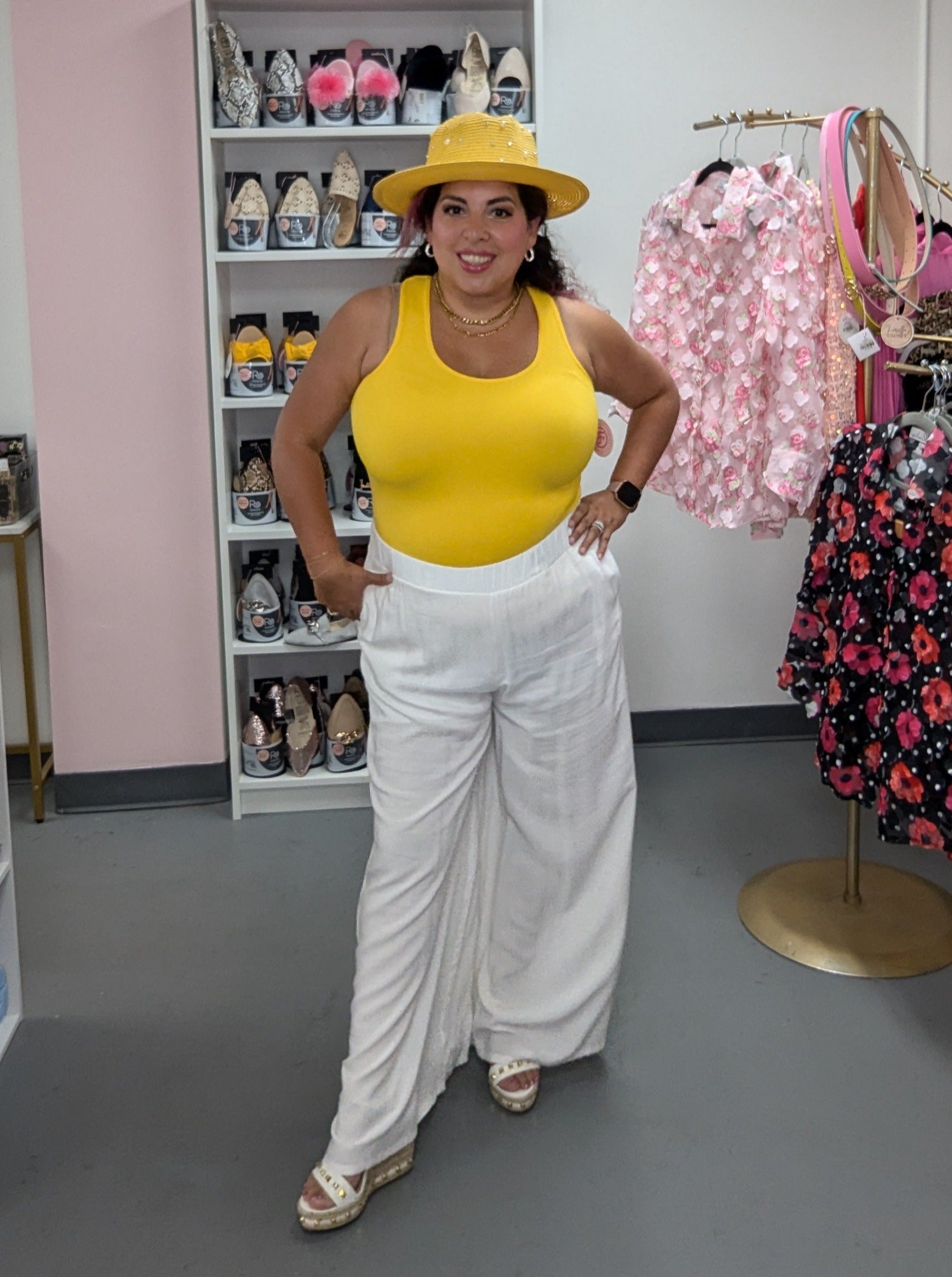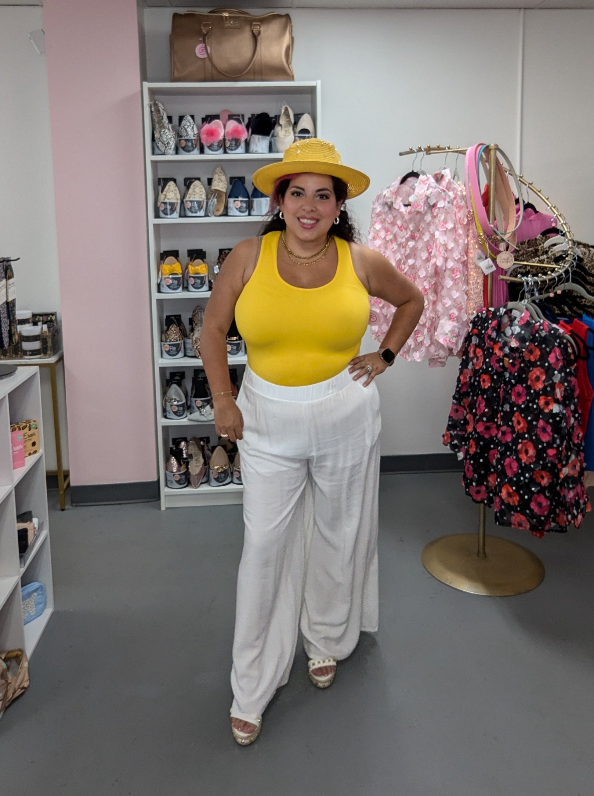 Need a "fitting" wardrobe solution? Look no further! Our Shaping Tank is the perfect one-size-fits-all, stretchy ribbed racer back tank that'll be your new closet staple! From small to Large, you've got it all covered! (No pun intend-ed!)