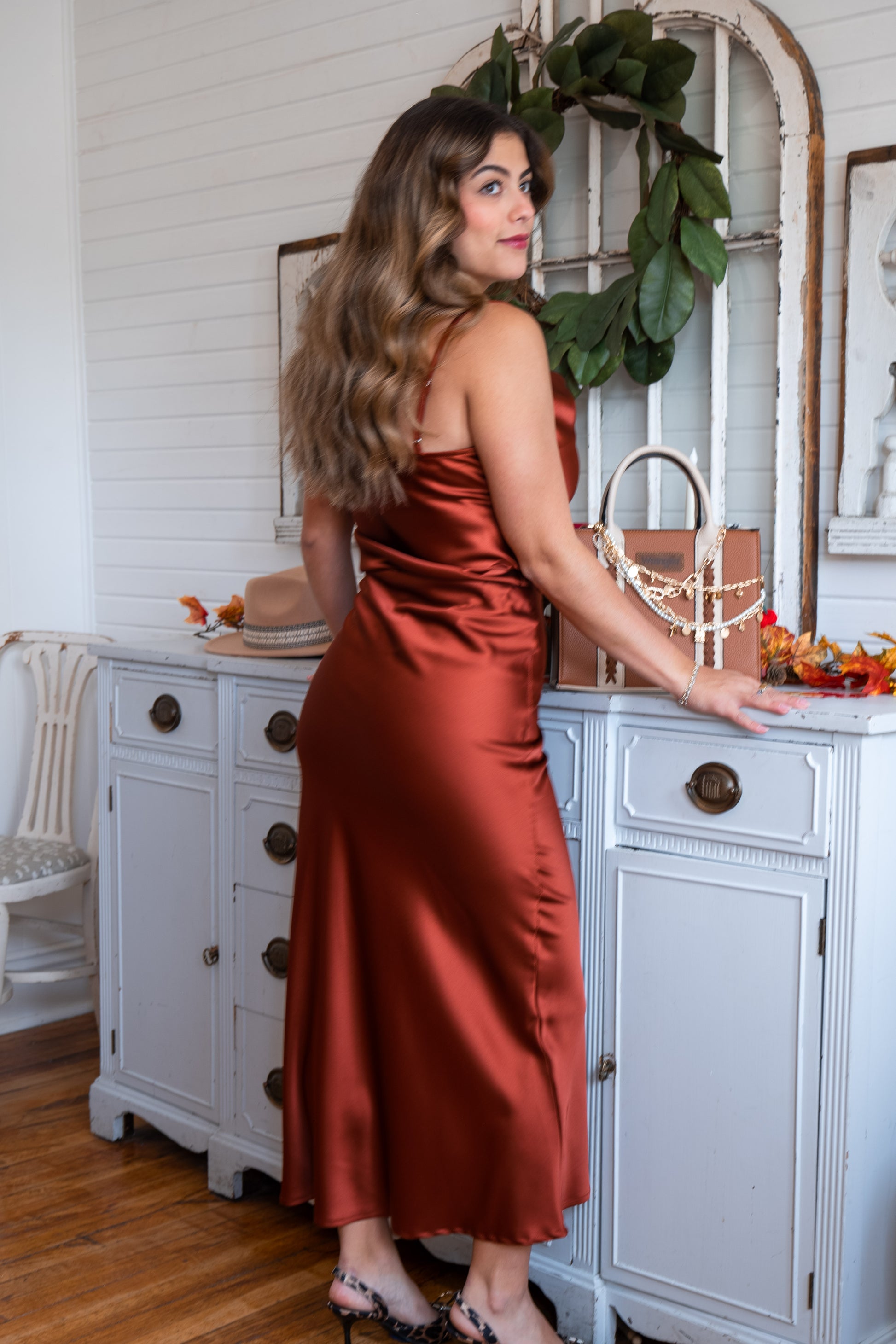 The Satin Sienna Midi Skirt is your go-to for sleek seasonal style. This high-waisted skirt features a soft elastic waistband and a silky drape that’s both comfortable and ultra-flattering. Wear it with the matching cowl tank or dress it down with a chunky sweater.