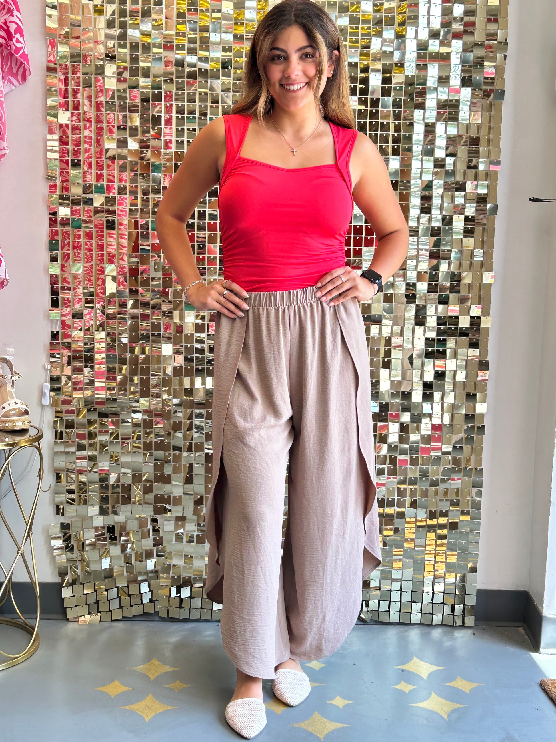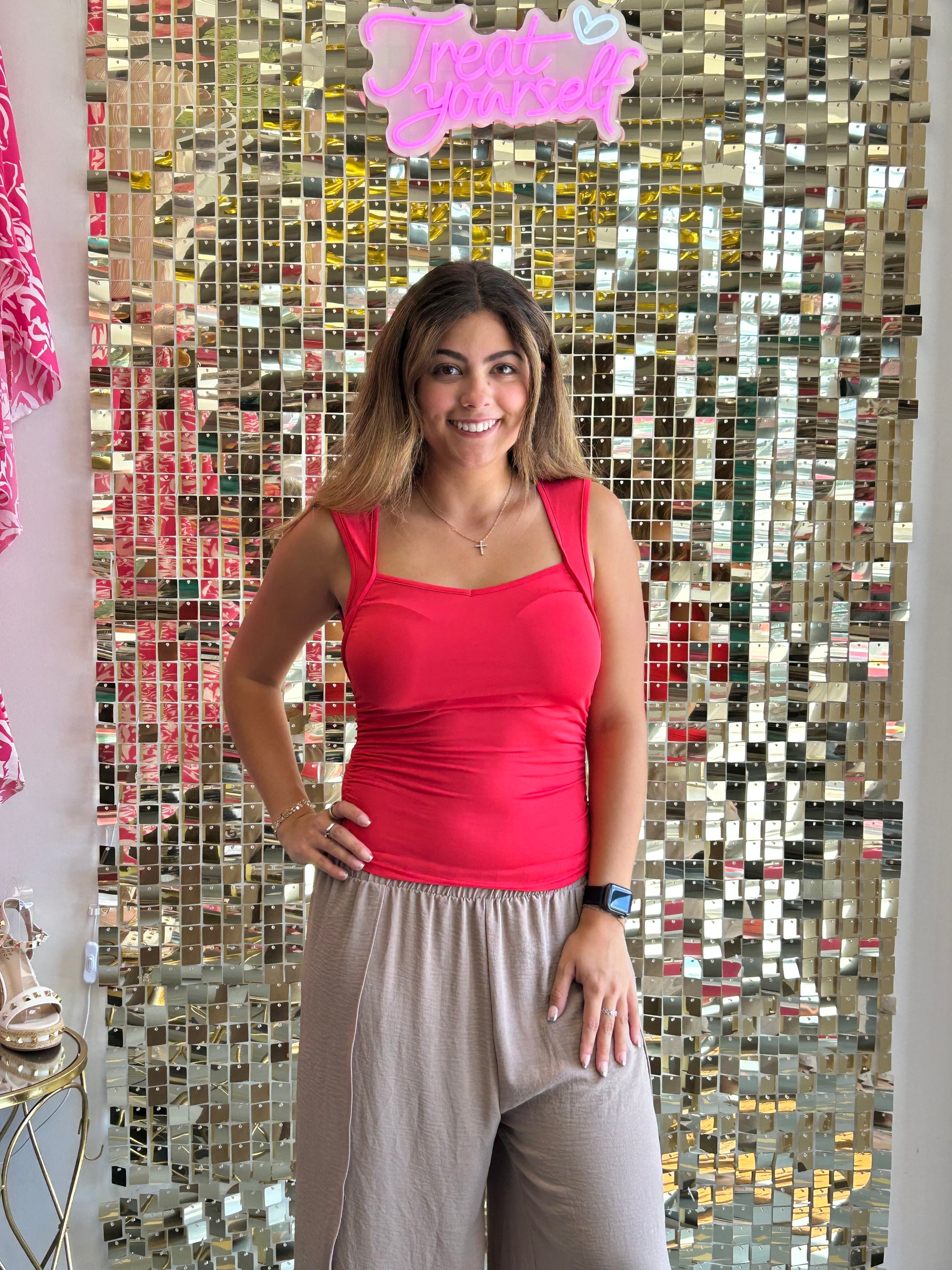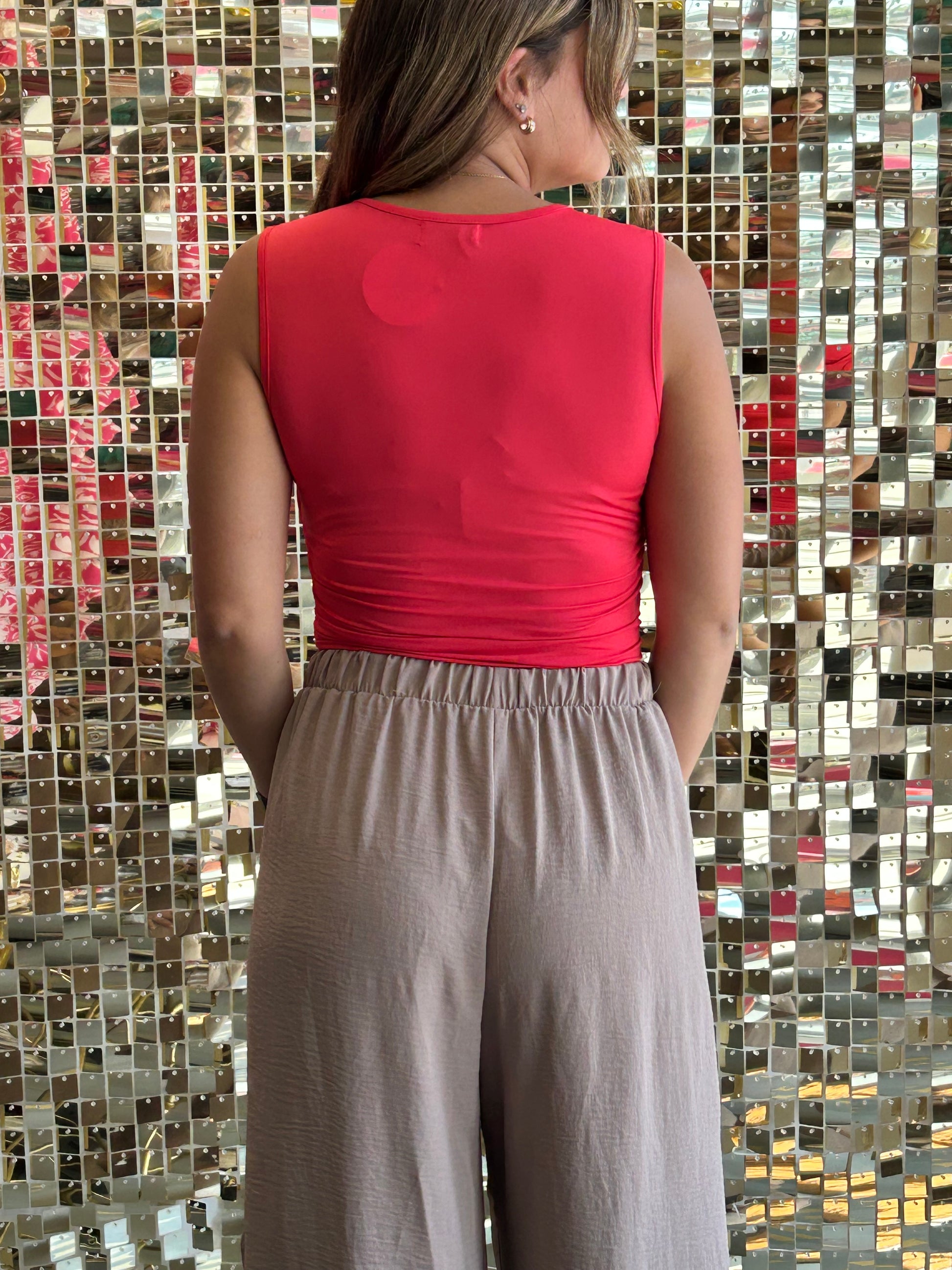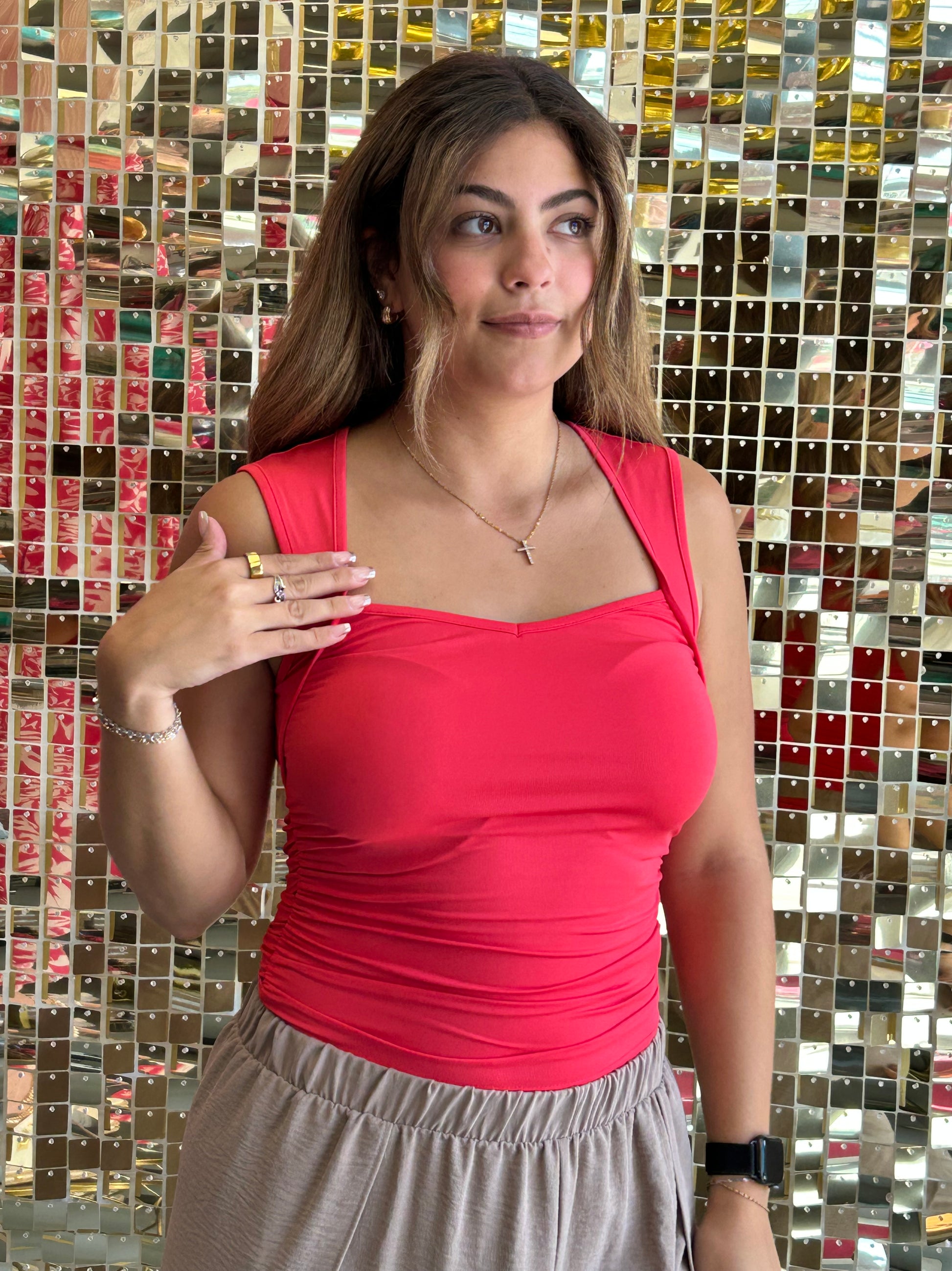 This sleeveless ruched tank brings playful charm to any outfit. Its soft, free-flowing fabric ensures all-day comfort, while the ruched sides add a stylish touch that defines your silhouette. Perfect for dressing up or down, this versatile tank is your go-to for effortless style and a flattering fit.