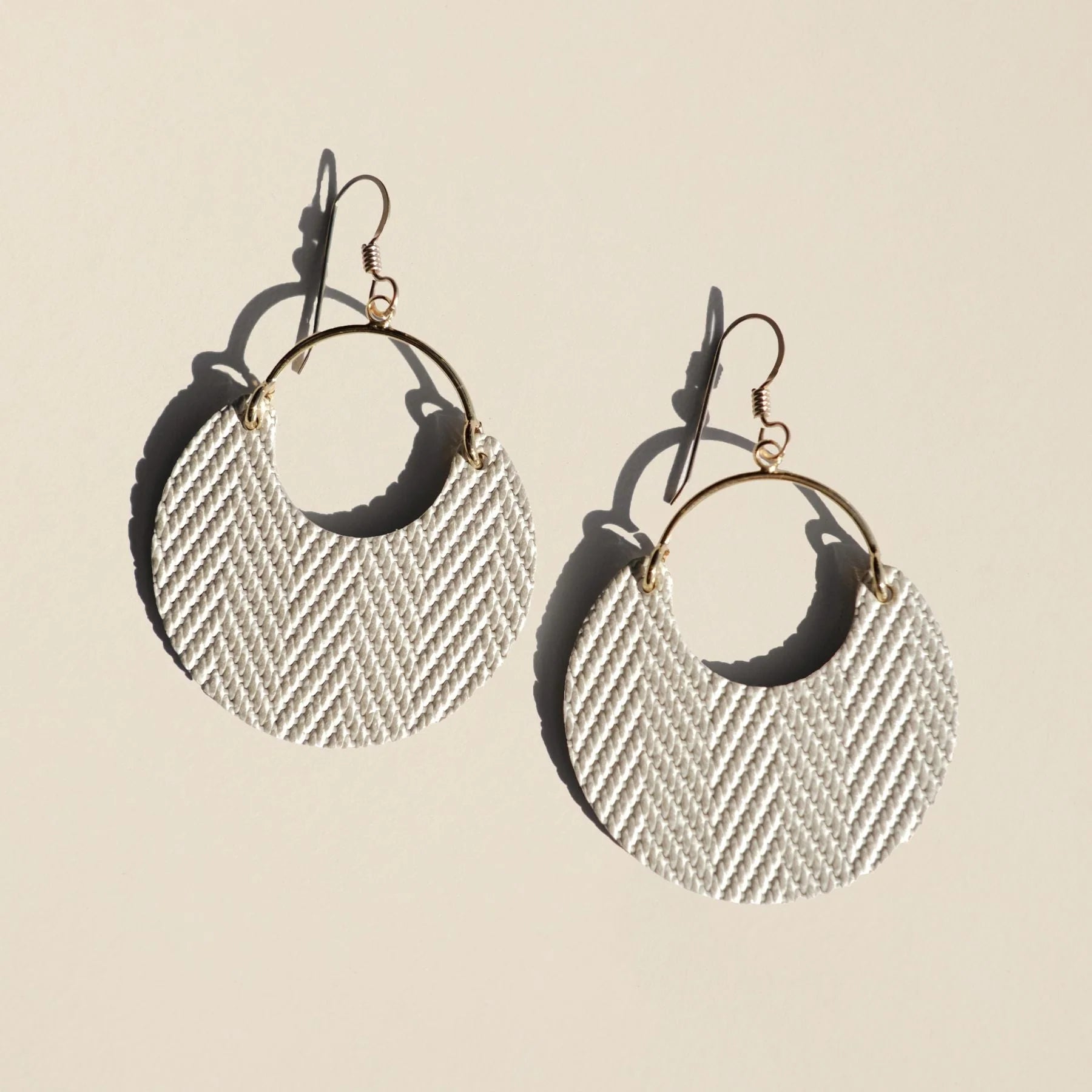 The Ninas are a fresh take on the rounded crescent shape. This leather earring style is made with our textured ivory Soft Pearl leather, and available on gold and silver hardware.