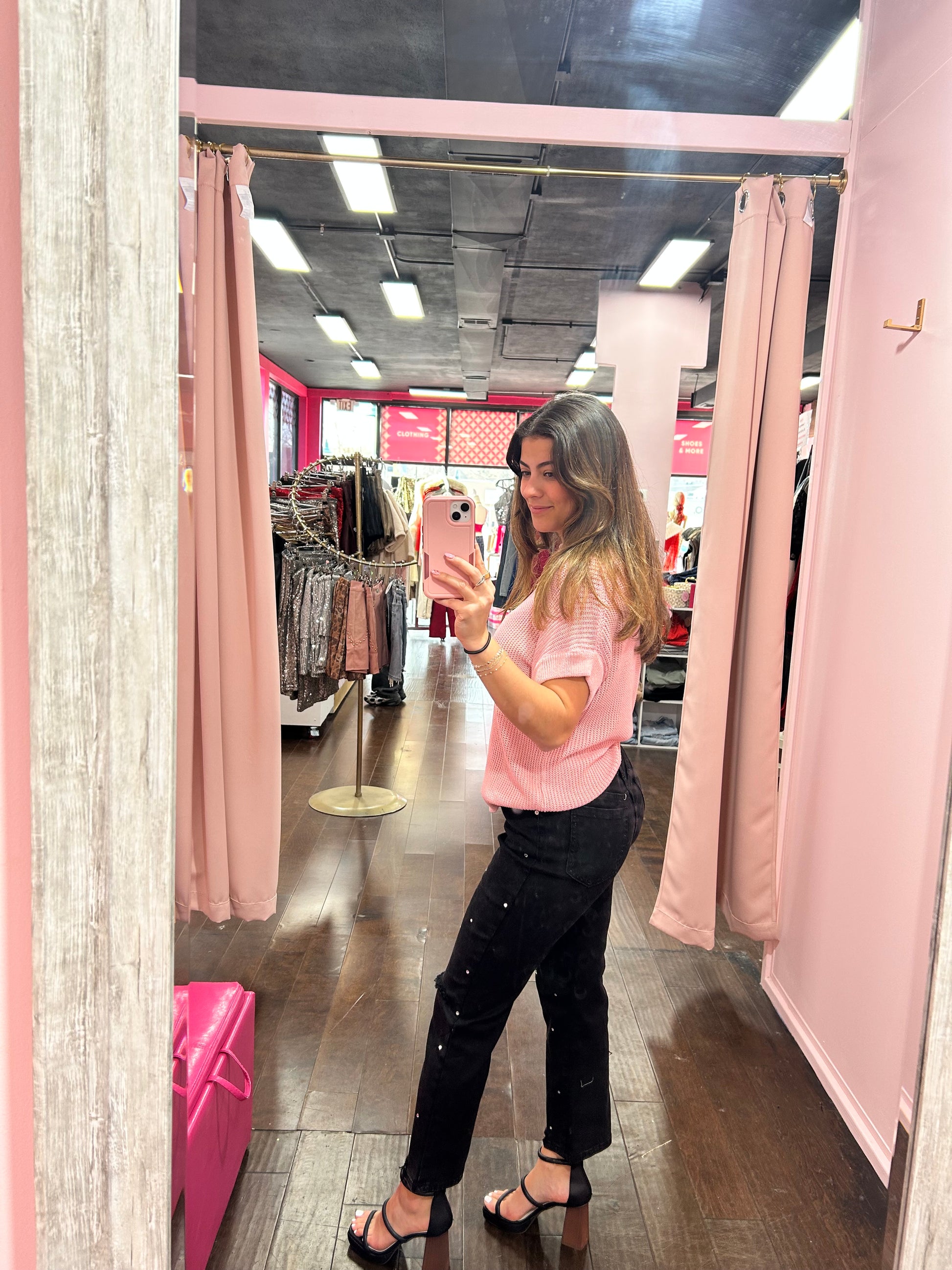 Style them with a soft knit or simple tee for an easy daytime look, or pair with a silky blouse and heels for a night out. Add a blazer for a chic contrast, or keep it playful with a cropped sweater and statement earrings. These jeans love neutral tops, but they’re also stunning with other pinks for a monochrome moment.