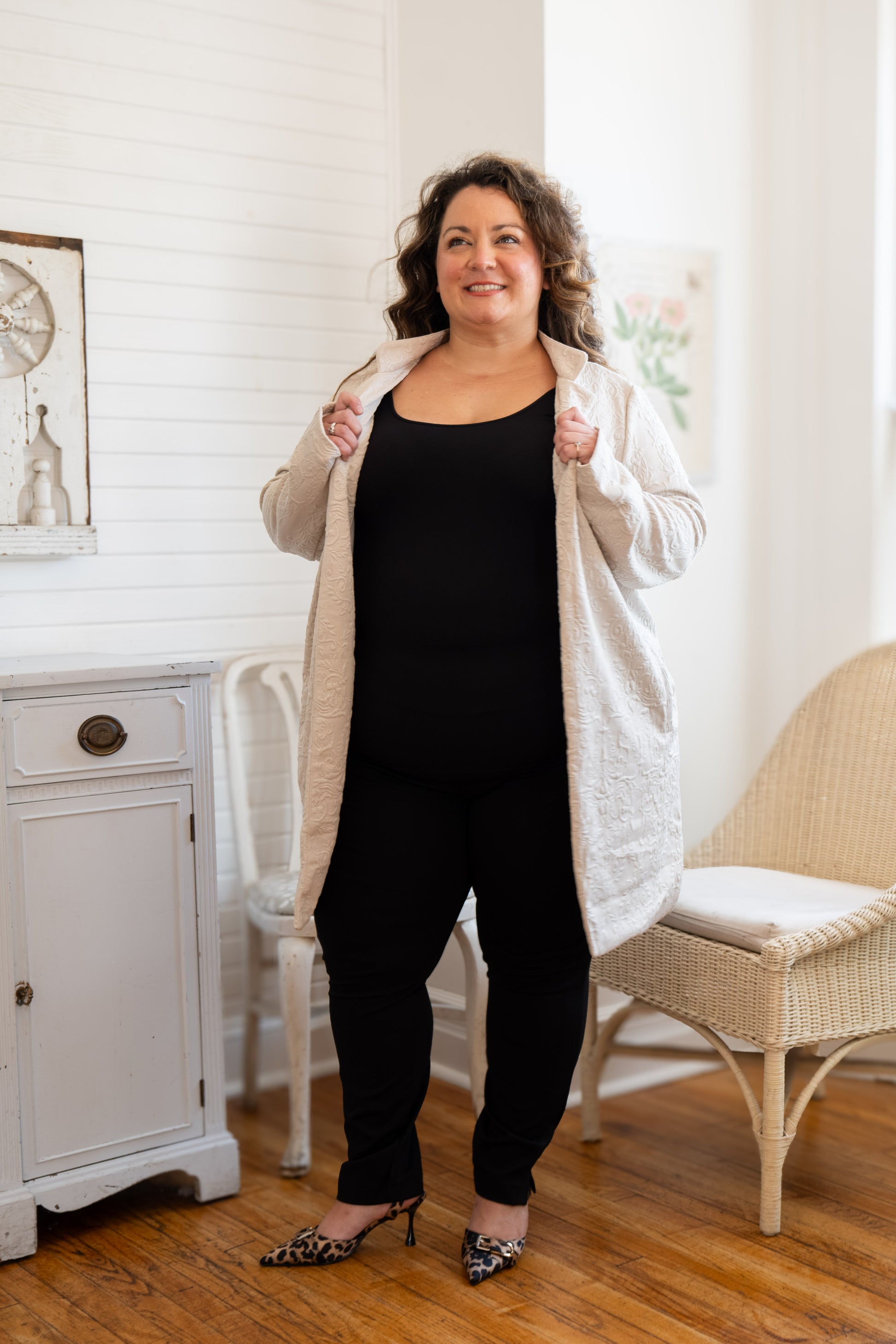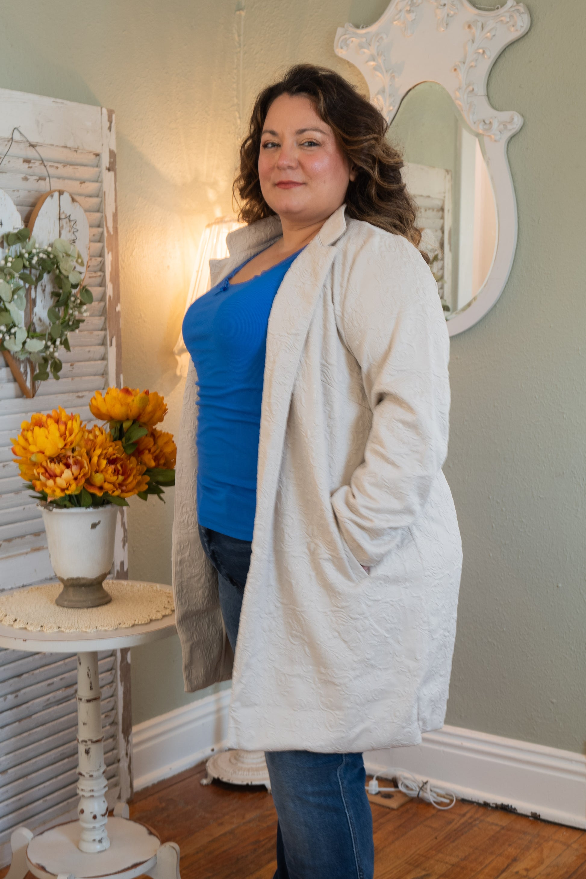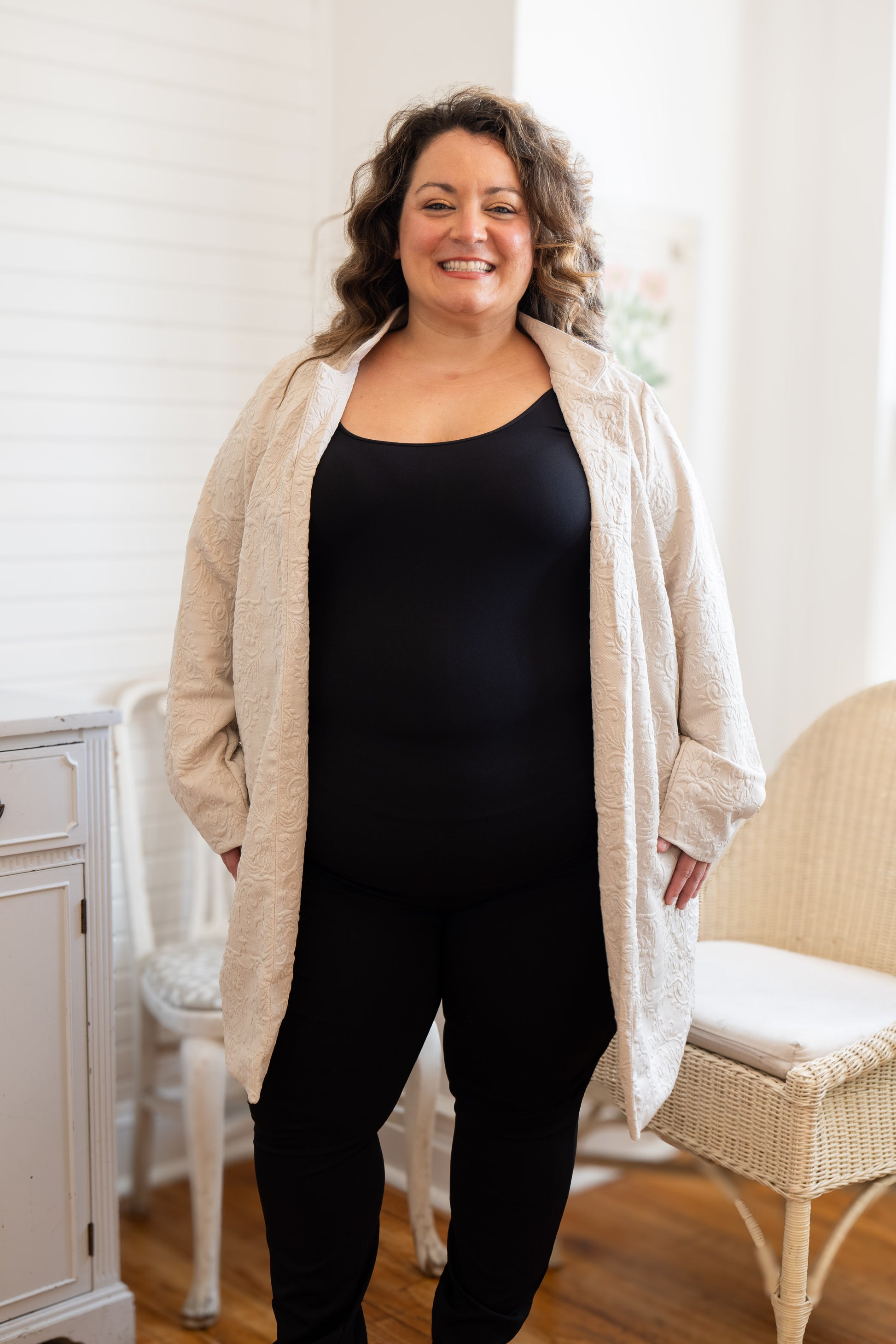 A cozy layer with elevated texture. This oatmeal-toned coat features a beautiful allover embossed pattern that adds dimension without being over the top. The mid-weight fabric drapes effortlessly and feels like a soft hug — structured enough to pull a look together, but relaxed enough for everyday wear. Designed with roomy front pockets and an open front for easy layering.