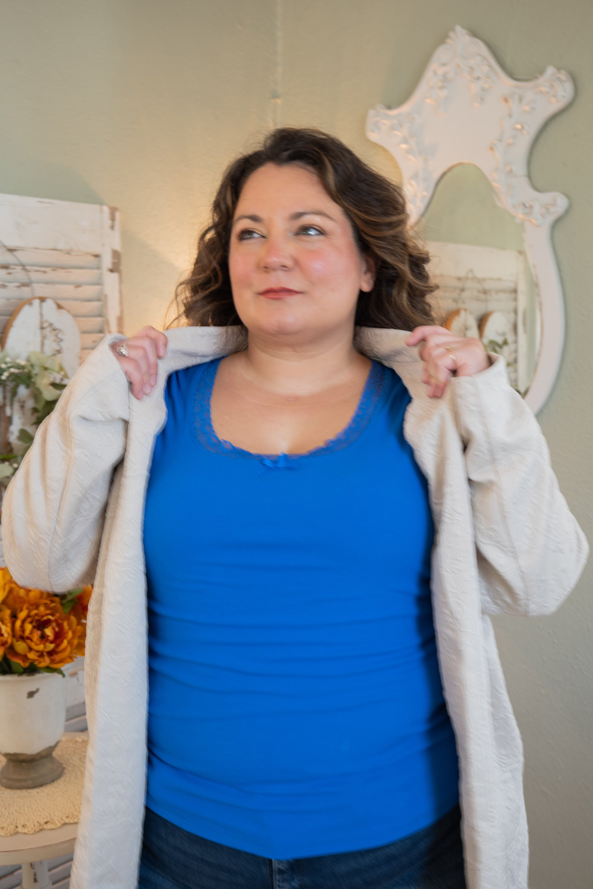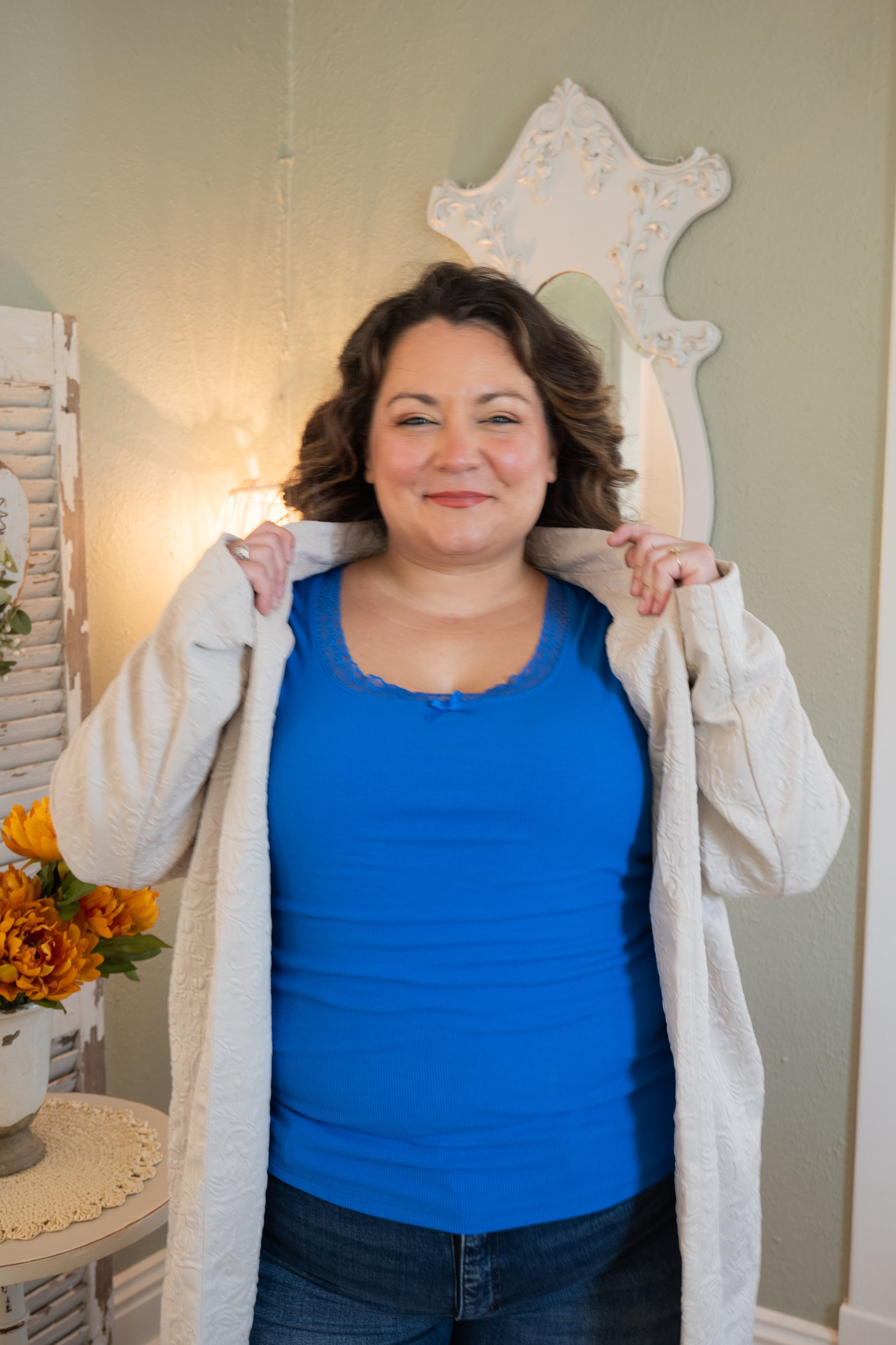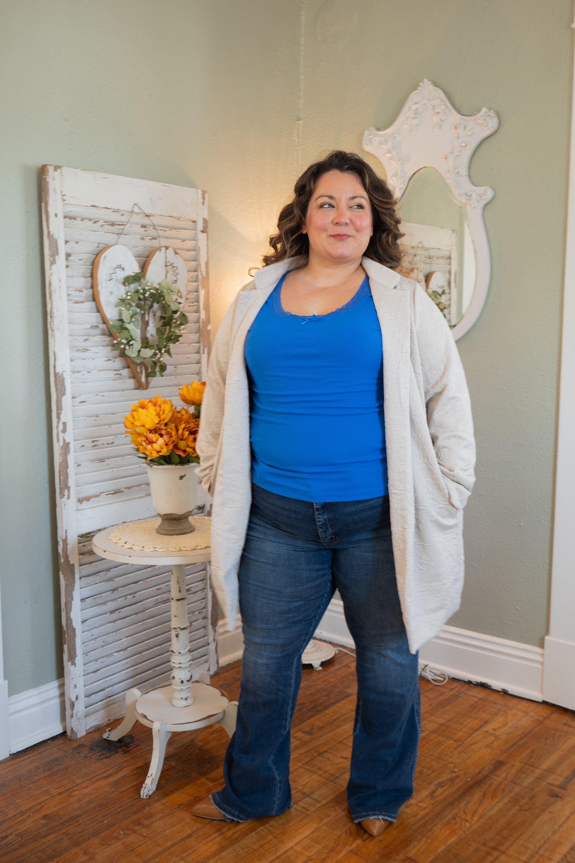 A cozy layer with elevated texture. This oatmeal-toned coat features a beautiful allover embossed pattern that adds dimension without being over the top. The mid-weight fabric drapes effortlessly and feels like a soft hug — structured enough to pull a look together, but relaxed enough for everyday wear. Designed with roomy front pockets and an open front for easy layering.