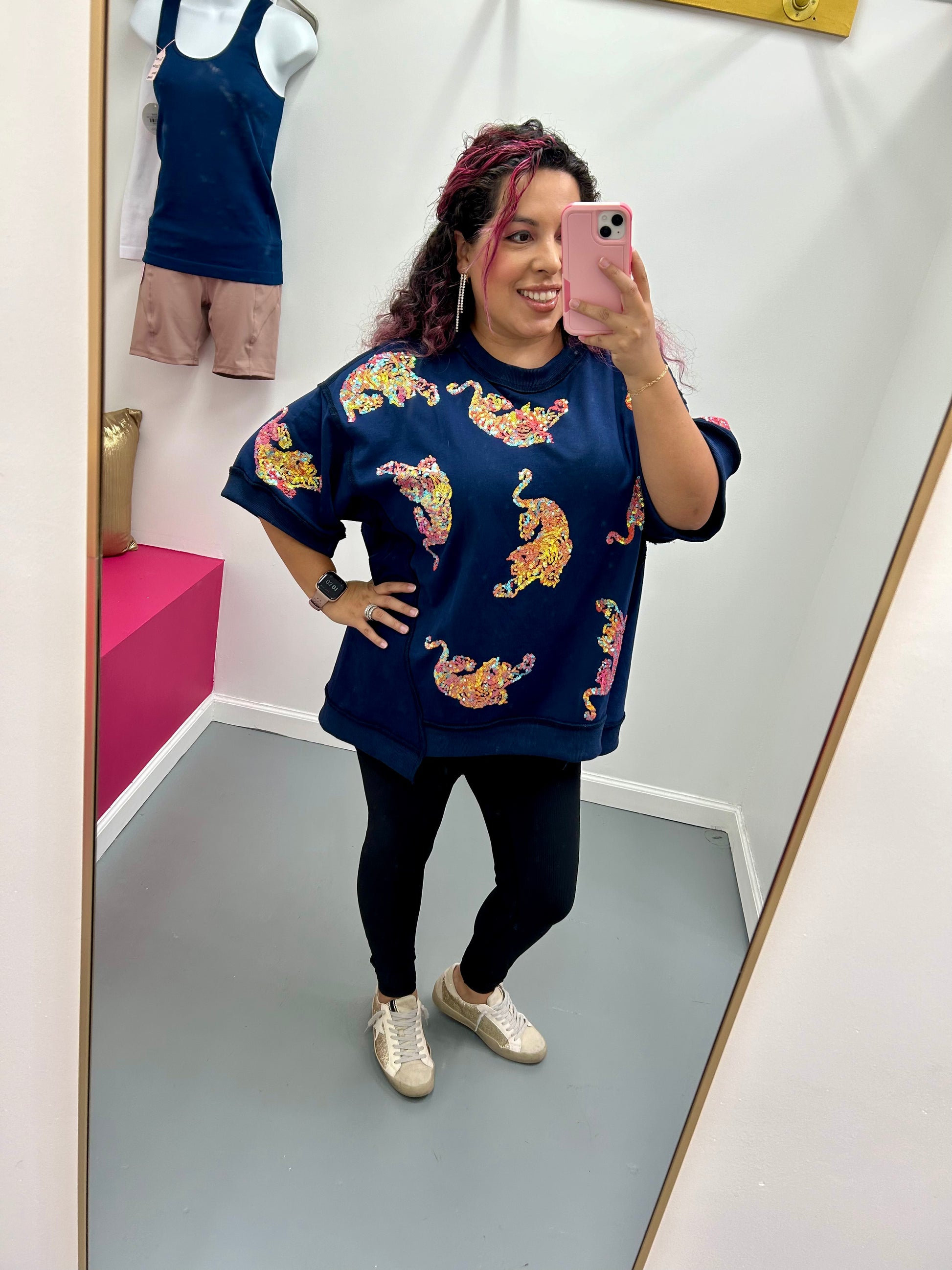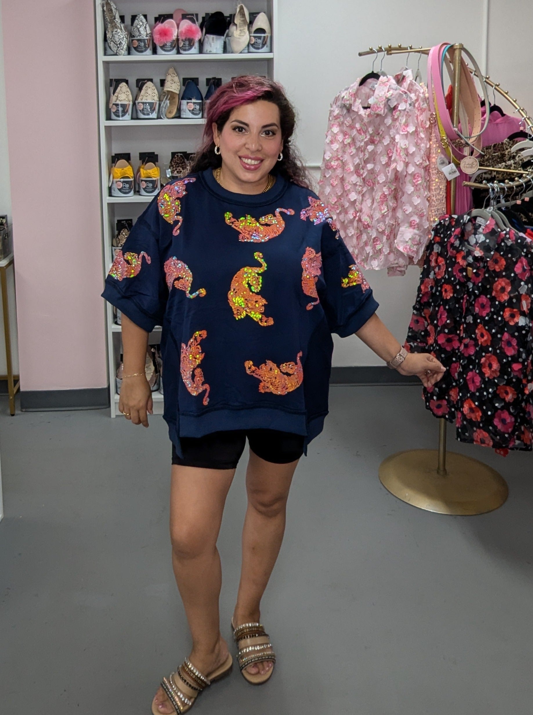 Unleash your wild side with our Tigers Sequins Top Navy. Featuring eye-catching sequin tiger embellishments, short sleeves, and flattering out-seam details. The asymmetric high-low cut adds a touch of edgy style. Made with 100% cotton for ultimate comfort. Roar!