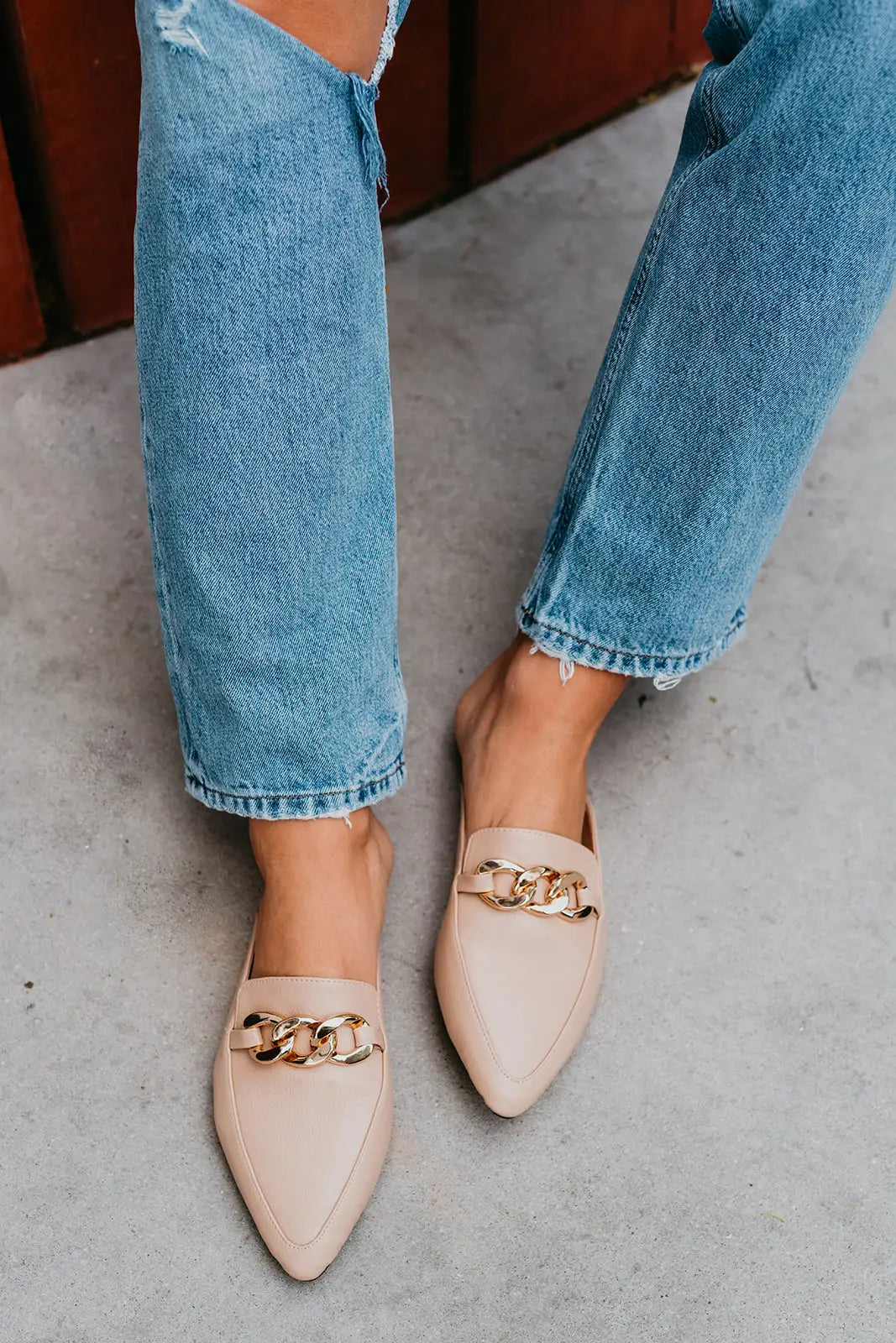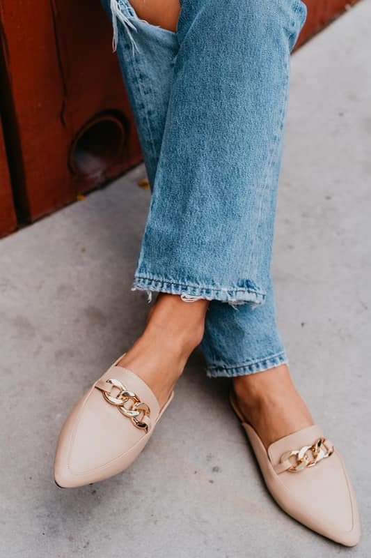 This classic caramel mule gets a sleek update! This is an easy slip-on backless style, a versatile style suitable for everyday ease as well as more dressed-up occasions. The timeless polished pointed toe and elegant gold chain detail completes this chic design.