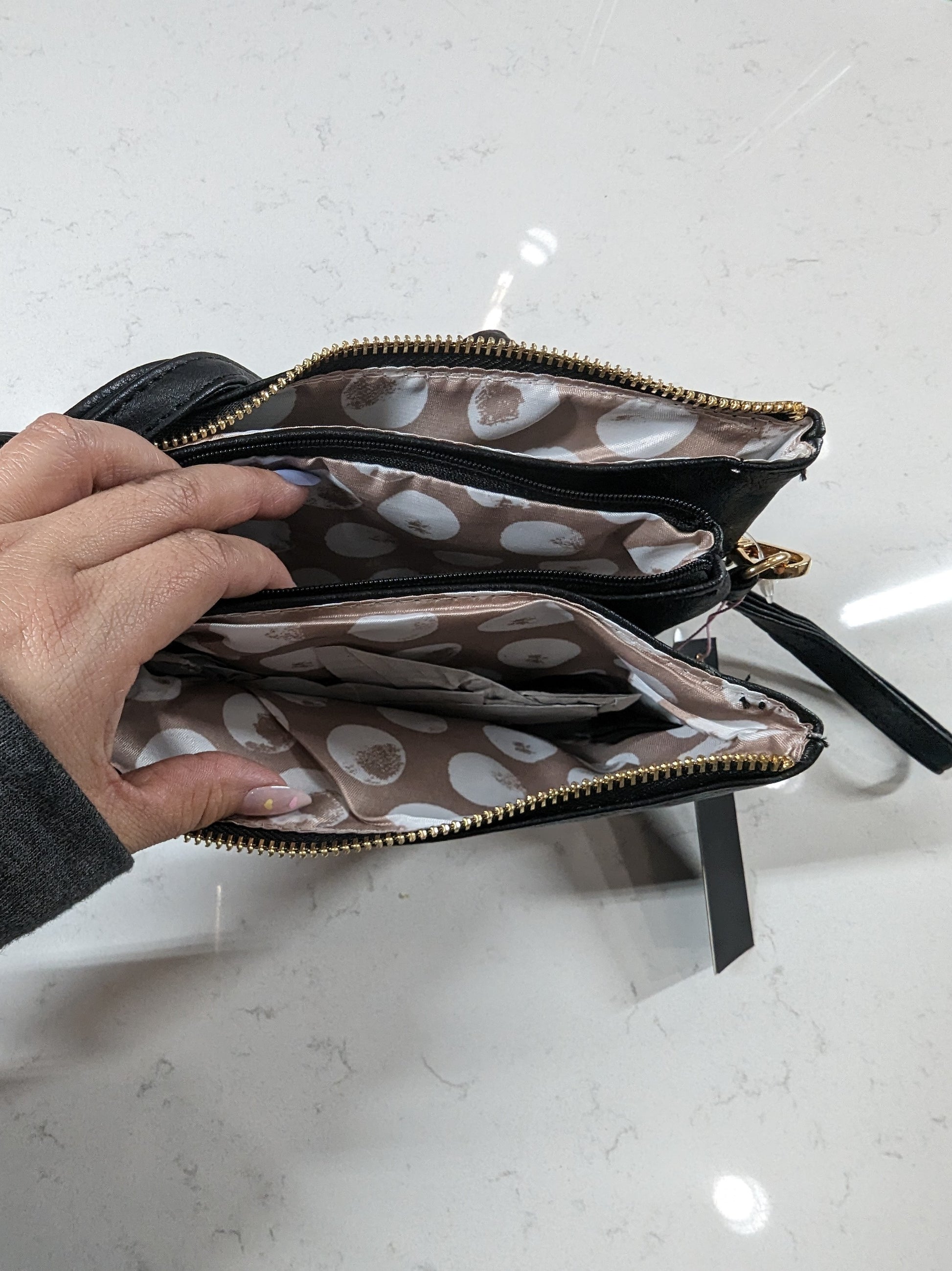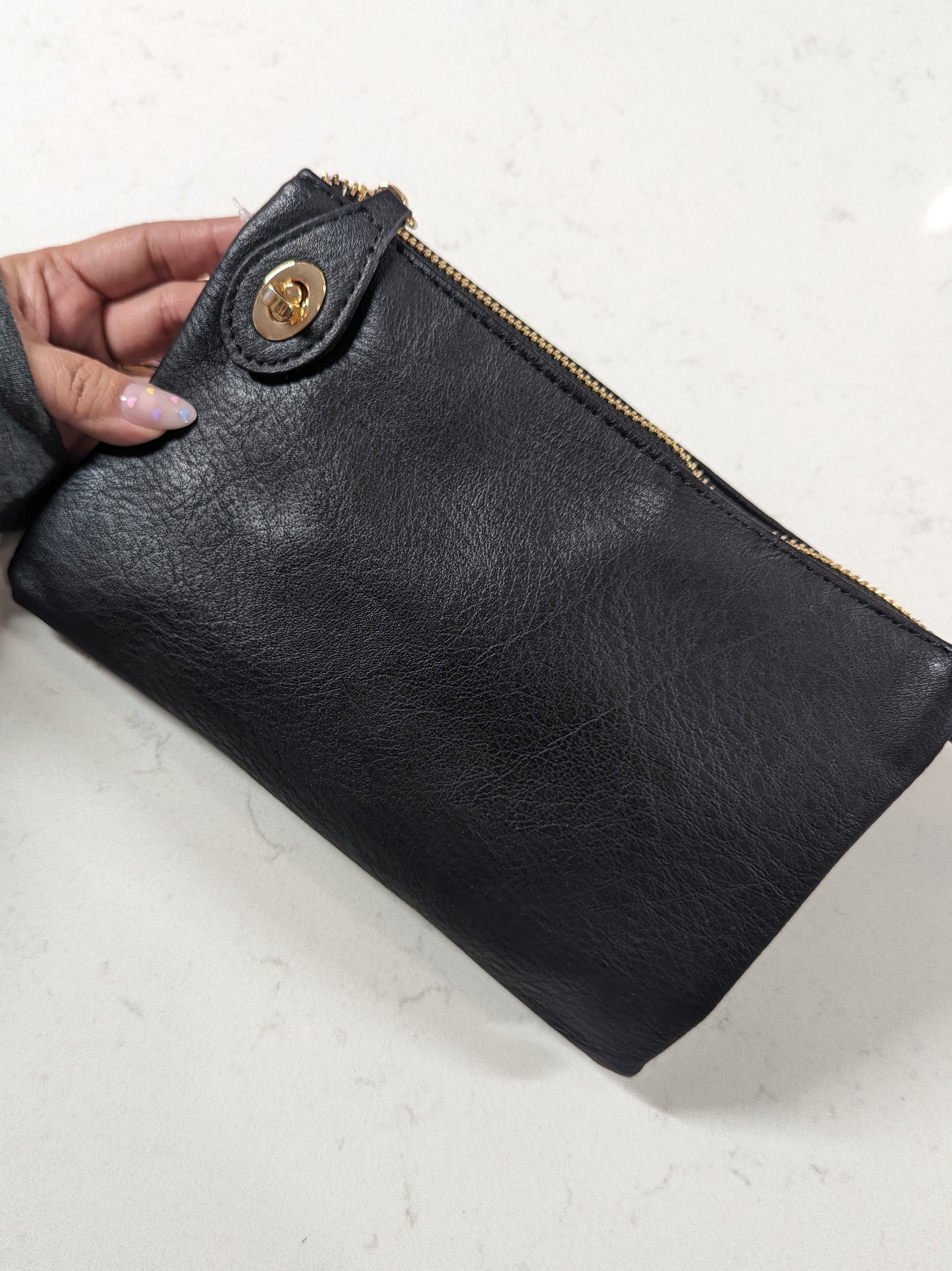 Get the best of both worlds with the Vegan Leather Clutch Twist Key - wear it as a crossbody or carry it as a clutch with the convenient wrist strap. With plenty of pockets and compartments, this small bag holds everything you need (and more!). Versatile, practical, and stylish, this bag has got you covered! The middle compartment has card slots.