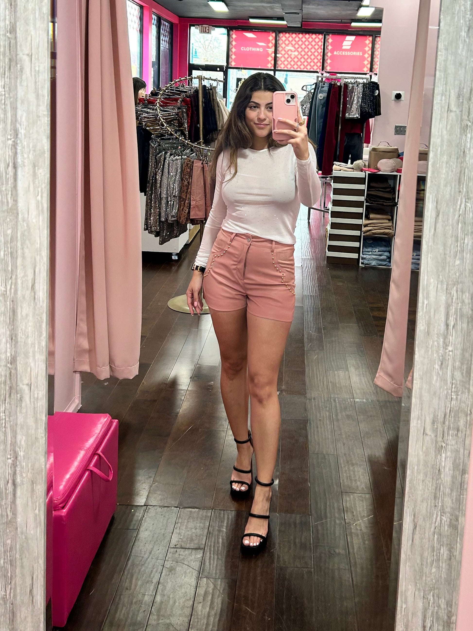 Cute, confident, and just the right amount of edgy — the Vegan Leather Suede Shorts in Blush are here to shake up your everyday outfits. With their soft blush tone and subtle studded detailing, these shorts strike the perfect balance between playful and polished. They’re bold without being loud and feminine without feeling sweet, making them a standout piece you’ll love styling again and again.