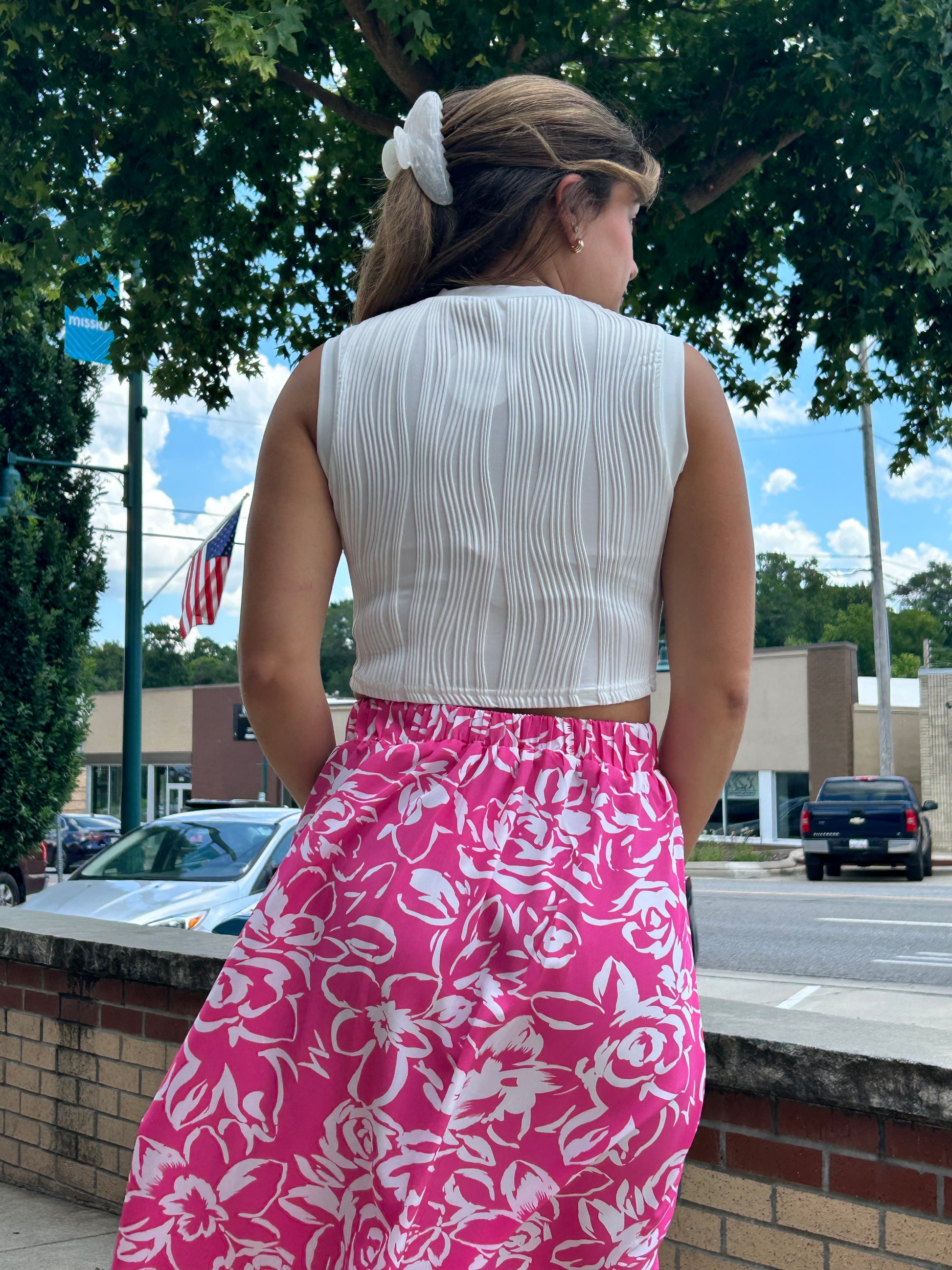 This white cropped tank features a charming wavy texture that adds a fun twist to your outfit. Perfectly versatile, it pairs effortlessly with your favorite jeans for a casual day out or layers smoothly under a blazer for a stylish office look. Embrace comfort and style with this playful wardrobe essential!